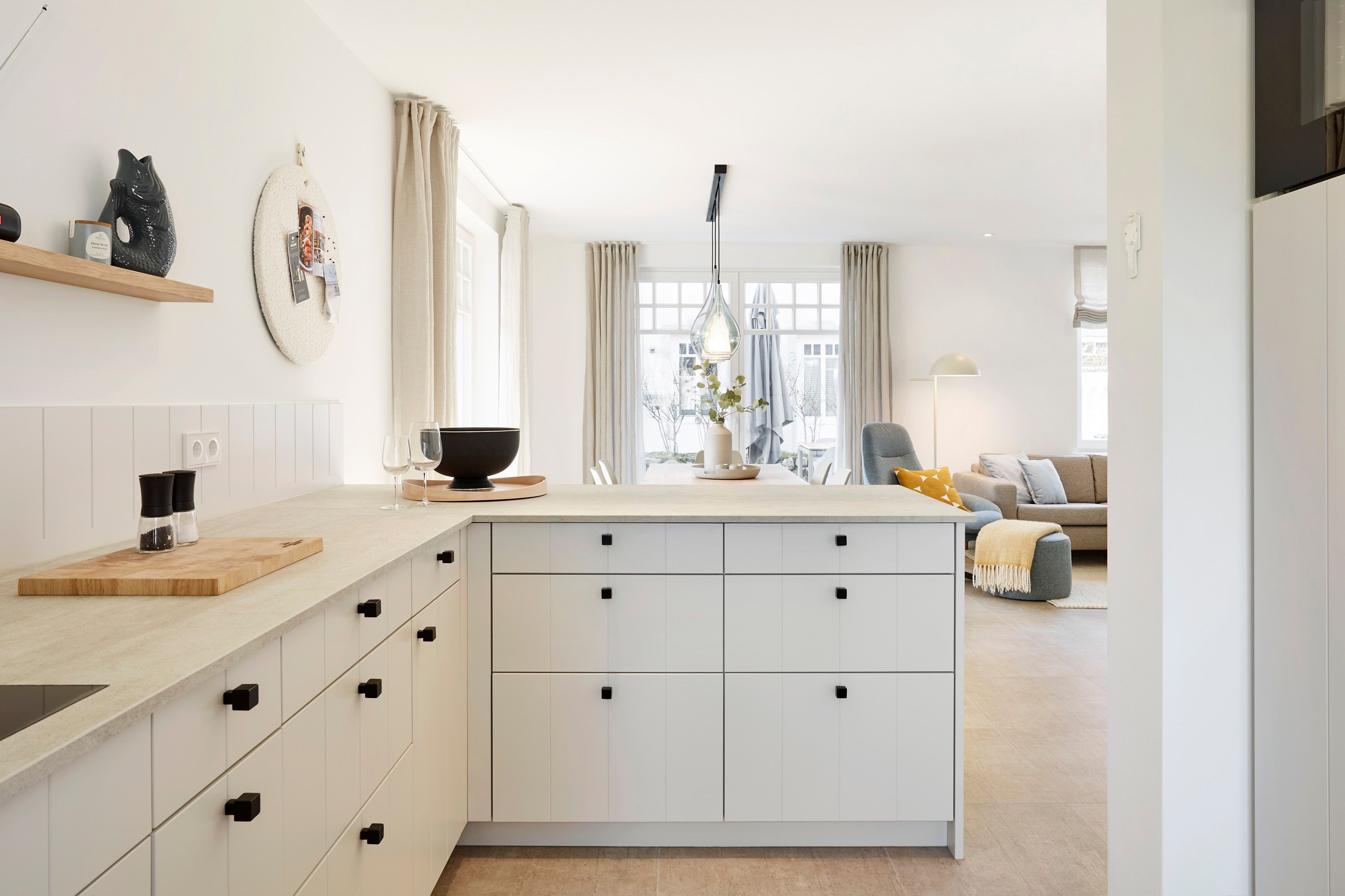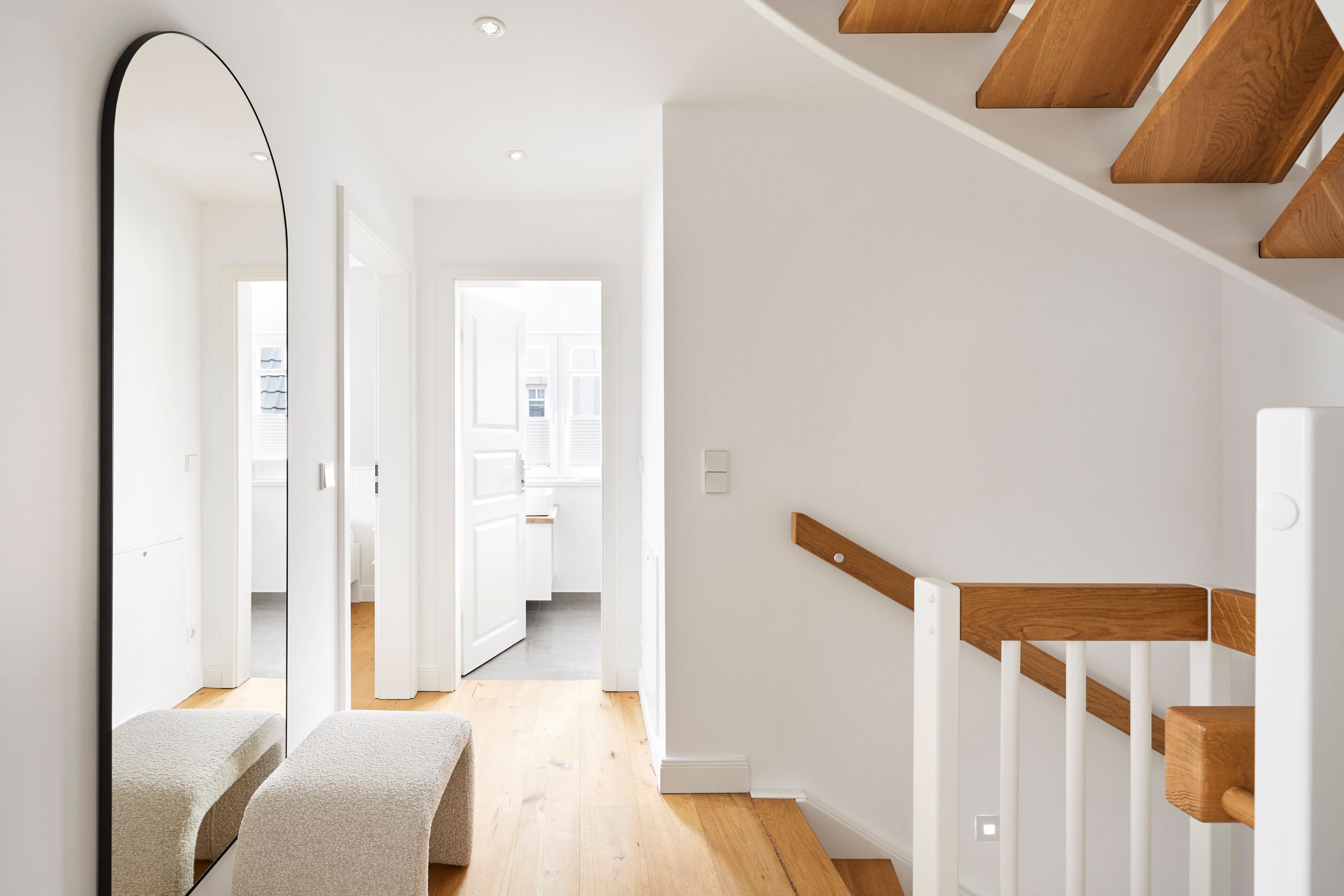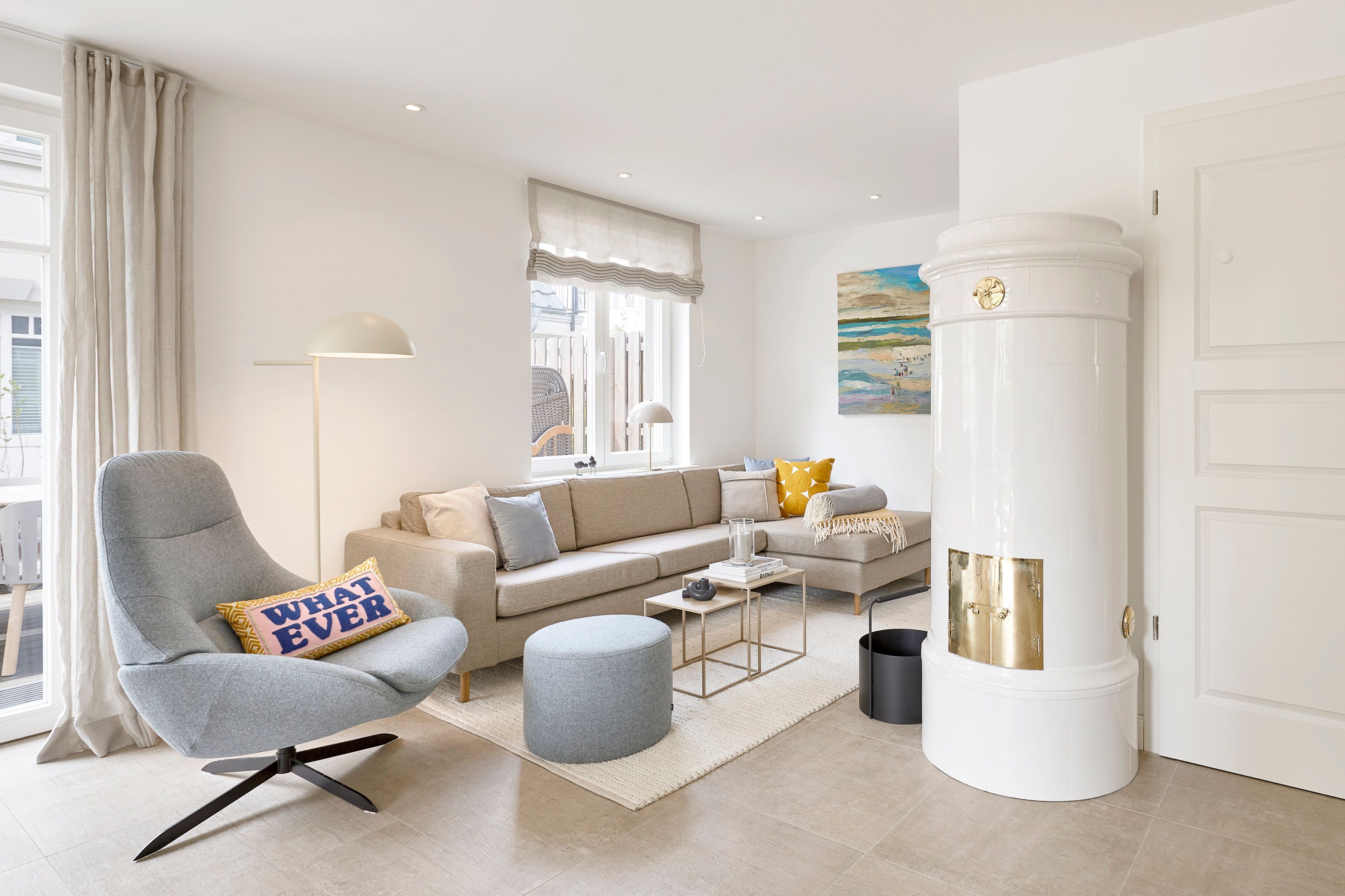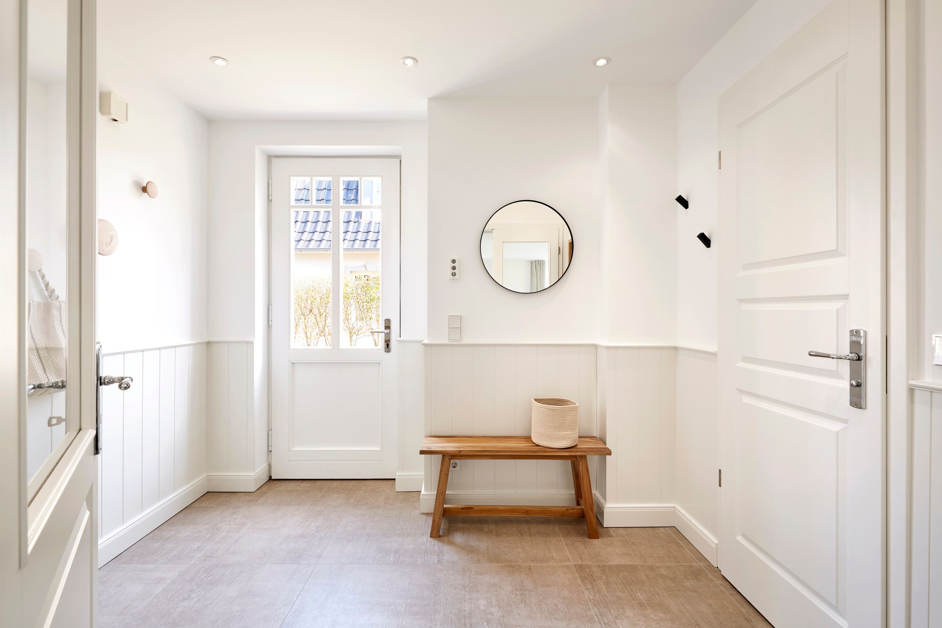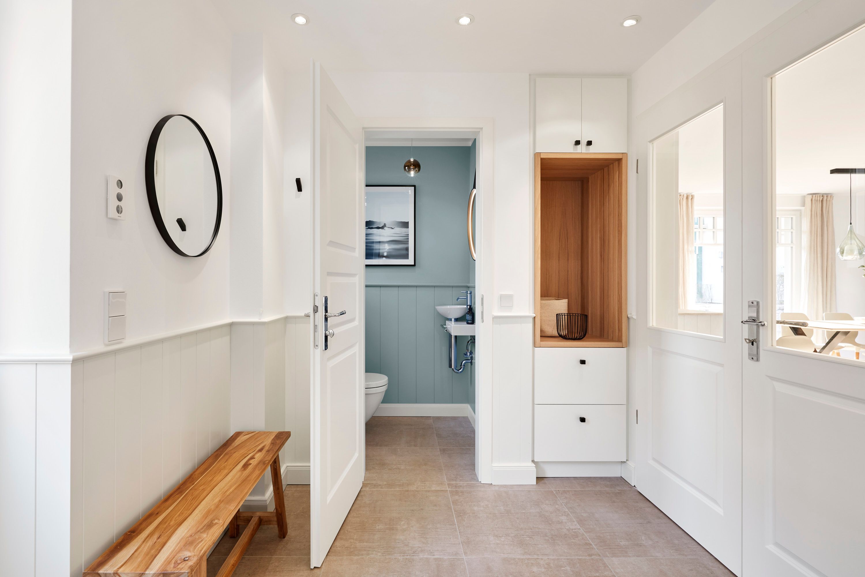 Beim Betreten empfängt Sie ein heller uns geräumiger Windfang vom dem aus Sie direkt auch in das Gäste WC im Erdgeschoss gelangen. Durch eine Glastür betreten Sie den Wohn- Essbereich sowie die offene Küche. Alles ist in sanften Farben mit moderner Gemütlichkeit und Design Highlights sehr stimmig eingerichtet. Ein Mylin Kamin im Wohnbereich bereit im Herbst eine wohlige Atmosphäre.