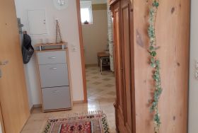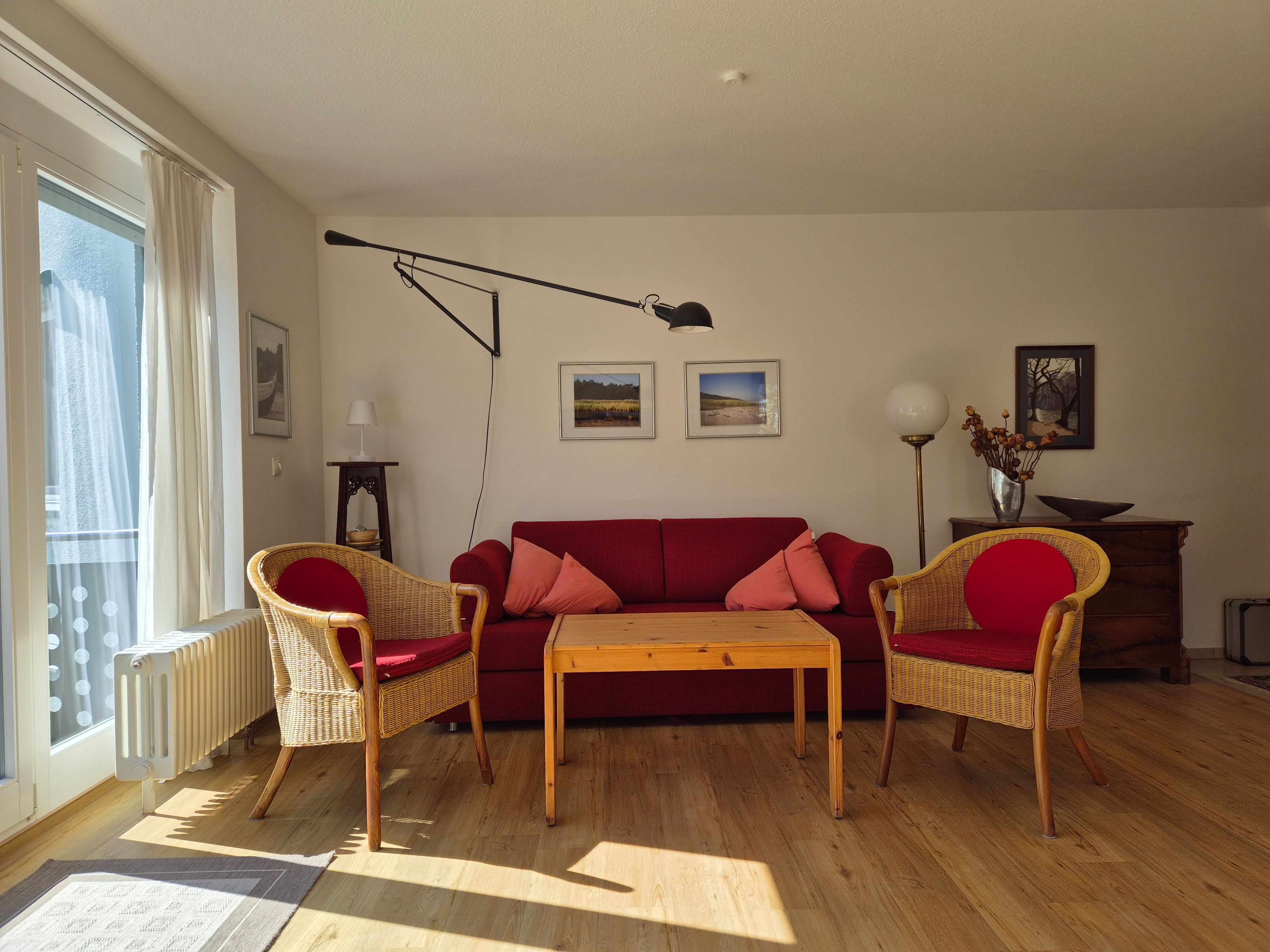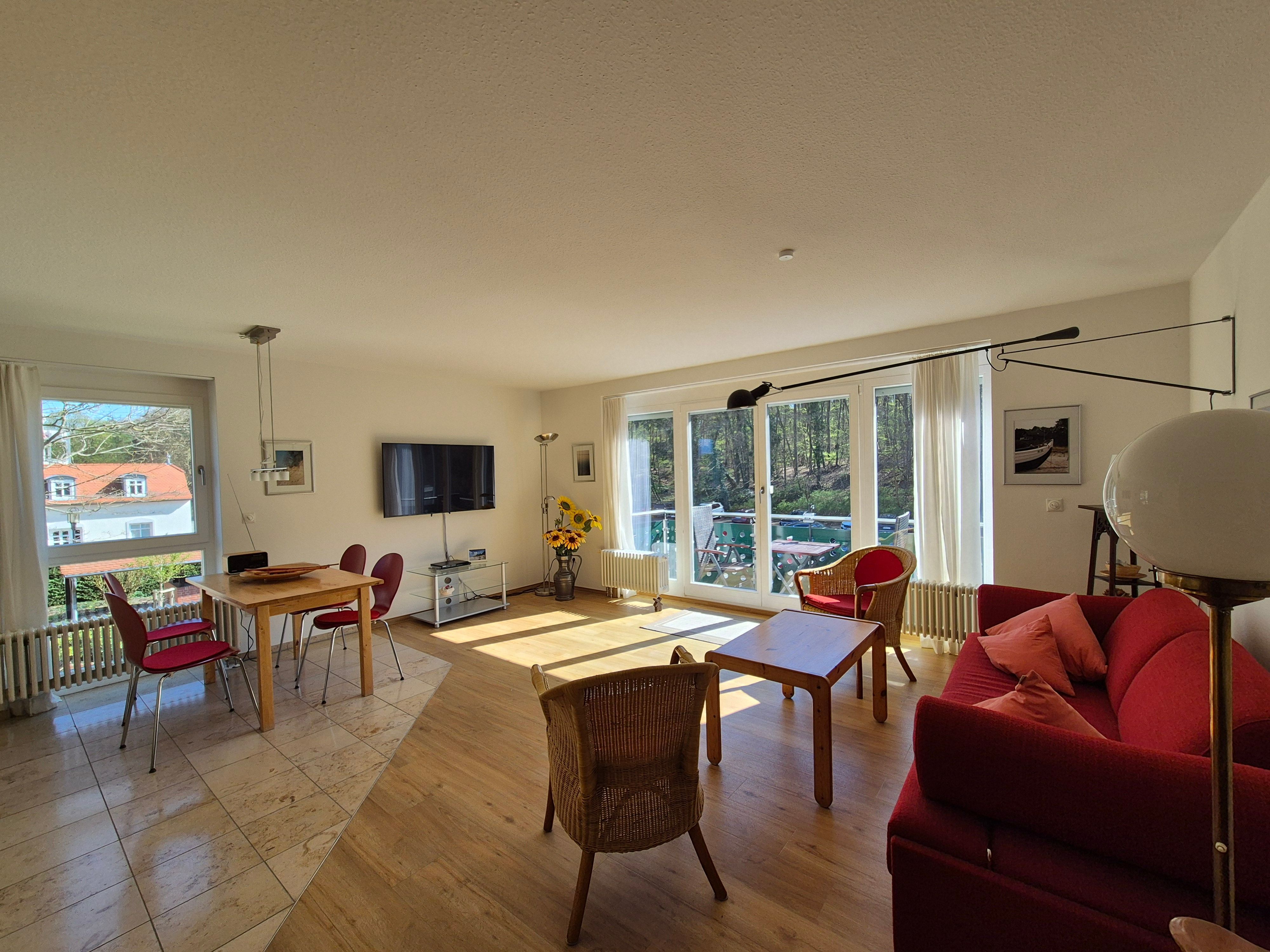 Die individuell eingerichtete 57 qm große Wohnung verfügt über zwei getrennte Räume. Das Schlafzimmer ist mit einem großen Doppelbett mit guten Matratzen (Härtegrad 3) ausgestattet und lädt mit seinen wunderbaren Holzmöbeln zum Entspannen und Ausruhen ein. Die Matratzen wurden in diesem Jahr erneuert. Zu Beginn des Jahres wurden die Betten gereinigt. Im Schlafzimmer befindet sich ein stummer Diener. Im modern eingerichteten Wohnbereich befindet sich eine große integrierte Küchenzeile, in der u.a. eine Spülmaschine, eine Kaffeemaschine, ein Toaster, ein Wasserkocher, eine Mikrowelle, ein Kühlschrank mit Gefriermöglichkeit, ein Herd und zahlreiches Geschirr zu finden sind. Ein Radio, ein sehr großer an der Wand hängender Fernseher ( Kabelanschluss ) und zahlreiche Bücher - auch über Zinnowitz und die Insel - lassen die Zeit verfliegen.
