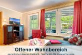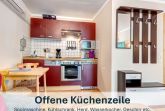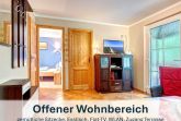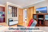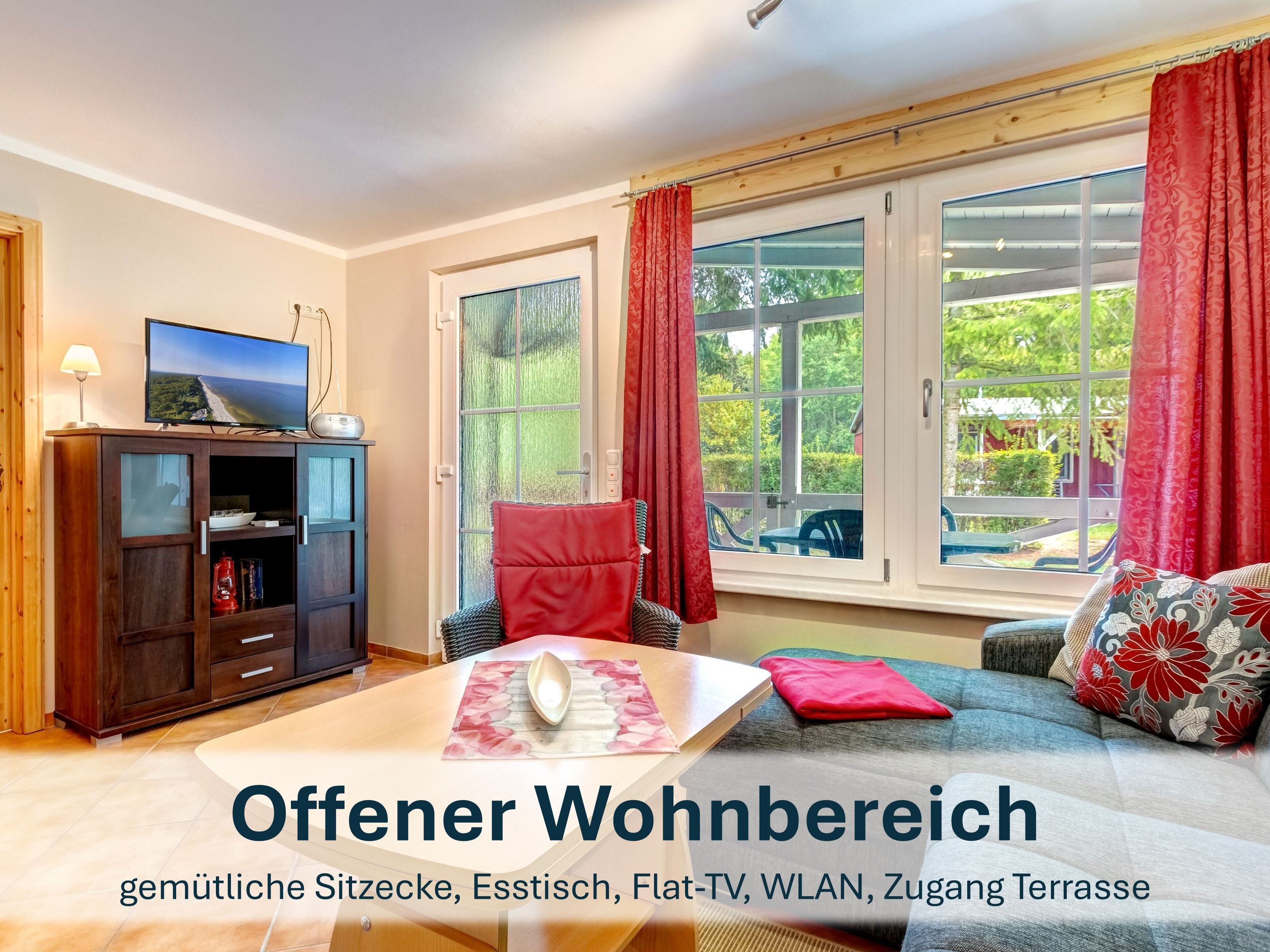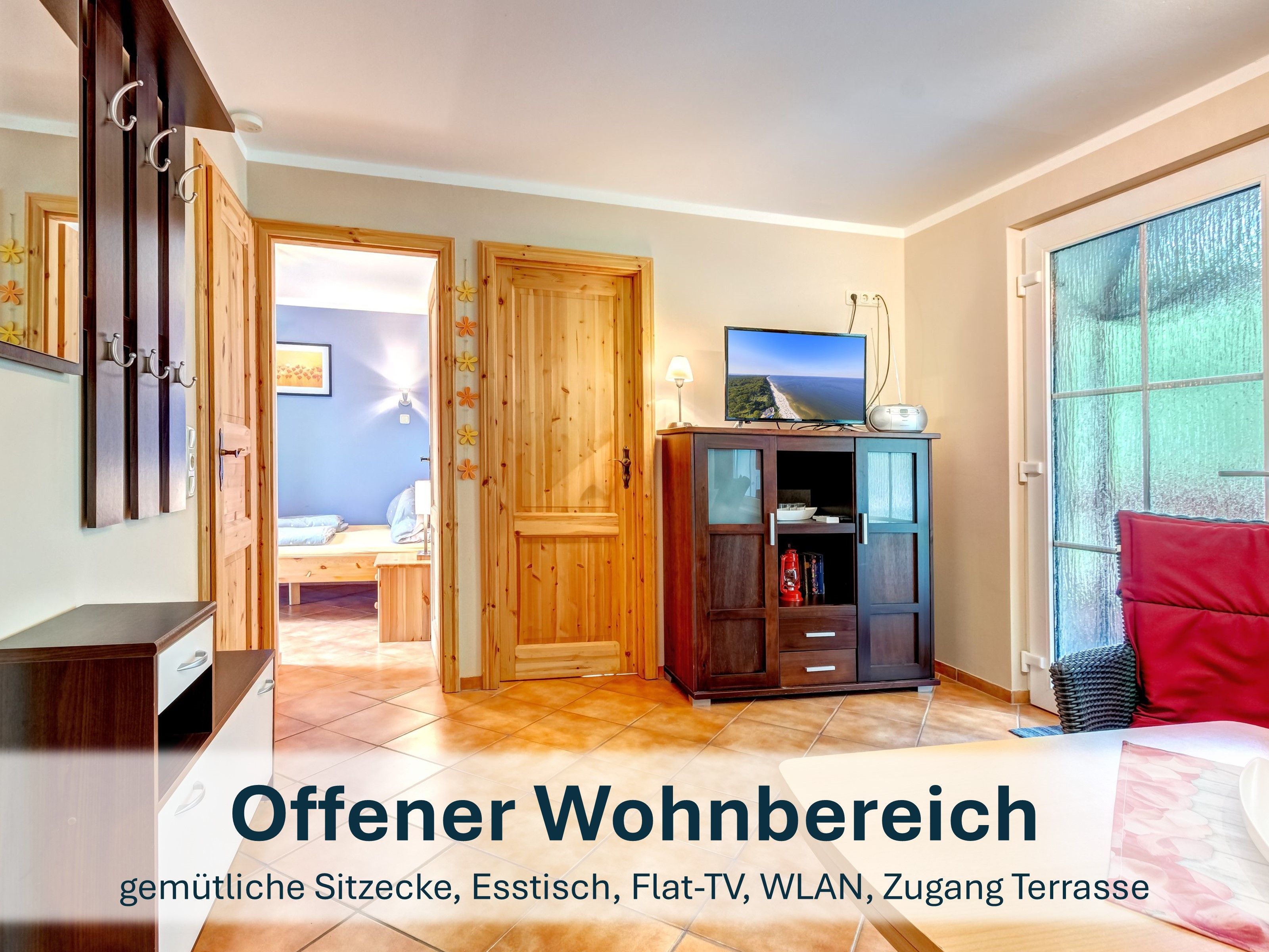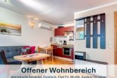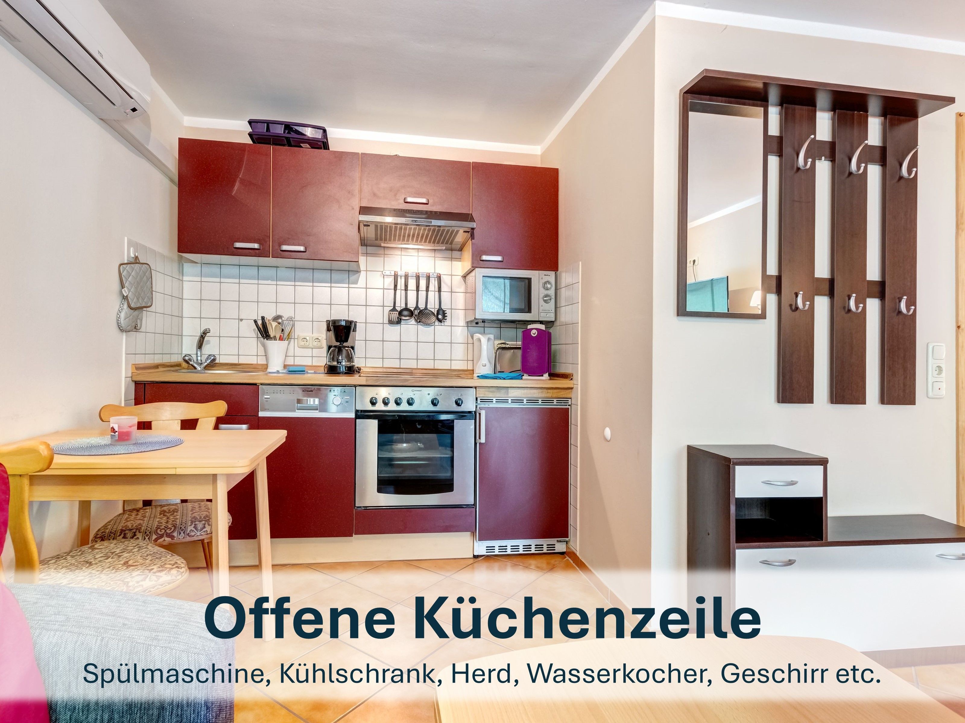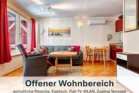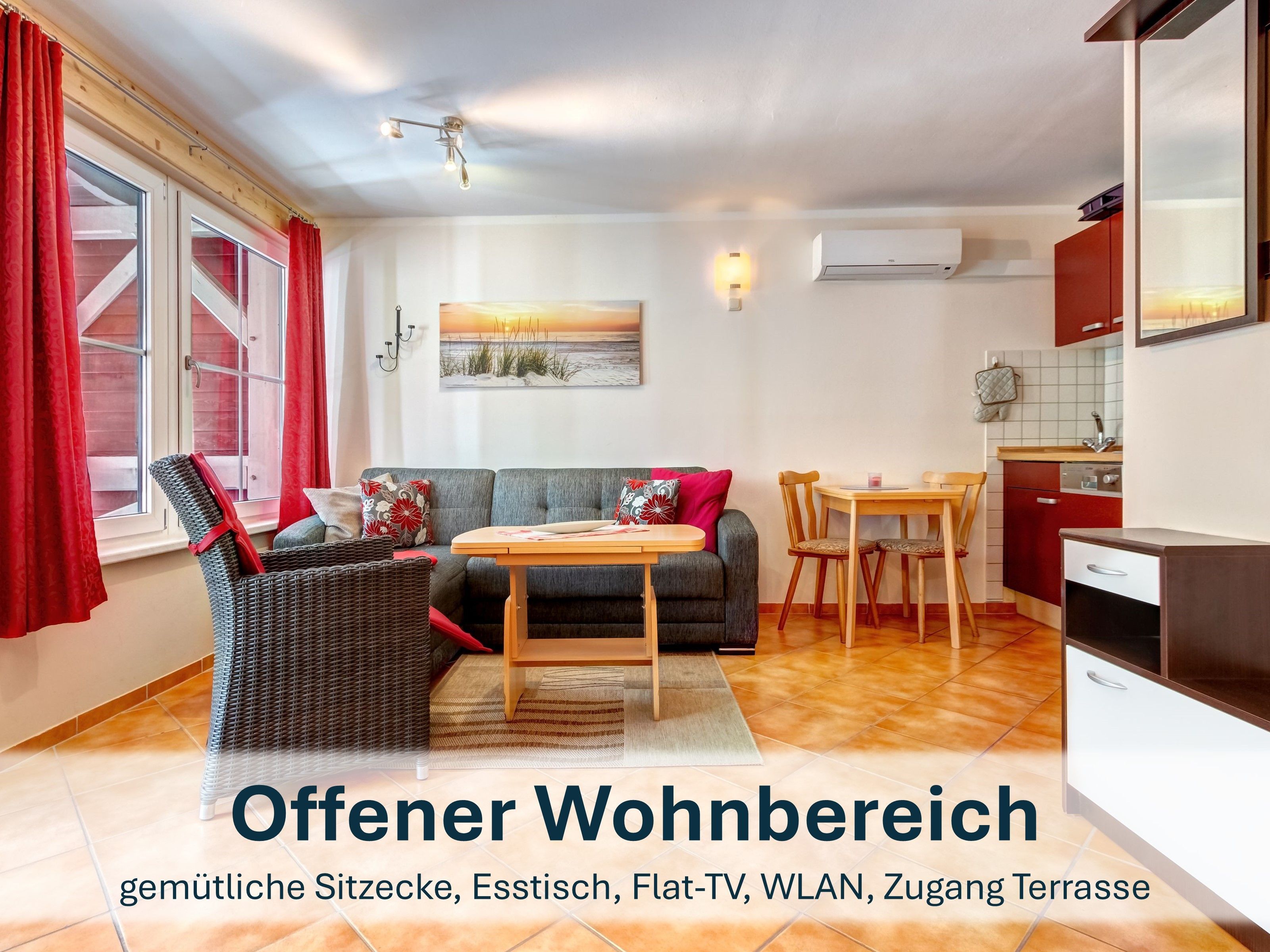 Der Wohnbereich zeichnet sich durch seine geschmackvolle Einrichtung mit Sofa, Tisch und Sessel und einem Regal mit TV und Radio aus. Vollendet wird das Bild durch einen mit als Garderobe nutzbaren Schrank. Daran schließt sich die voll ausgestattete, offene Küchenzeile an.