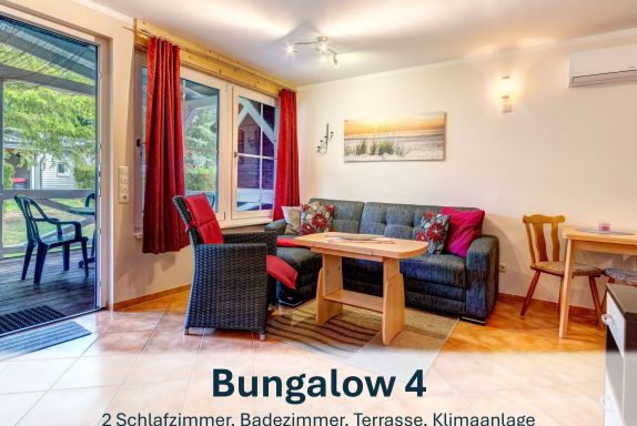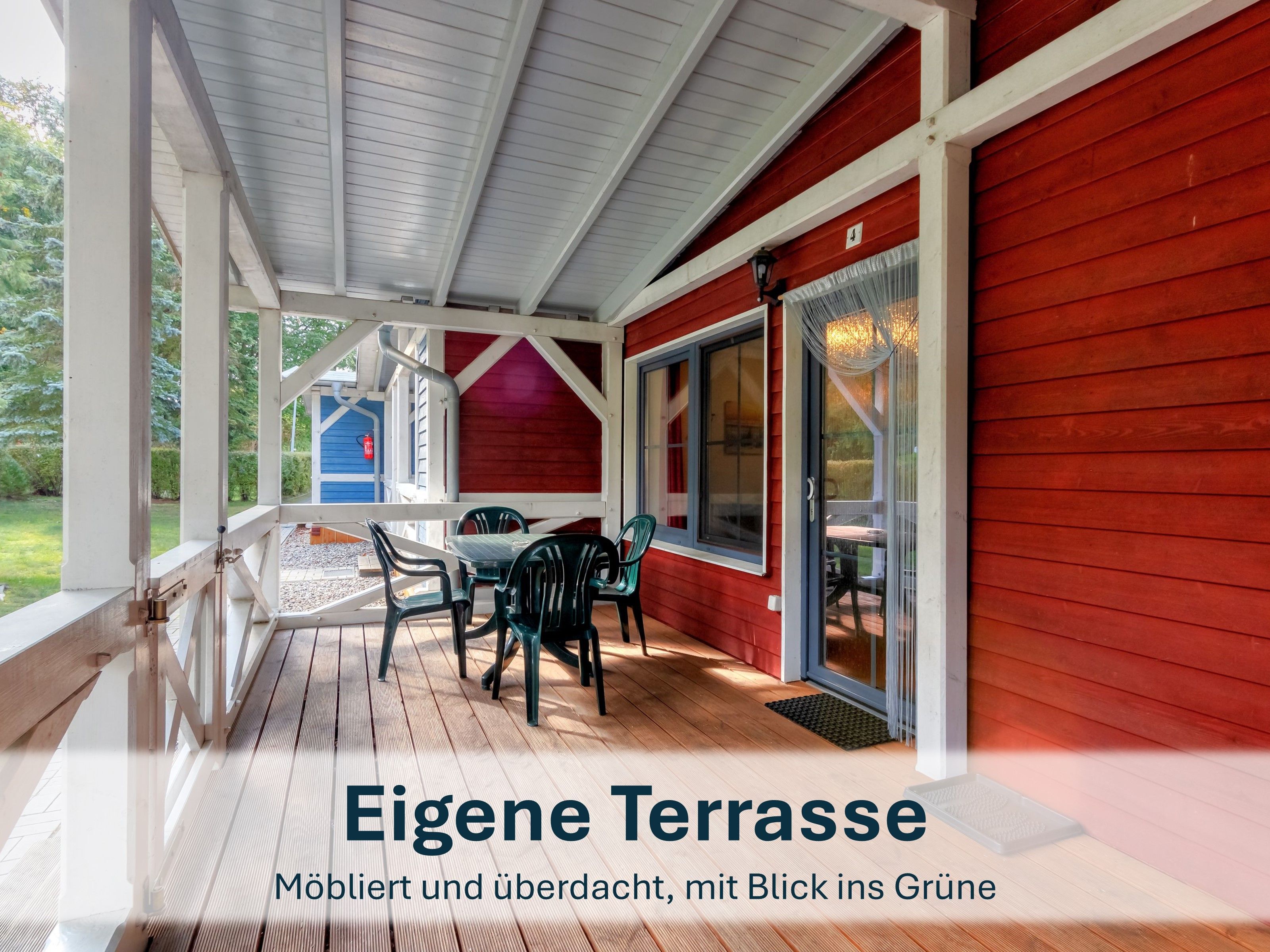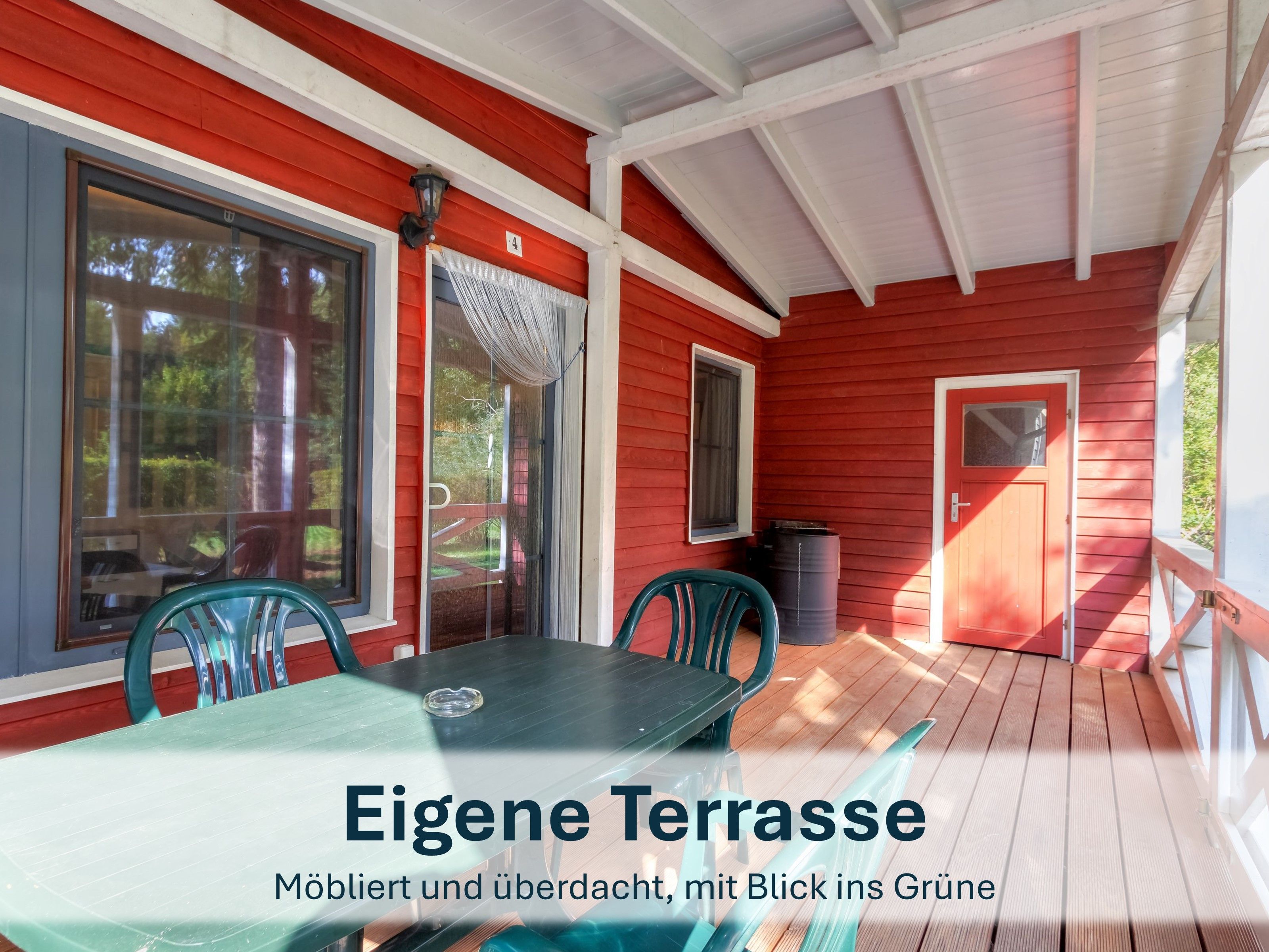 Jeder Bungalow verfügt über eine überdachte, möblierte Terrasse sowie einen abschließbaren Abstellraum.