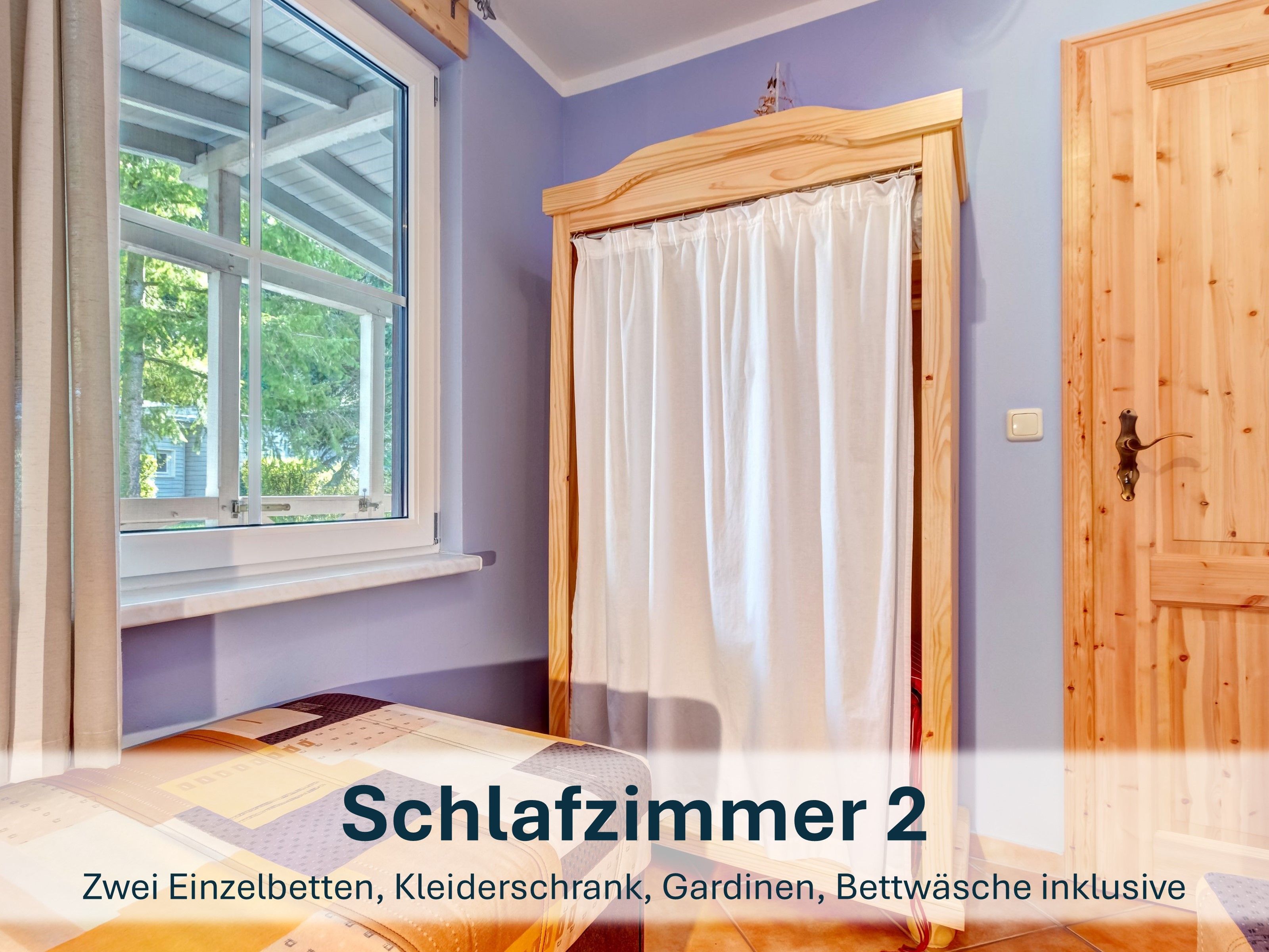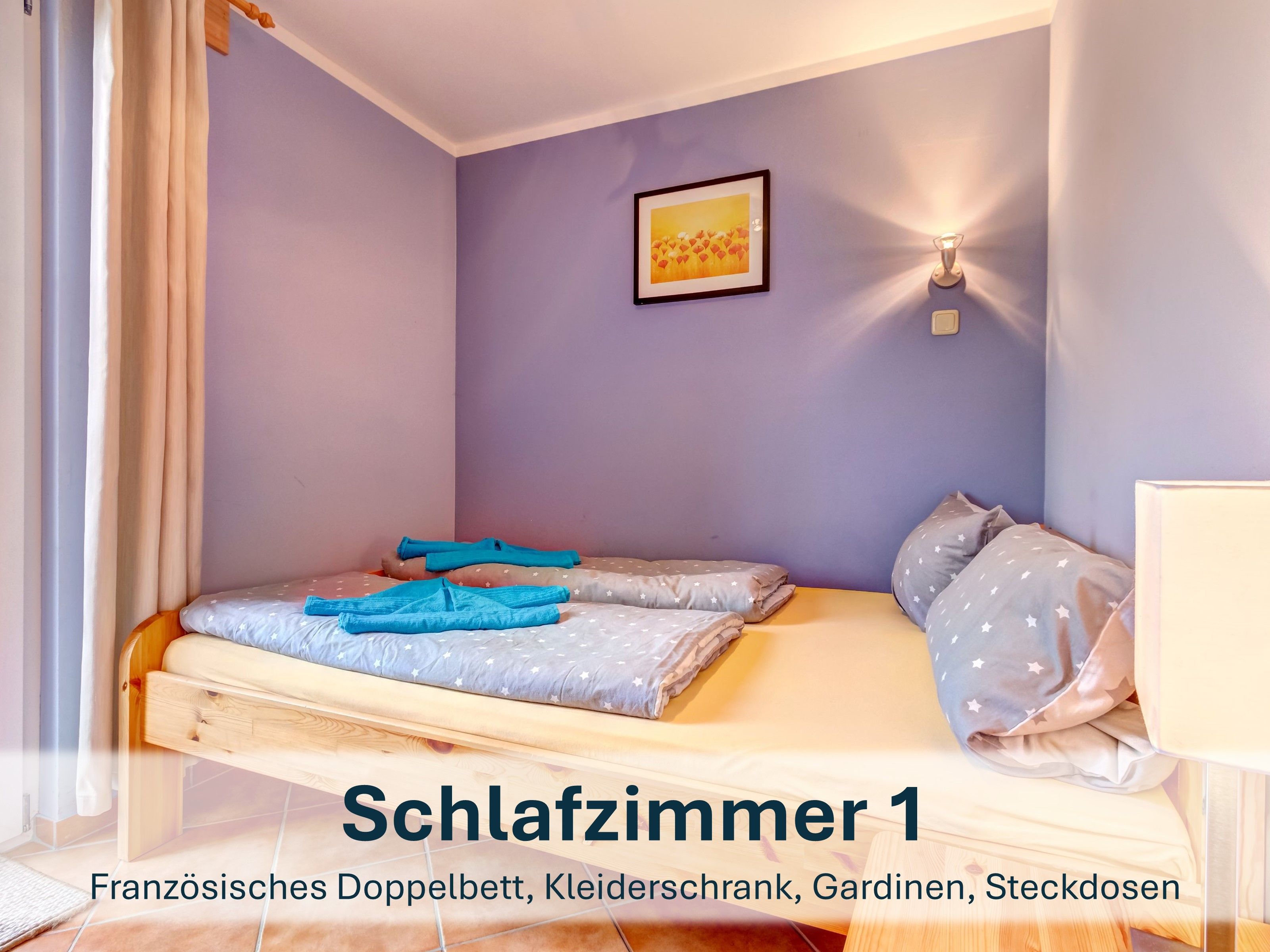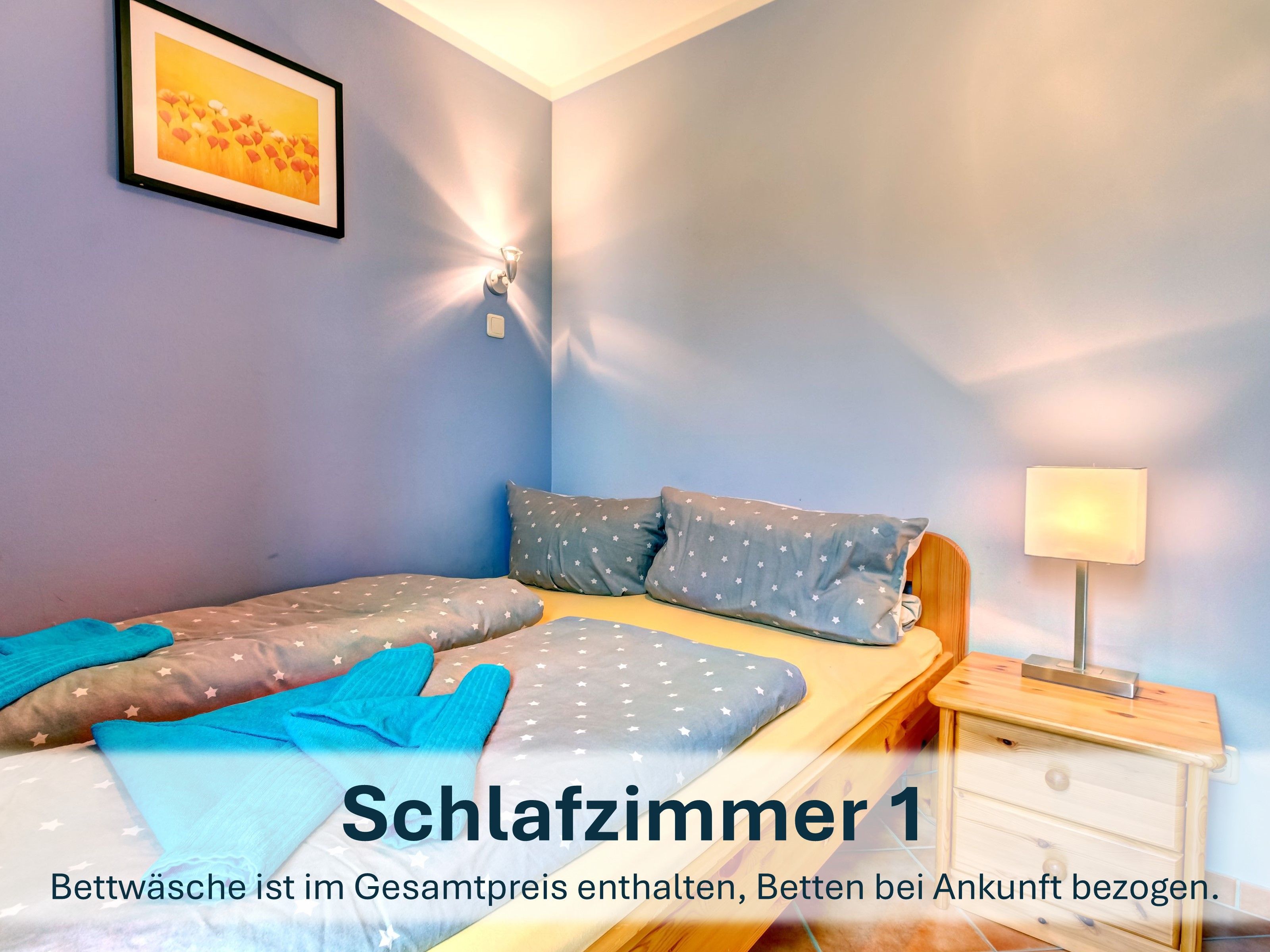 Außerdem findet man im Anschluss eine offene, gut ausgestattete Küche. Das erste Schlafzimmer ist mit einem Doppelbett (140cm Breite) ausgestattet, im zweiten befindet sich zwei Einzelbetten.
