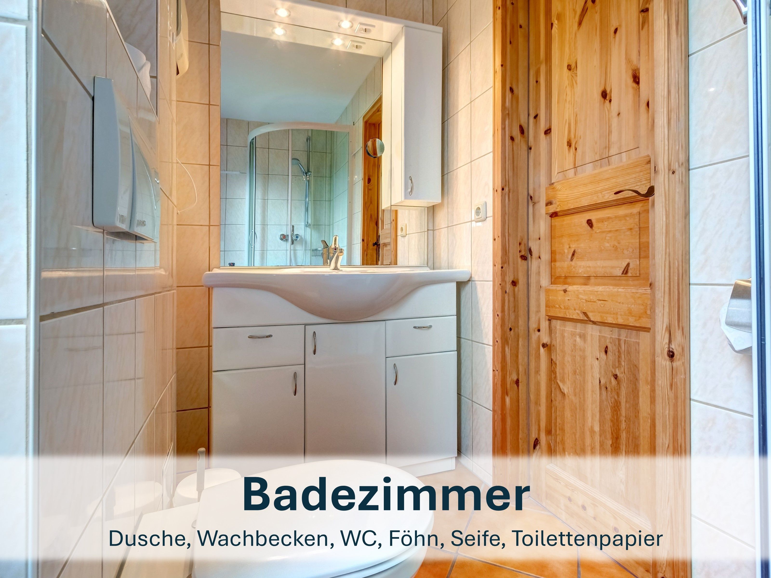 Ein kleines, zweckmäßig eingerichtetes Bad komplettiert den Bungalow. Sie finden dort eine Dusche, ein WC sowie ein Waschbecken mit Spiegelschrank und Regal.