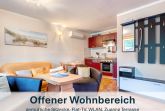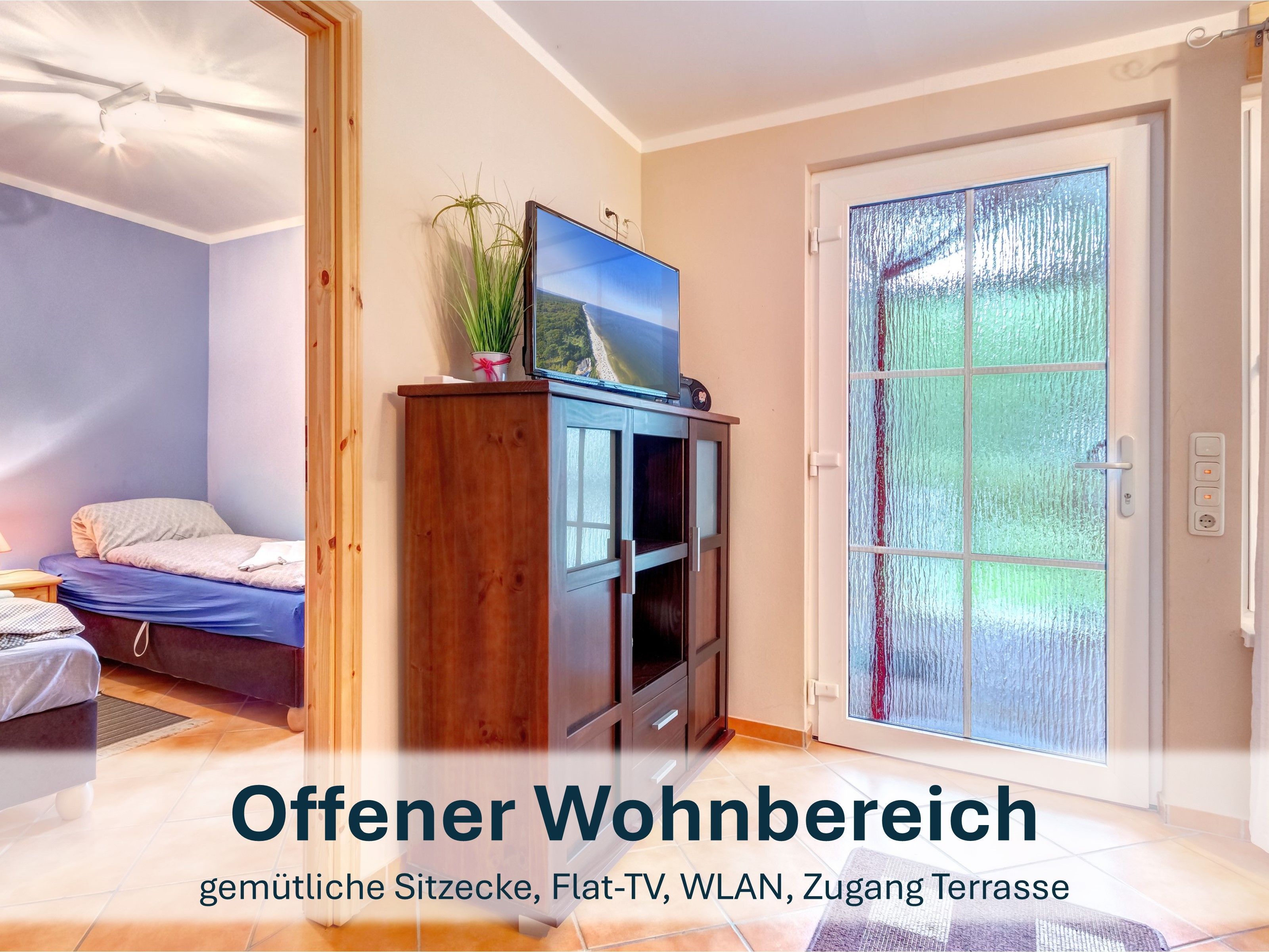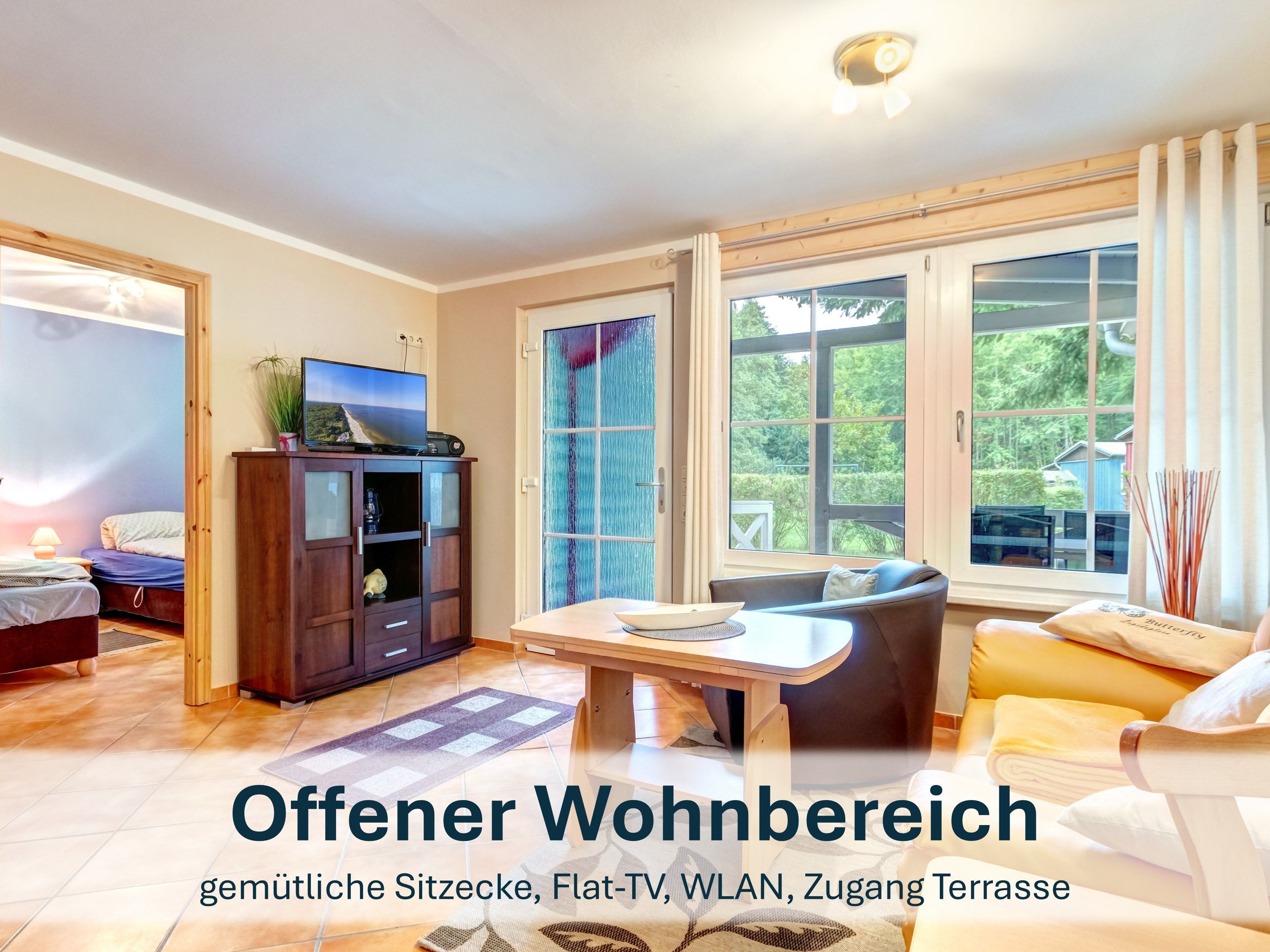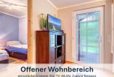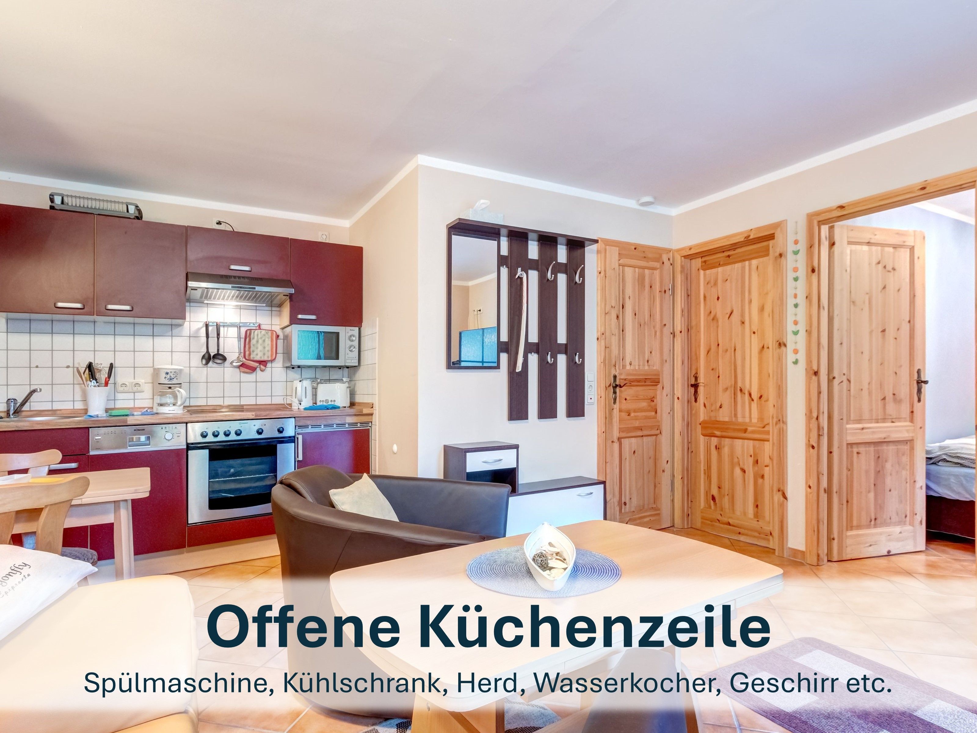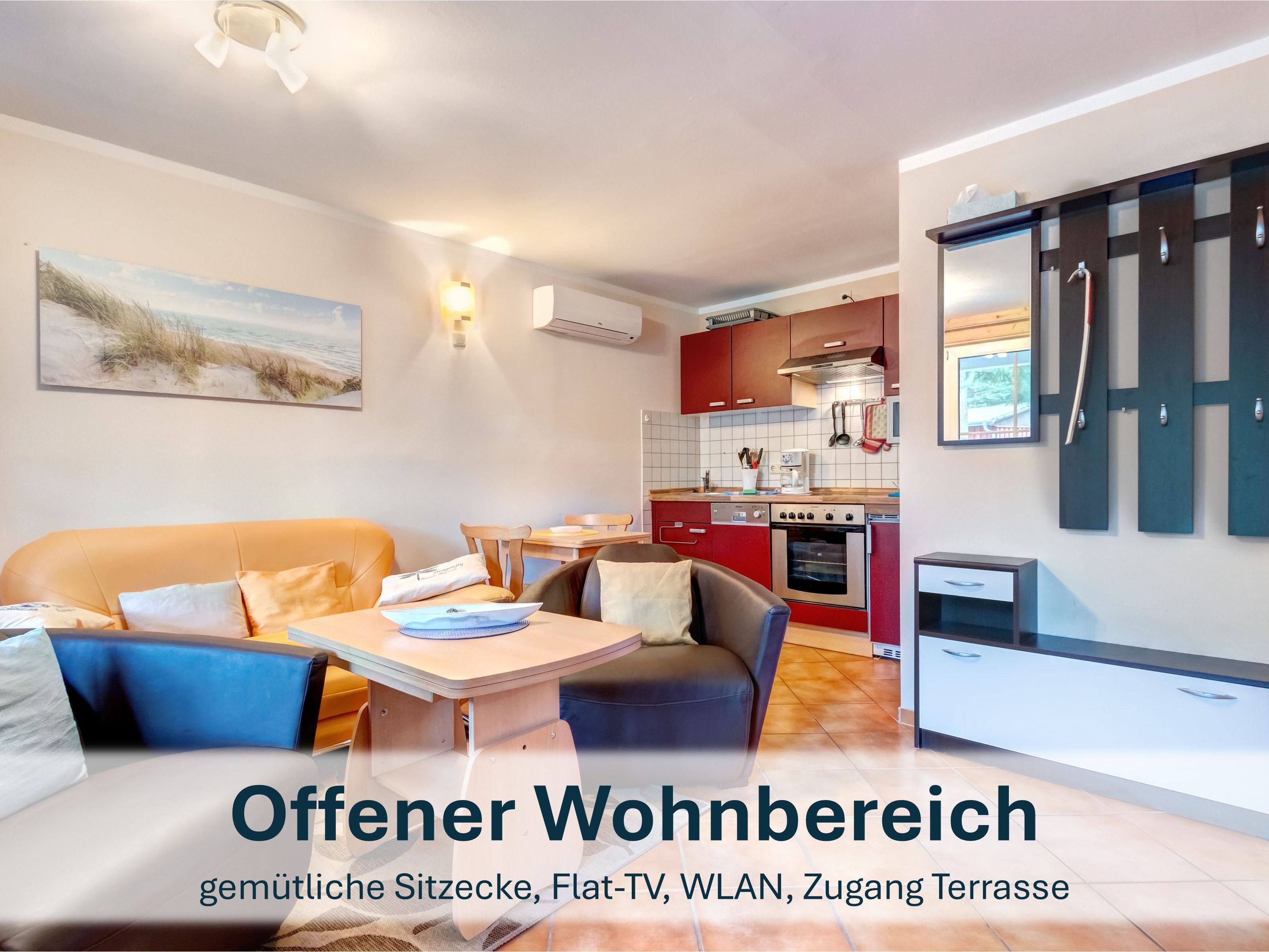 Der Wohnbereich zeichnet sich durch seine geschmackvolle Einrichtung mit Sofa, Tisch und Sessel und einem Regal mit TV und Radio aus. Vollendet wird das Bild durch einen mit als Garderobe nutzbaren Schrank. Daran schließt sich die voll ausgestattete, offene Küchenzeile an.