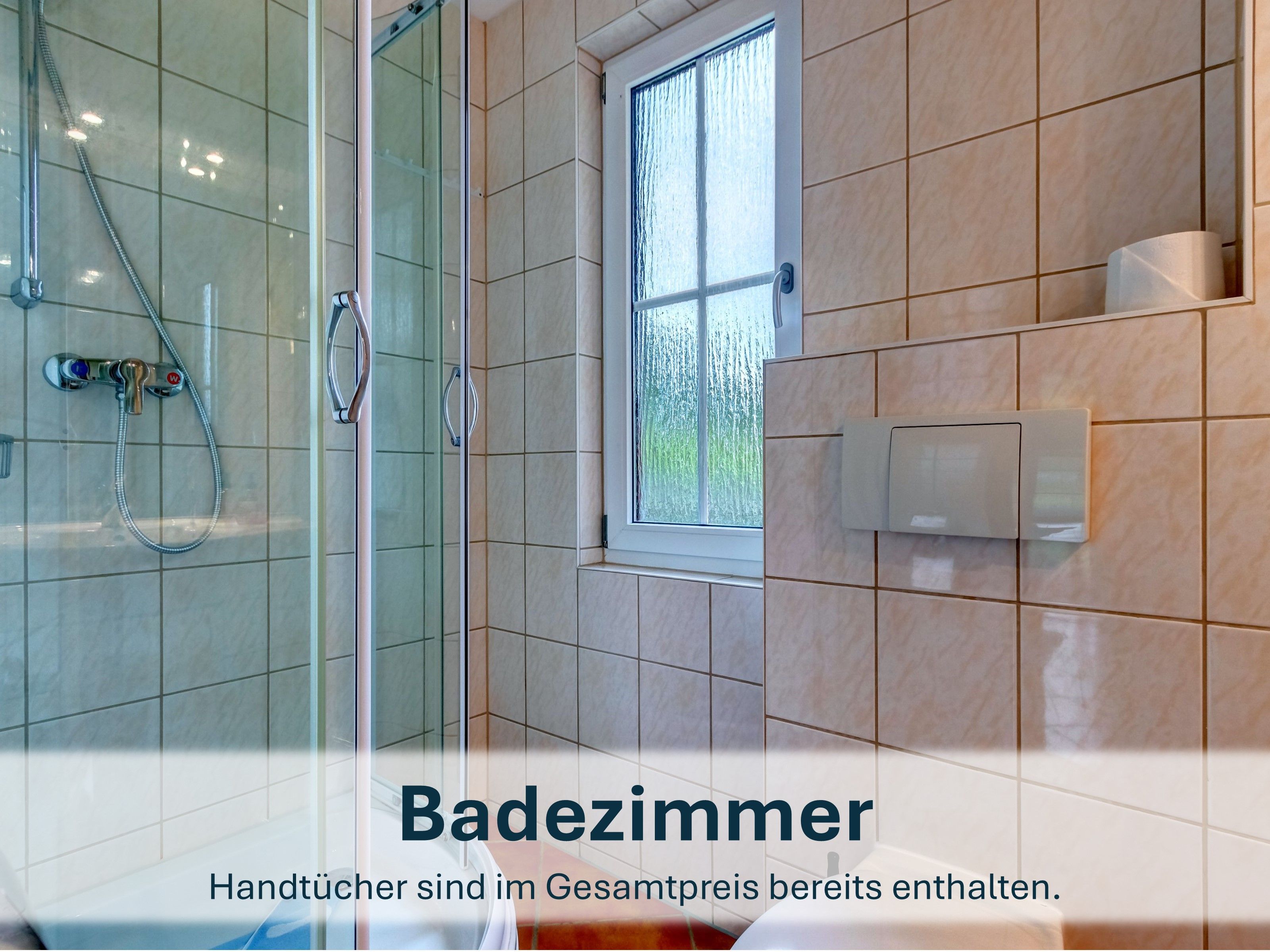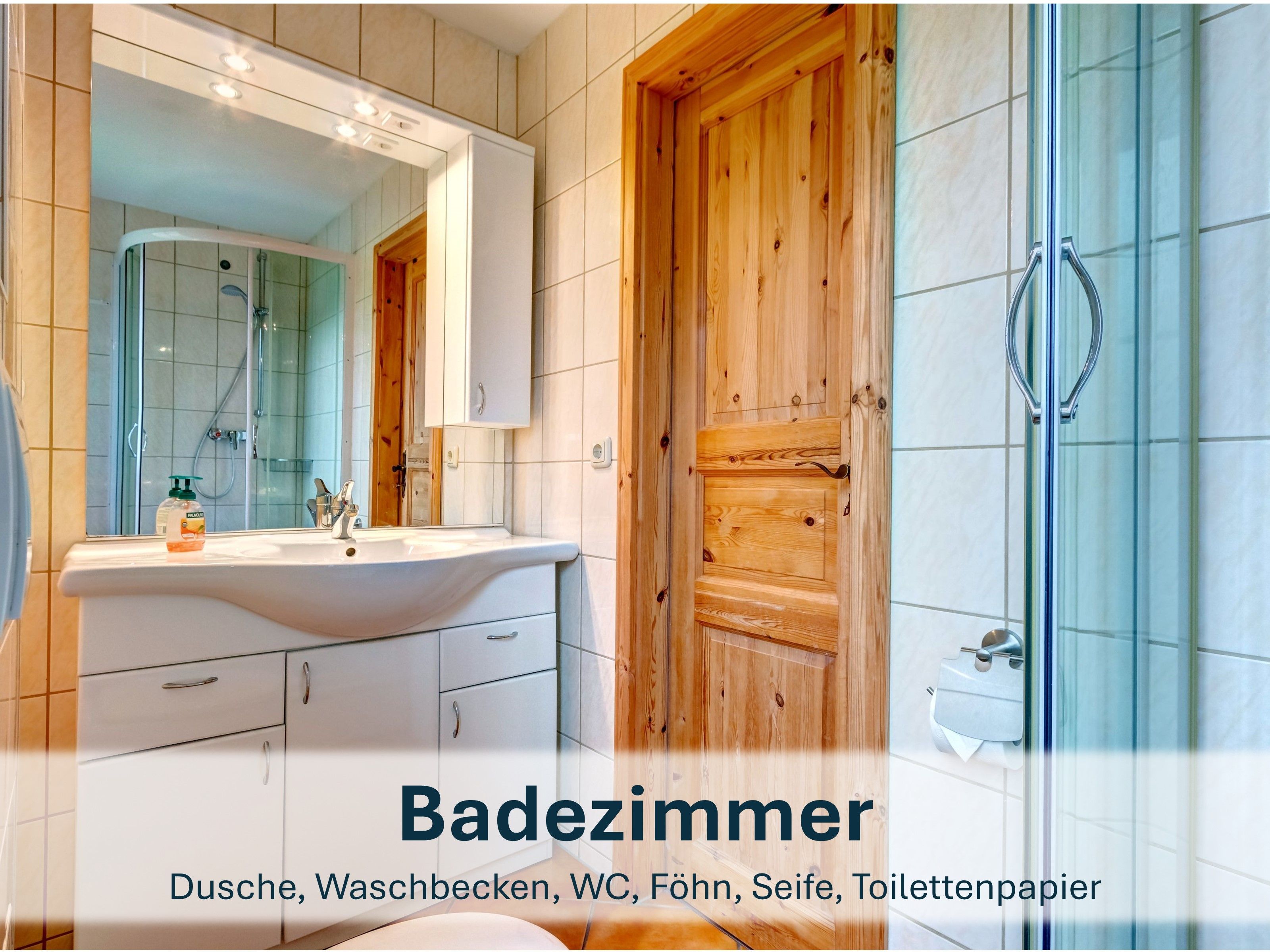 Ein kleines, zweckmäßig eingerichtetes Bad komplettiert den Bungalow. Sie finden dort eine Dusche, ein WC sowie ein Waschbecken mit Spiegelschrank und Regal.