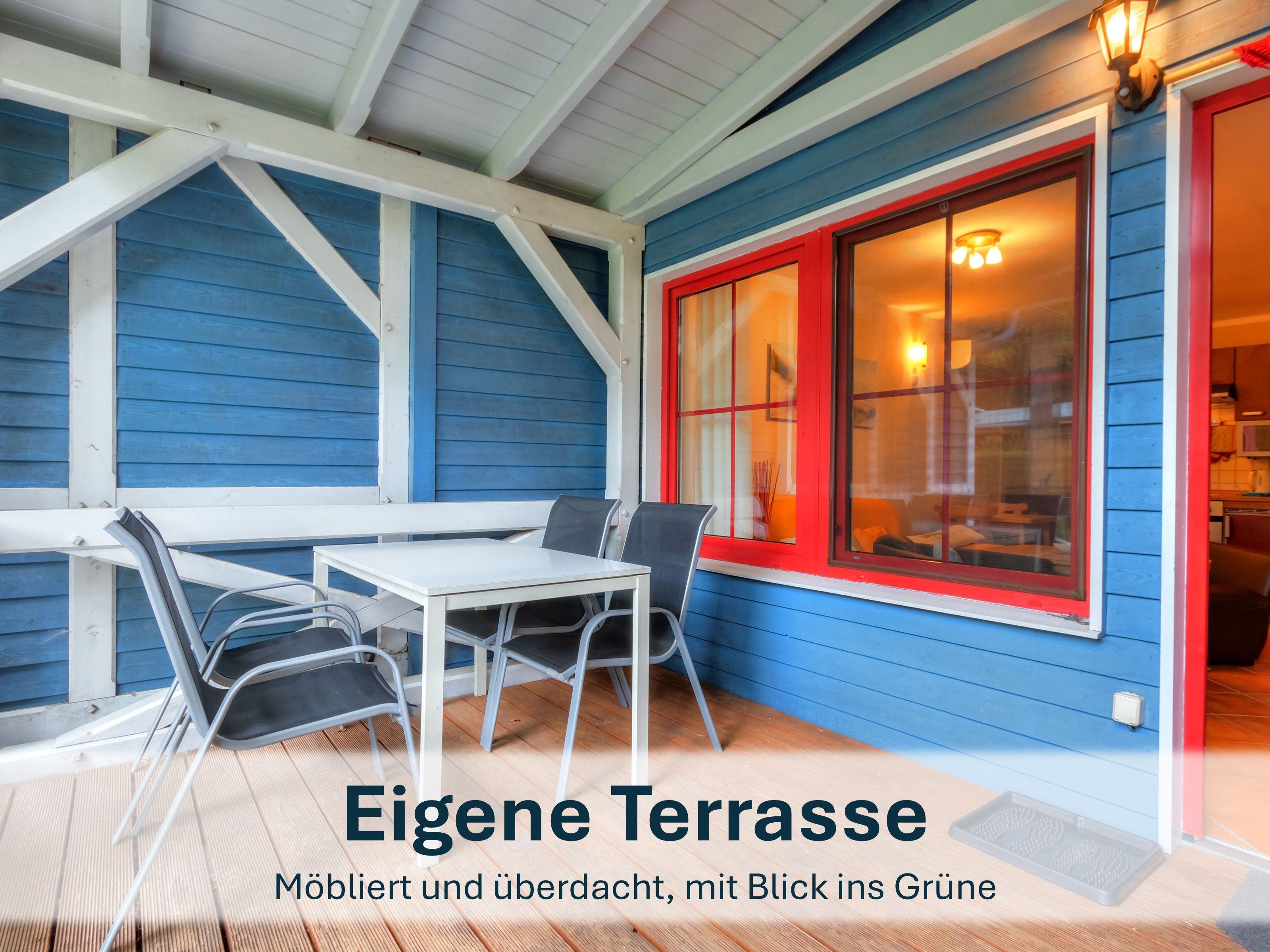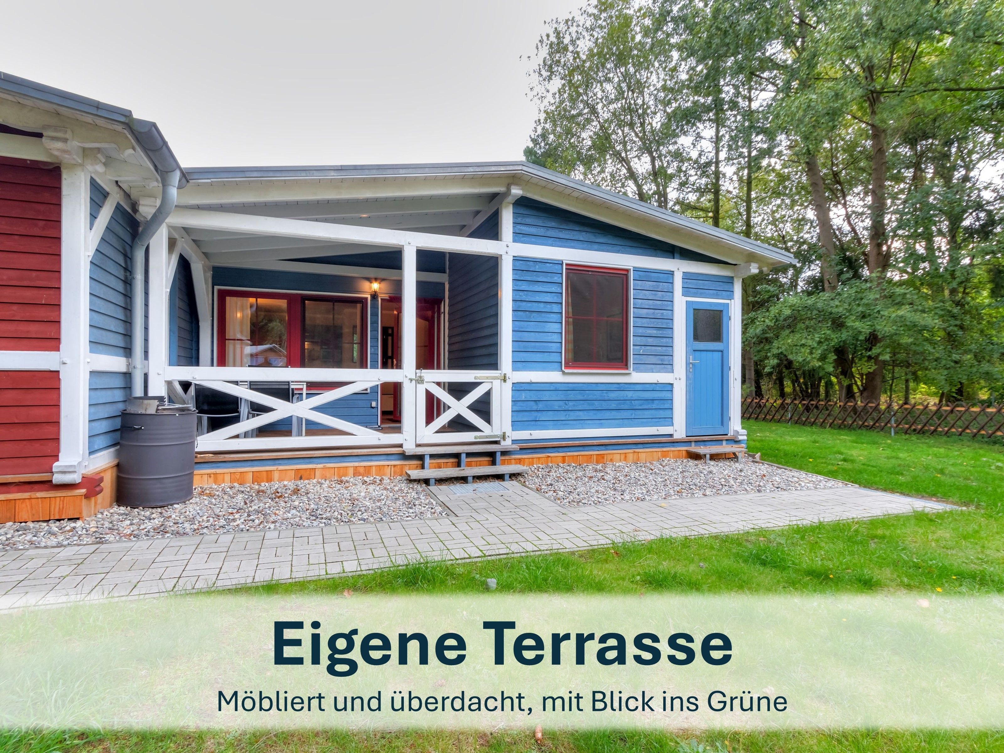 Jeder Bungalow verfügt über eine überdachte, möblierte Terrasse sowie einen abschließbaren Abstellraum.