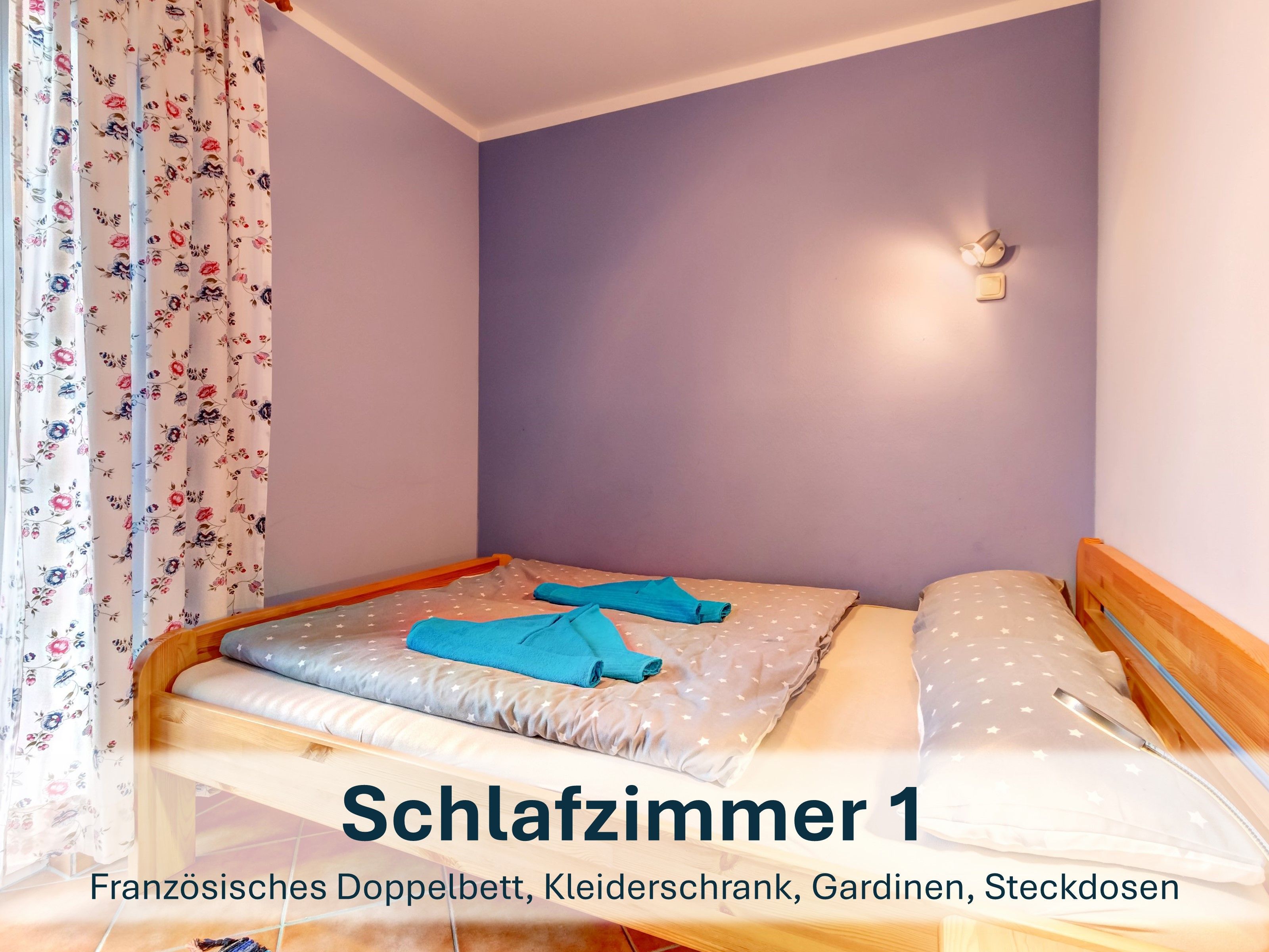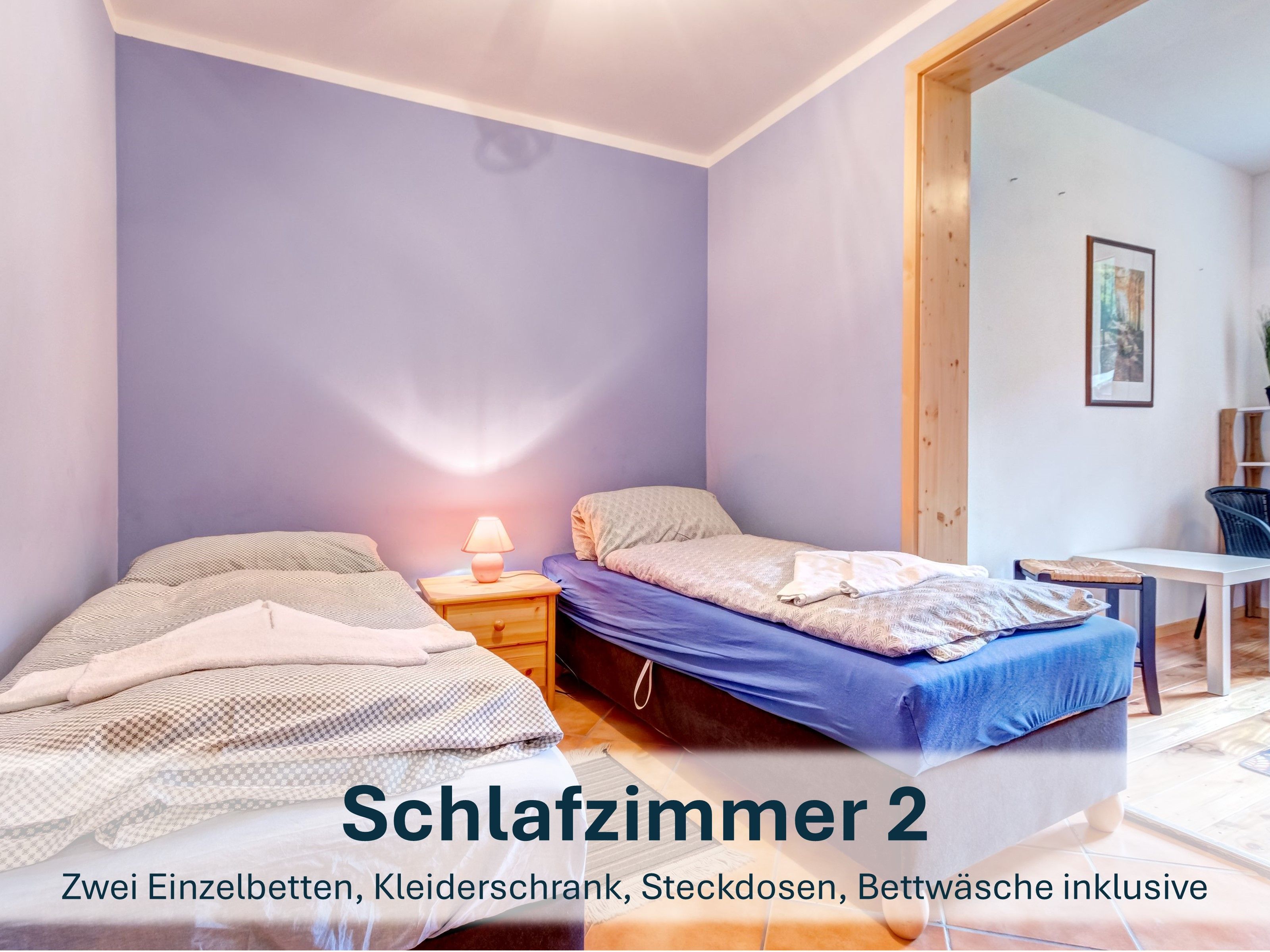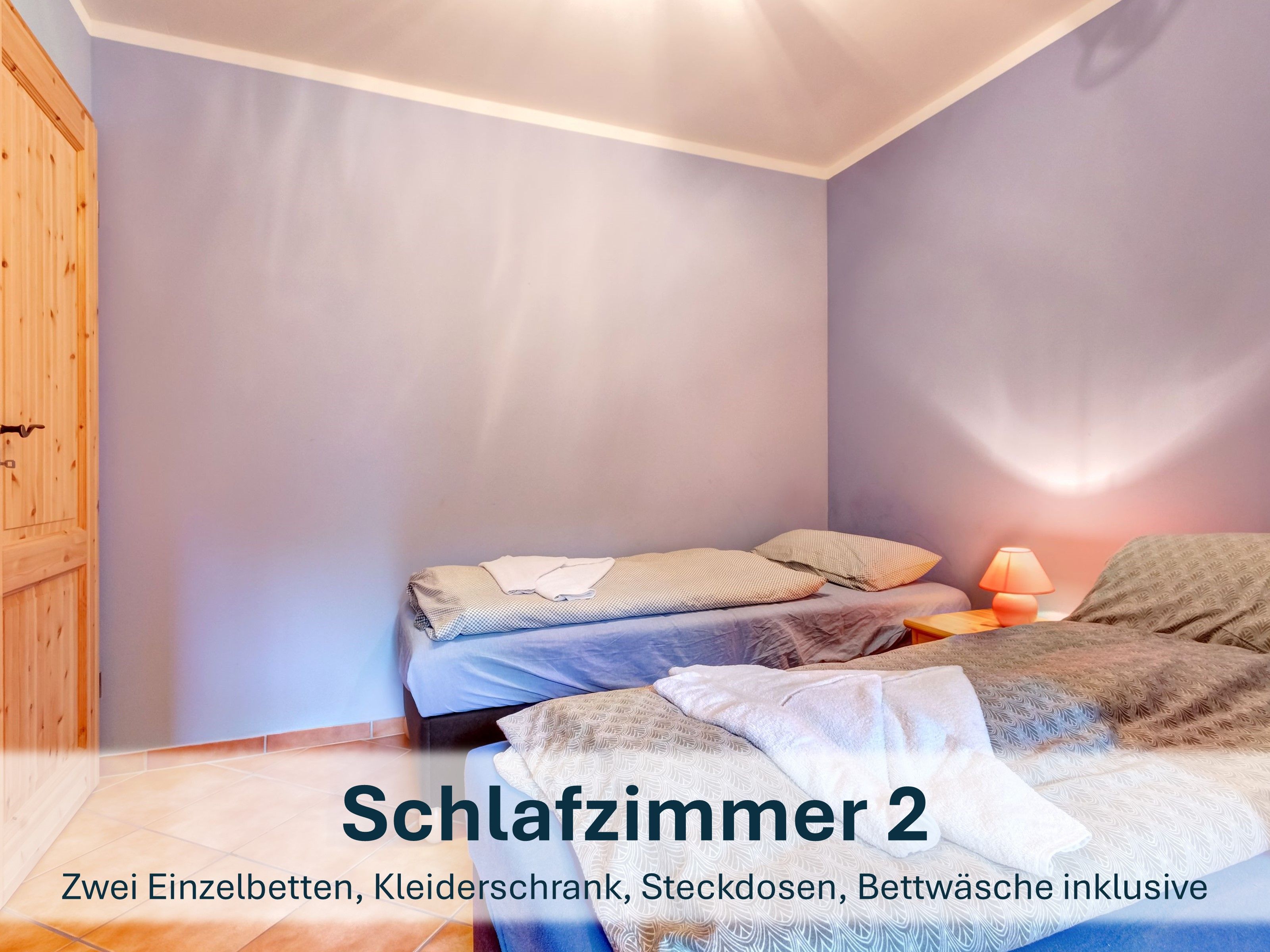 Außerdem findet man im Anschluss eine offene, gut ausgestattete Küche. Das erste Schlafzimmer ist mit einem Doppelbett (140cm Breite) ausgestattet, im zweiten befindet sich zwei Einzelbetten.