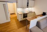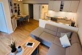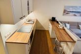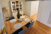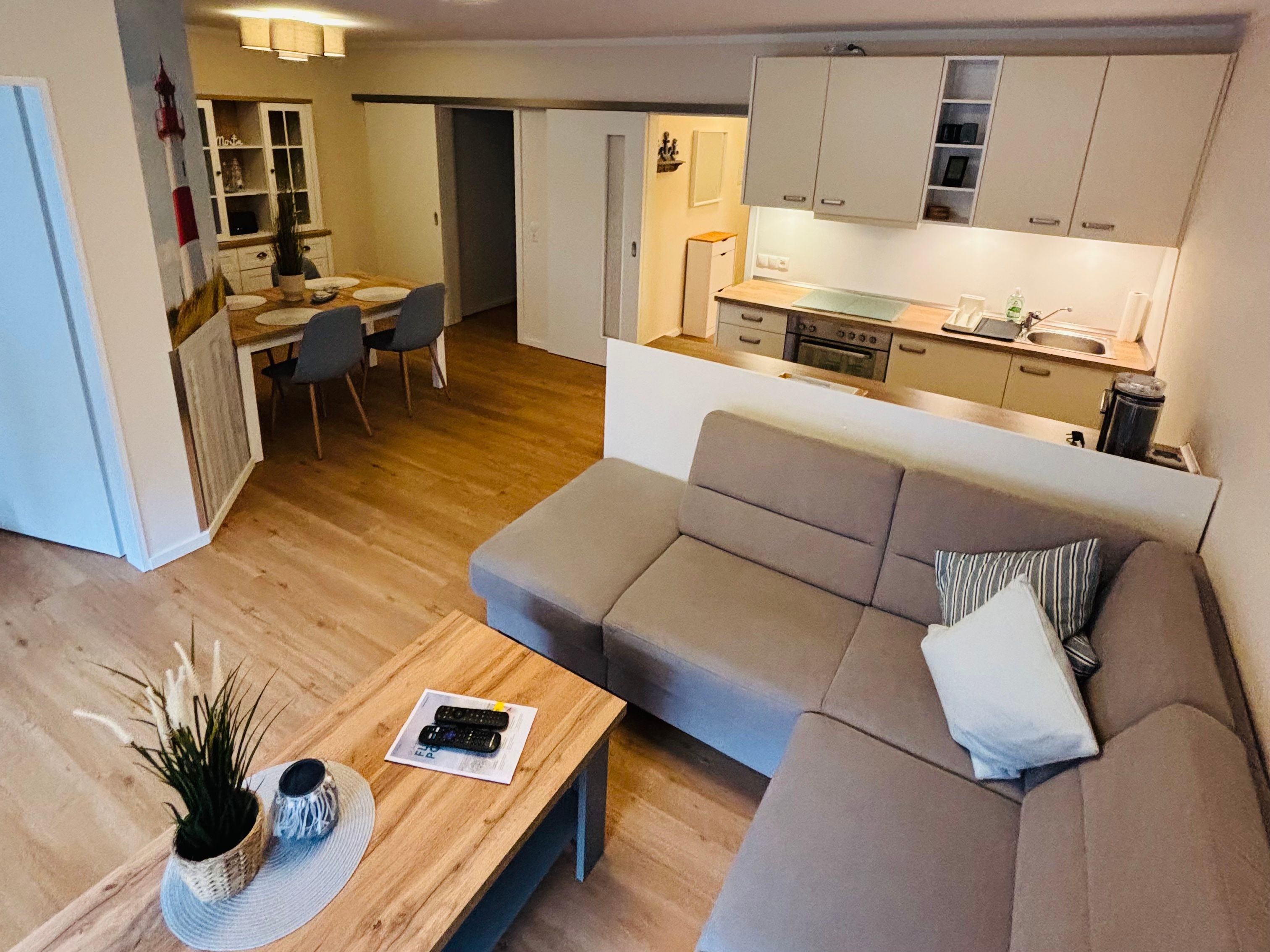 Der offene Wohnbereich mit angeschlossener voll ausgestatteter Küche schafft eine freundliche, helle Atmosphäre. Am Esstisch für vier Personen genießen Sie gemeinsame Mahlzeiten oder Spieleabende in entspannter Runde.