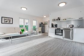 Küche & Kochnische: Backofen, Induktionskochfeld, Mikrowelle (teils mit Grill/Heißluft), Kühlschrank mit Gefrierfach, Geschirrspüler, Wasserkocher, Toaster, Kaffeemaschine & Kaffeepad-Maschine