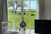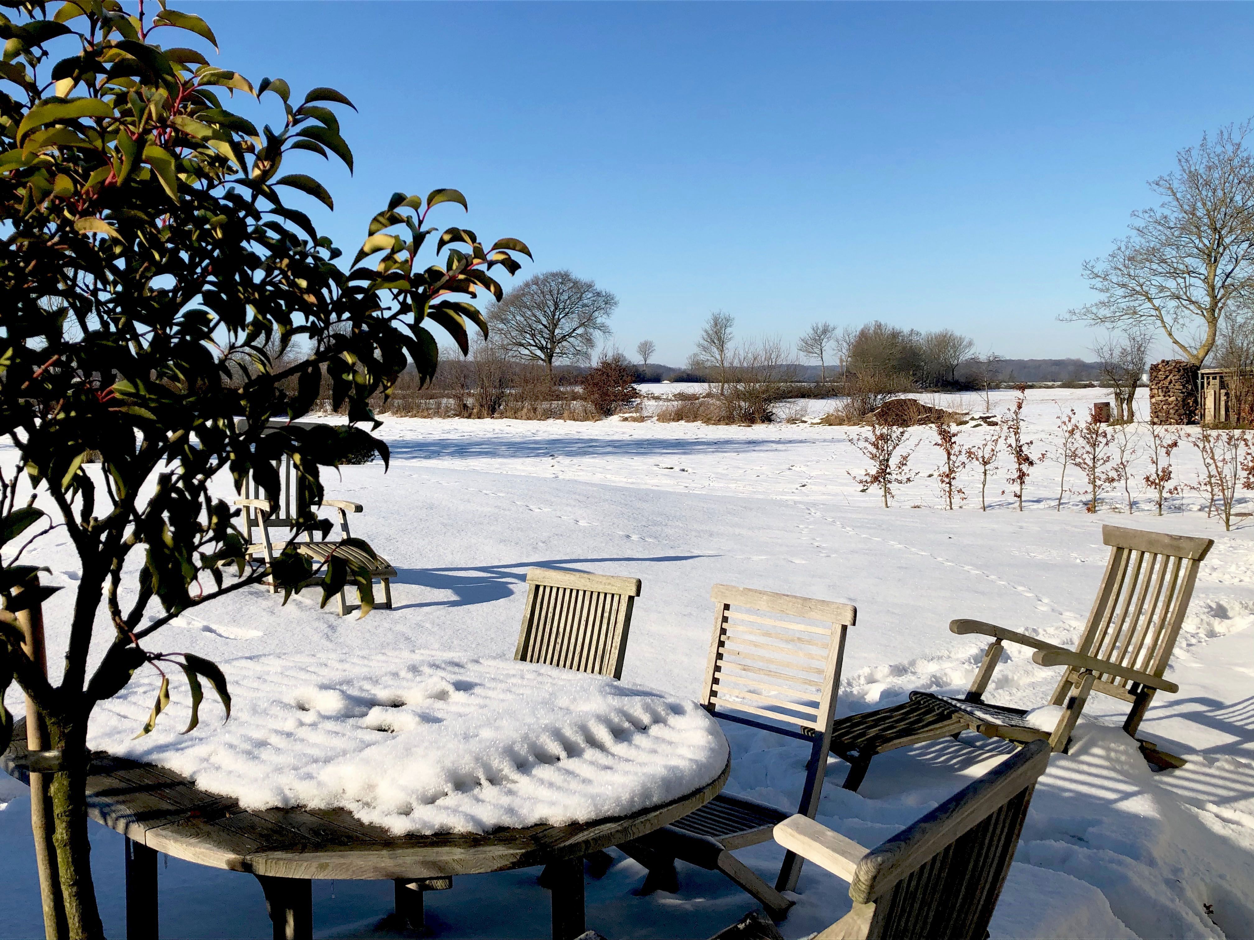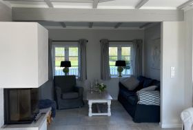 Das Haus hat ein Schlafzimmer mit Doppelbett (180cm x 200cm) im Erdgeschoss und ein weiteres Schlafzimmer mit zwei Einzelbetten im 1. Obergeschoss und bietet Platz für 2 - 4 Personen. Es verfügt über eine offene Landhausküche mit allem Komfort und einem angrenzenden Essbereich. Von dort aus gelangt man in den Wohnbereich mit gemütlichem Sofa und Kamin. Die offene Galerie zum Obergeschoss gibt dem Haus ein großzügiges Wohngefühl. Das luxuriöse Badezimmer liegt ebenerdig mit Blick in den Garten und verfügt über WC, Waschtisch, eine ebenerdig begehbaren Dusche, Handtuchwärmer, Föhn und Waschmaschine. Das Haus ist durch seine vielen, zum Teil bodentiefen Fenster sehr hell und wird von Sonnenaufgang bis Sonnenuntergang von der Sonne durchflutet. Über die großzügige Terrasse gelangt man in den Garten, in dessen Zentrum der große Apfelbaum Schatten spendet.