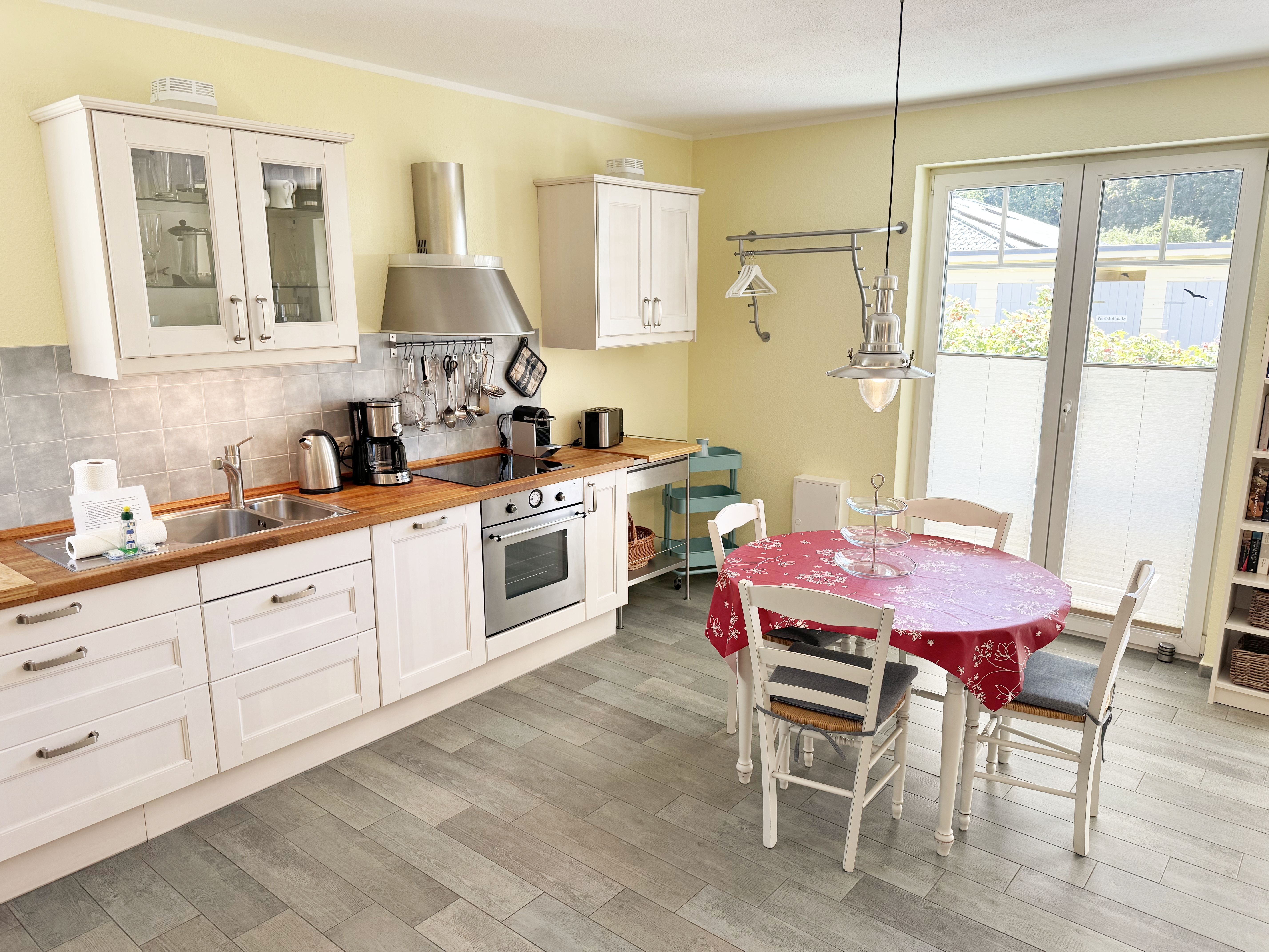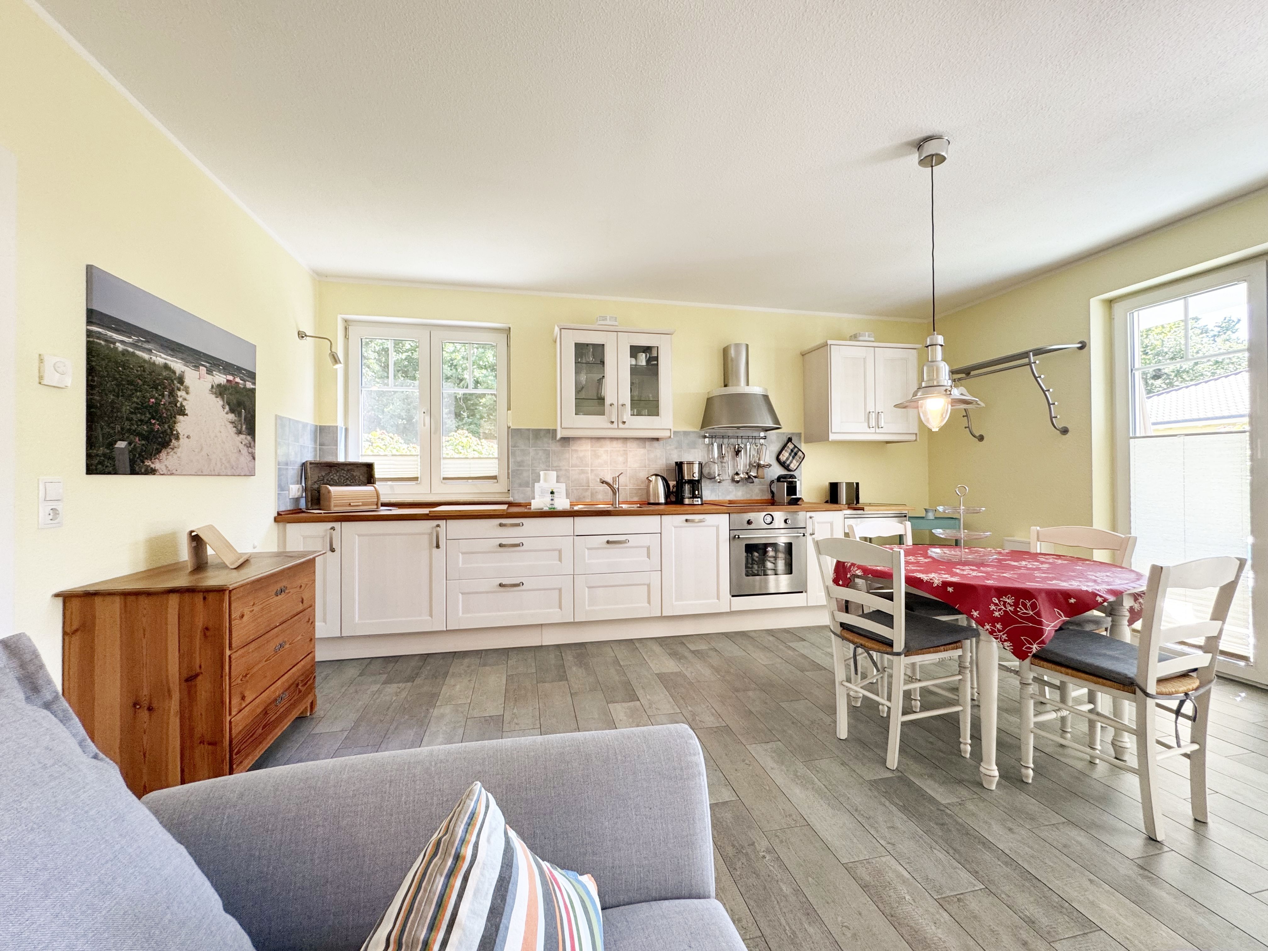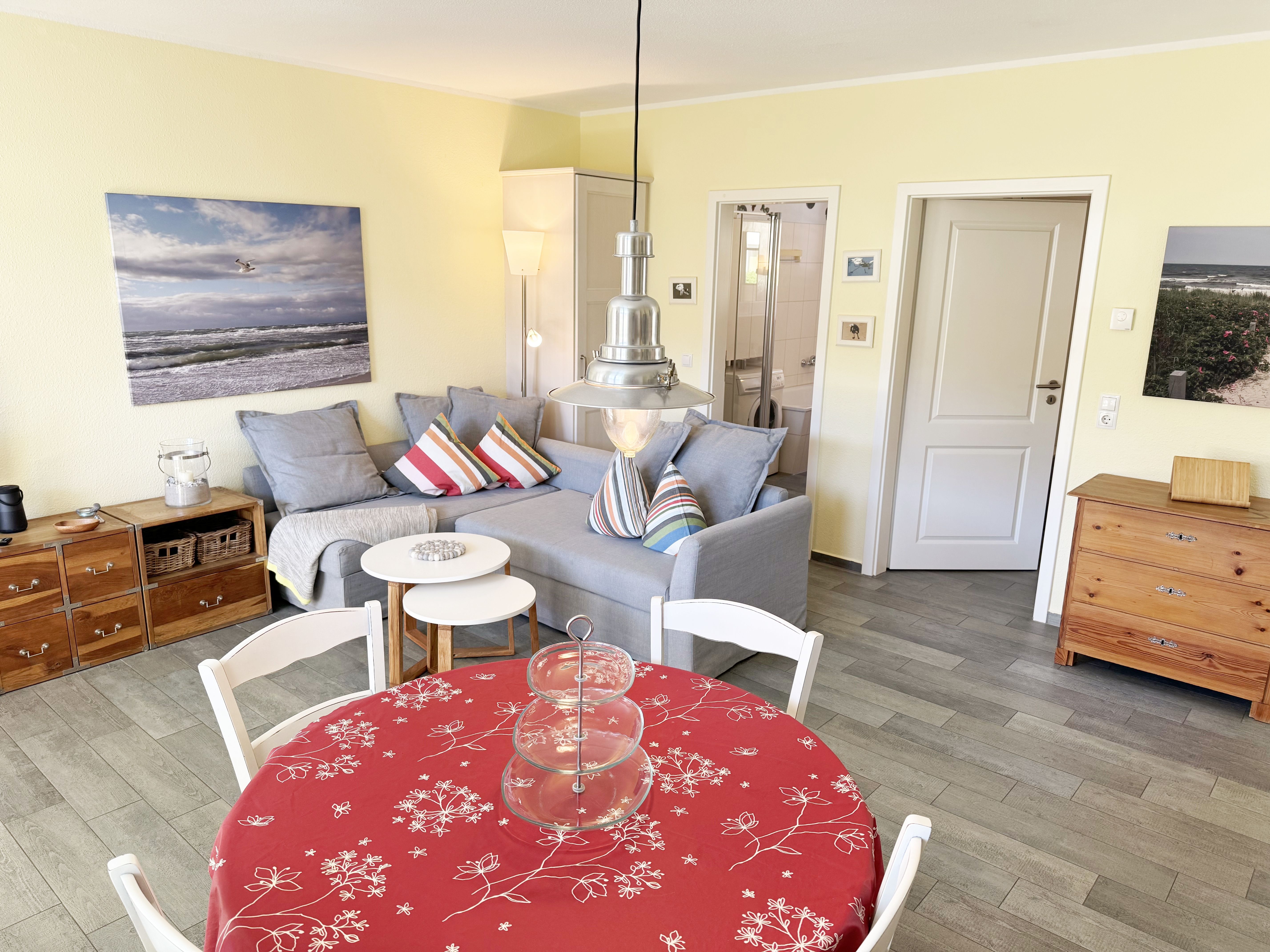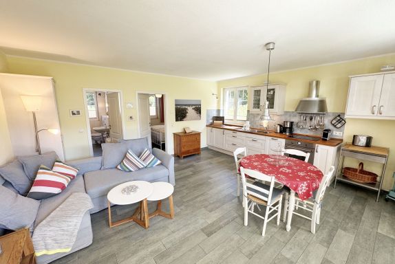 Die Nichtraucherferienwohnung Ostseerausch (Nr.01) umfasst ca. 50 qm und bietet Ihnen für max. 4 Erwachsene ausreichend Platz. Da sich die Wohnung im Erdgeschoss befindet und über einen separaten Eingang über die Terrasse verfügt, eignet Sie sich gut für Familien mit Kindern oder auch ältere Gäste. Der komfortable Wohnbereich wurde mit einer gemütlichen Eckcouch, (Aufbettungsmöglichkeit für 3./4. Person, 1,40m x 2,00m), einem Couchtisch, einer Leselampe und einen TV-Board mit einem Smart-TV ausgestattet. Ein Account von Netflix steht Ihnen zusätzlich zur Verfügung. Ein Bücherregal mit einer kleiner Buchauswahl, einer kleinen Auswahl an Gesellschaftsspielen, Bose connect Lautsprecher und ein WLAN-Anschluss sorgen für Ihre Unterhaltungsmöglichkeiten.  Angrenzend befindet sich die komplett ausgestattet Küchenzeile mit einem Induktionsherd, einem Backofen, einem Geschirrspüler, einem Kühlschrank mit Gefrierfach, einer Kaffeemaschine, einer Nespresso Maschine, einem Wasserkocher, einen Mixer, einen Toaster sowie diverse Küchenutensilien. Ein runder Essplatz rundet den Bereich ab. Vom Wohn-/Essbereich gelangen Sie auf Ihre überdachte und bestuhlte Terrasse mit Sonnenschirm mit Blick auf den Küstenwald. Ein Stand-Elektrogrill sowie 2 Sonnenliegen stehen Ihnen zusätzlich zur Verfügung. Das Schlafzimmer ist mit einem Doppelbett in Komforthöhe (1,60m x 2,00m), Nachtischablagen mit Beleuchtung, einem geräumigen Kleiderschrank sowie Kleiderablagen ausgestattet. Für einen ruhigen und angenehmen Schlaf sorgen zusätzlich Insektenschutzgitter und Außenjalousien, welche Sie auch in den anderen Räumlichkeiten vorfinden. Im Tageslicht-Bad befindet sich eine ebenerdige Regen-Dusche, eine Badewanne, ein Waschplatz, ein WC mit Komfort-Sitz, ein beheizter Handtuchhalter, eine Waschmaschine (Nutzung inklusive), ein Kosmetikspiegel sowie ein Fön. Für eine angenehme Wärme sorgt in allen Räumlichkeiten eine Fußbodenheizung. Reinigungsutensilien, ein Bügelbrett, ein Bügeleisen sowie ein Wäscheständer komplettieren die Ausstattung der Wohnung. Zwei Haustiere sind gegen eine Gebühr gern gesehene Gäste. Mitgebrachte oder geliehene Fahrräder können im dazugehörigen Schuppen (Nr.01) untergestellt werden. Ihr PKW-Stellplatz (Nr.01) befindet sich direkt auf dem Grundstück. Die Erstausstattung eines Wäschepaketes (komplette Bettwäsche, 1 Duschhandtuch, 2 kleine Handtücher) können Sie bis 14 Tage vor Anreise gegen einen Aufpreis dazu buchen oder durch eigenes Ergänzen. Ab 2 gebuchten Paketen erhalten Sie einmalig 1 Geschirrhandtuch und 1 Duschvorleger dazu.
