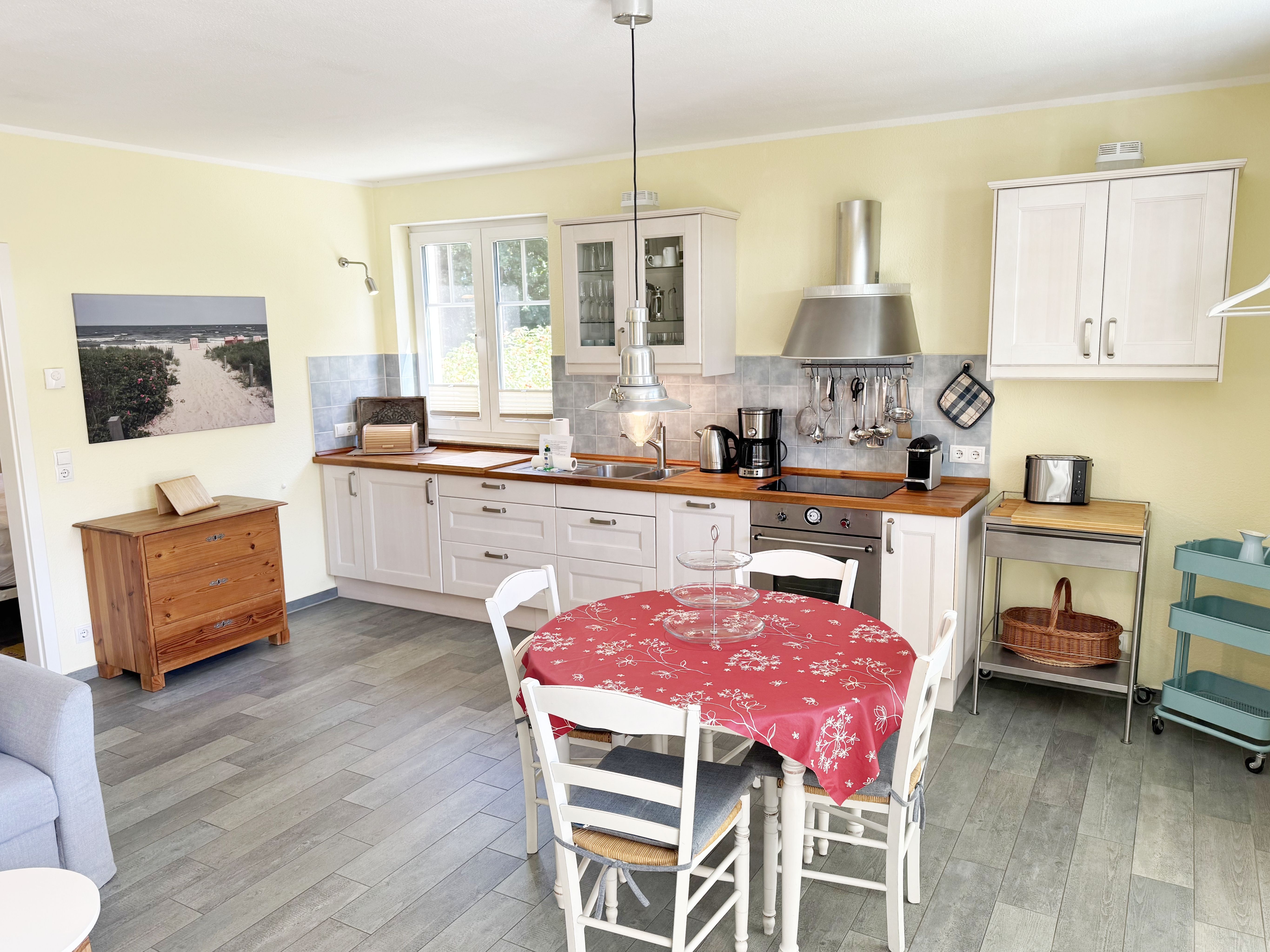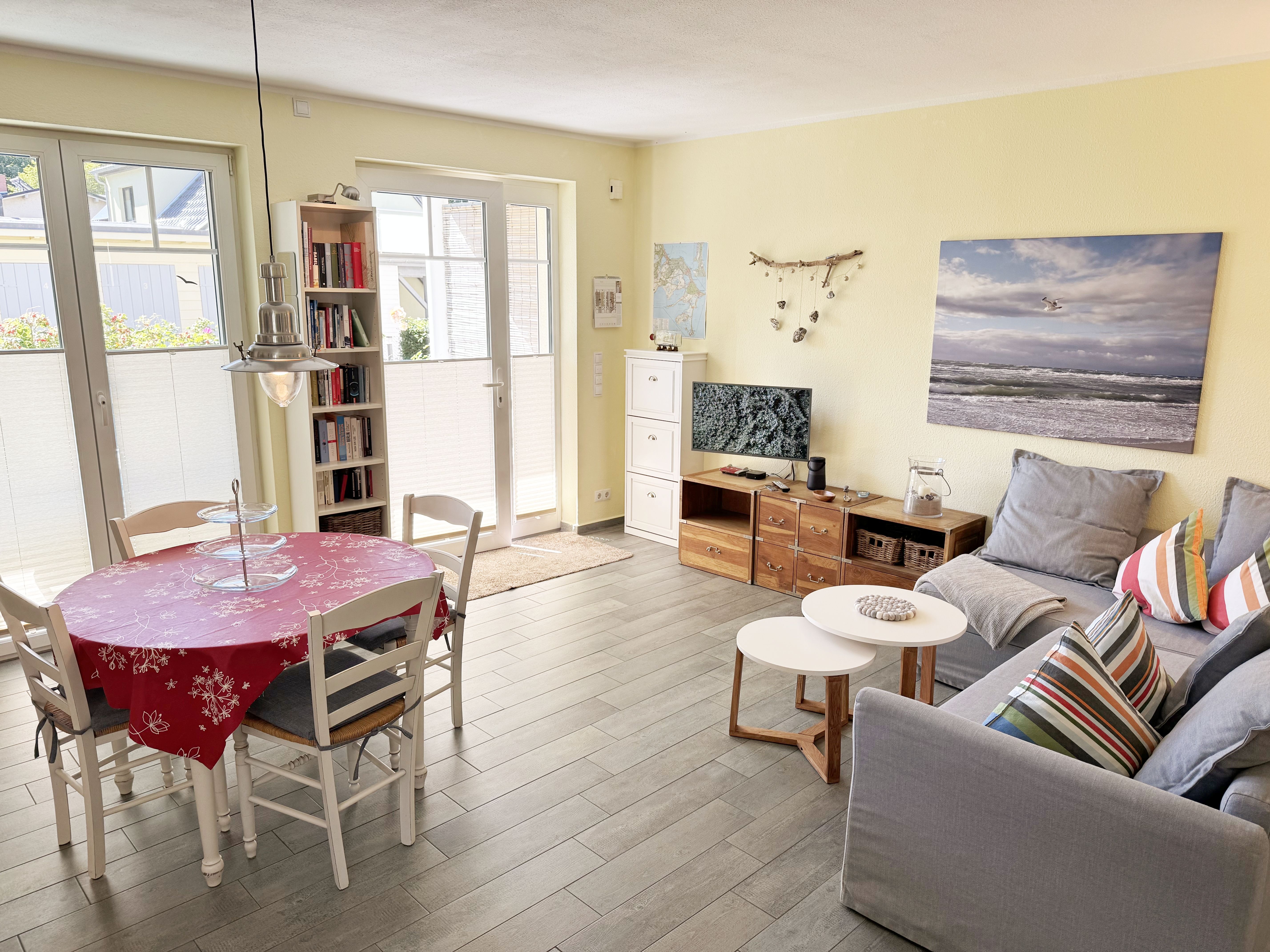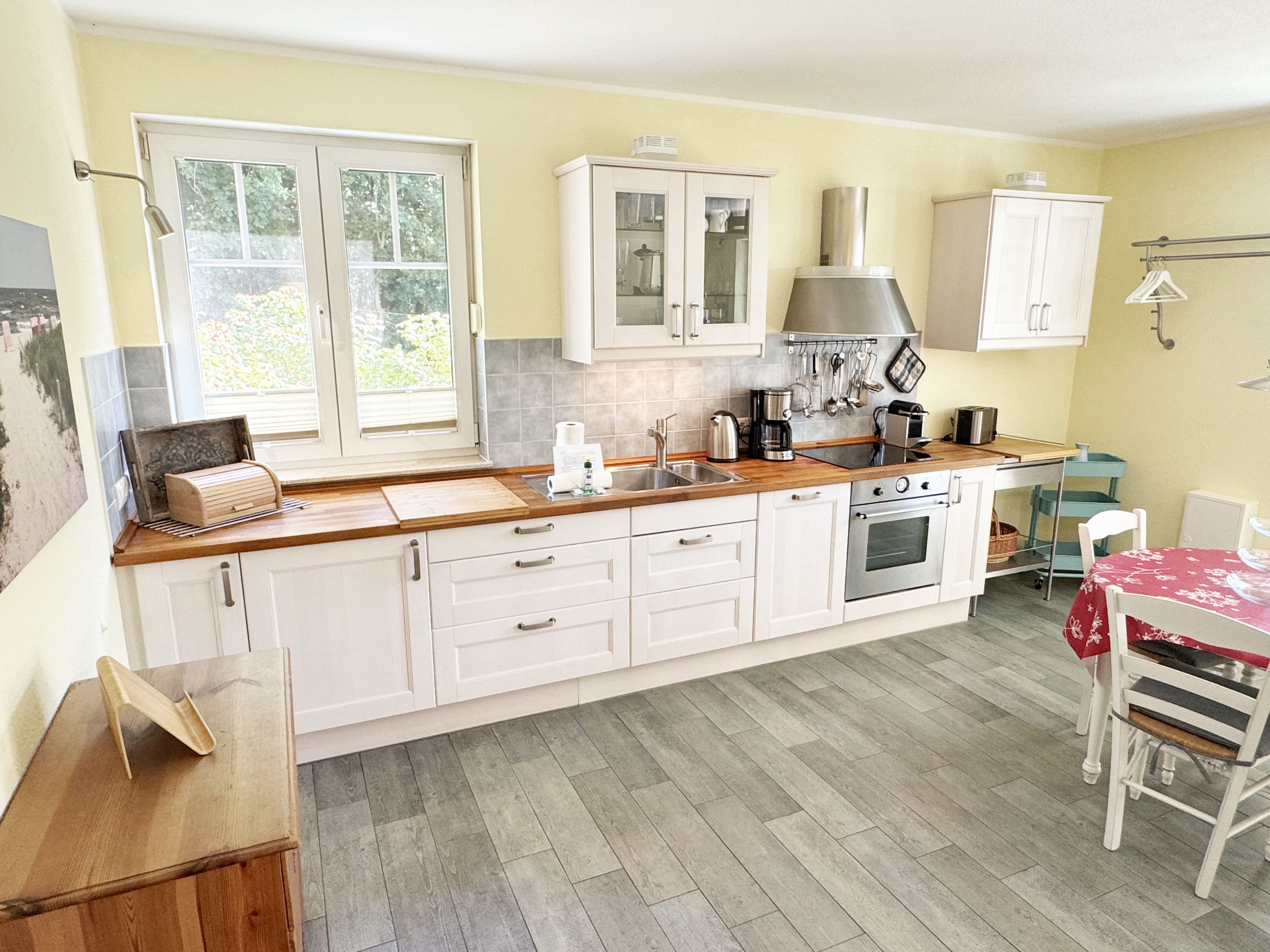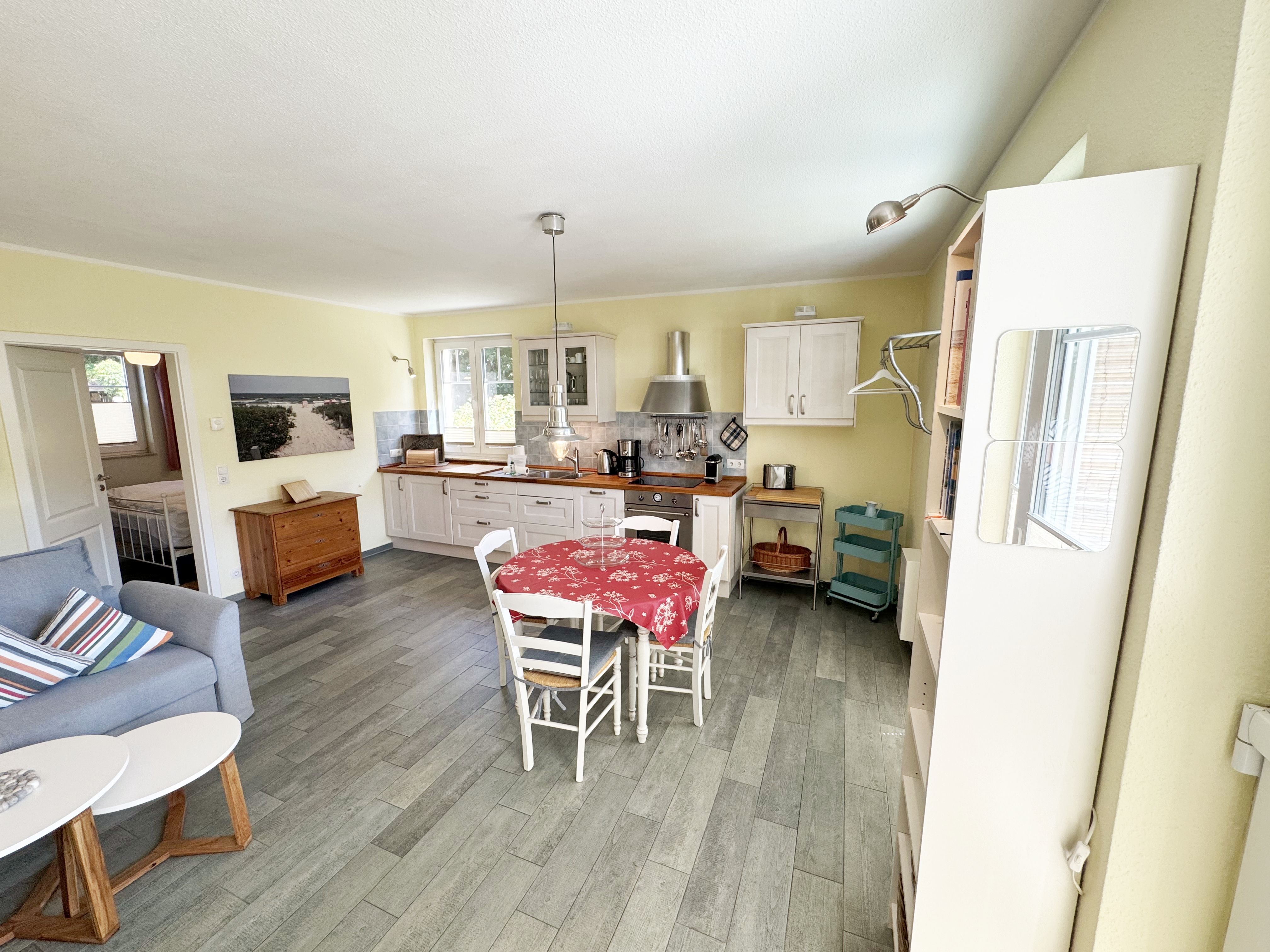 Die Nichtraucherferienwohnung Ostseerausch (Nr.01) umfasst ca. 50 qm und bietet Ihnen für max. 4 Erwachsene ausreichend Platz. Da sich die Wohnung im Erdgeschoss befindet und über einen separaten Eingang über die Terrasse verfügt, eignet Sie sich gut für Familien mit Kindern oder auch ältere Gäste. Der komfortable Wohnbereich wurde mit einer gemütlichen Eckcouch, (Aufbettungsmöglichkeit für 3./4. Person, 1,40m x 2,00m), einem Couchtisch, einer Leselampe und einen TV-Board mit einem Smart-TV ausgestattet. Ein Account von Netflix steht Ihnen zusätzlich zur Verfügung. Ein Bücherregal mit einer kleiner Buchauswahl, einer kleinen Auswahl an Gesellschaftsspielen, Bose connect Lautsprecher und ein WLAN-Anschluss sorgen für Ihre Unterhaltungsmöglichkeiten.  Angrenzend befindet sich die komplett ausgestattet Küchenzeile mit einem Induktionsherd, einem Backofen, einem Geschirrspüler, einem Kühlschrank mit Gefrierfach, einer Kaffeemaschine, einer Nespresso Maschine, einem Wasserkocher, einen Mixer, einen Toaster sowie diverse Küchenutensilien. Ein runder Essplatz rundet den Bereich ab. Vom Wohn-/Essbereich gelangen Sie auf Ihre überdachte und bestuhlte Terrasse mit Sonnenschirm mit Blick auf den Küstenwald. Ein Stand-Elektrogrill sowie 2 Sonnenliegen stehen Ihnen zusätzlich zur Verfügung. Das Schlafzimmer ist mit einem Doppelbett in Komforthöhe (1,60m x 2,00m), Nachtischablagen mit Beleuchtung, einem geräumigen Kleiderschrank sowie Kleiderablagen ausgestattet. Für einen ruhigen und angenehmen Schlaf sorgen zusätzlich Insektenschutzgitter und Außenjalousien, welche Sie auch in den anderen Räumlichkeiten vorfinden. Im Tageslicht-Bad befindet sich eine ebenerdige Regen-Dusche, eine Badewanne, ein Waschplatz, ein WC mit Komfort-Sitz, ein beheizter Handtuchhalter, eine Waschmaschine (Nutzung inklusive), ein Kosmetikspiegel sowie ein Fön. Für eine angenehme Wärme sorgt in allen Räumlichkeiten eine Fußbodenheizung. Reinigungsutensilien, ein Bügelbrett, ein Bügeleisen sowie ein Wäscheständer komplettieren die Ausstattung der Wohnung. Zwei Haustiere sind gegen eine Gebühr gern gesehene Gäste. Mitgebrachte oder geliehene Fahrräder können im dazugehörigen Schuppen (Nr.01) untergestellt werden. Ihr PKW-Stellplatz (Nr.01) befindet sich direkt auf dem Grundstück. Die Erstausstattung eines Wäschepaketes (komplette Bettwäsche, 1 Duschhandtuch, 2 kleine Handtücher) können Sie bis 14 Tage vor Anreise gegen einen Aufpreis dazu buchen oder durch eigenes Ergänzen. Ab 2 gebuchten Paketen erhalten Sie einmalig 1 Geschirrhandtuch und 1 Duschvorleger dazu.