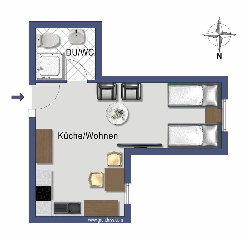 Die Ferienwohnung verfügt über einen kombinierten Wohn-/Schlafraum mit moderner Küchenzeile und einen Essbereich sowie ein Duschbad. WLAN, Bücher und Spiele stehen den Gästen in der Ferienwohnung zur Verfügung. Bettwäsche und Handtücher können gegen eine Gebühr dazu gebucht werden.