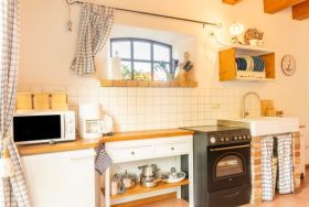 • Wohnküche mit Herd, Backofen, Kaffeemaschine, Toaster, Wasserkocher, Mikrowelle und Radio