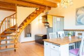 Eine offene Holztreppe verbindet das Erdgeschoss mit dem Dachgeschoss.