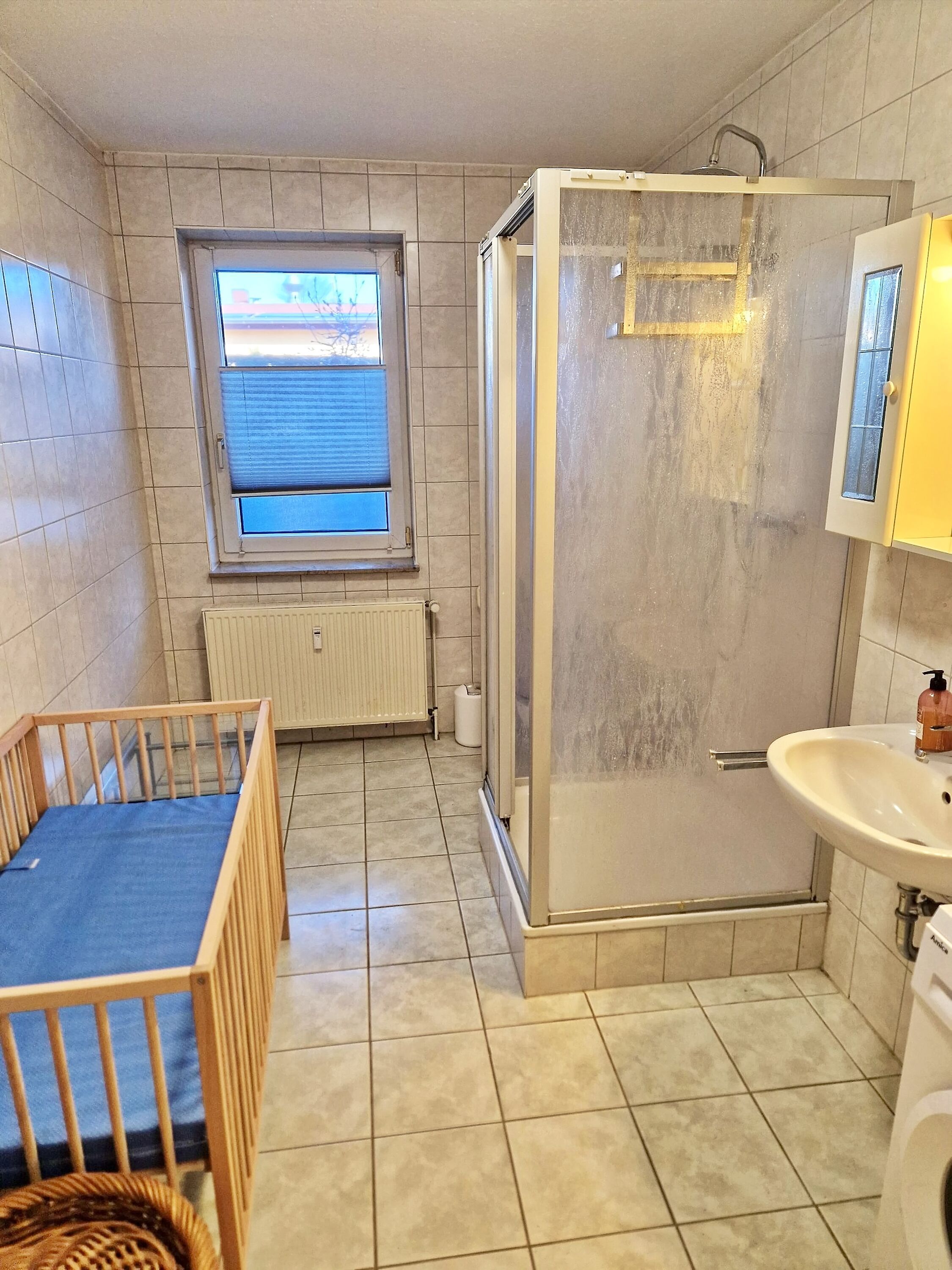- Duschbad mit Dusche, WC, Spiegel, Föhn, Waschmaschine, Wäscheständer, Bügelbrett, Bügeleisen
