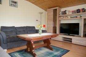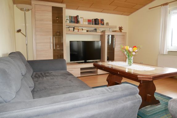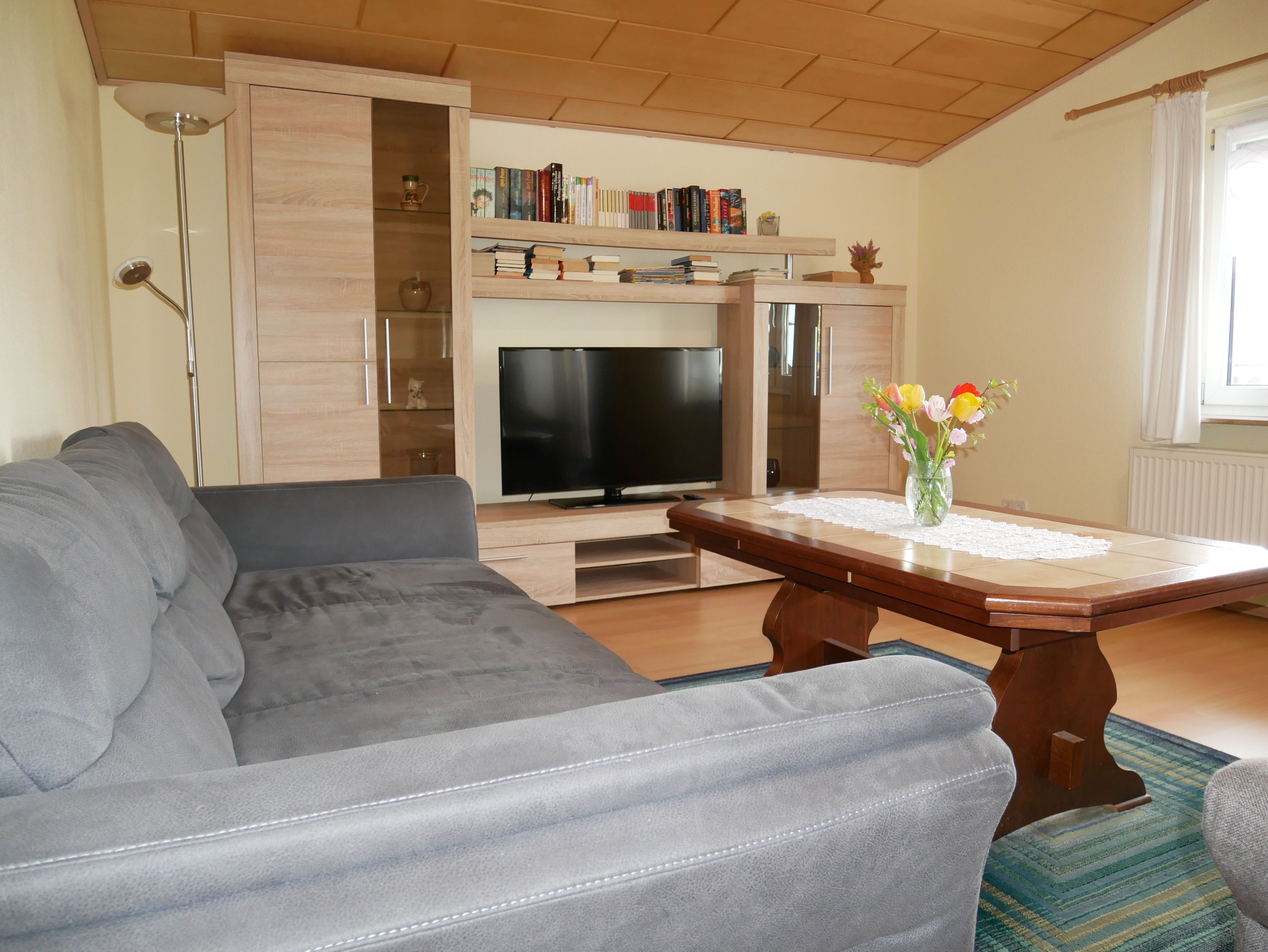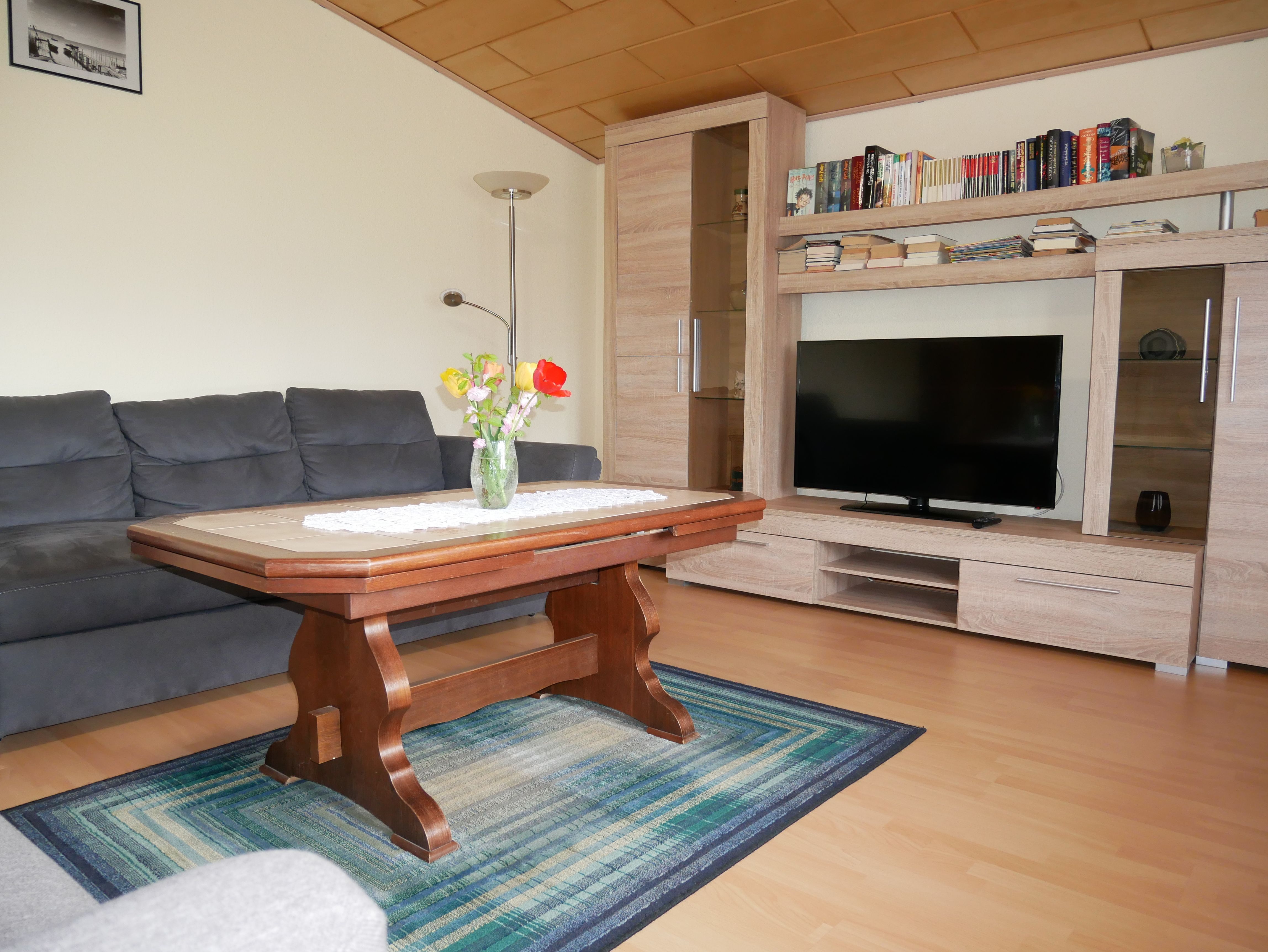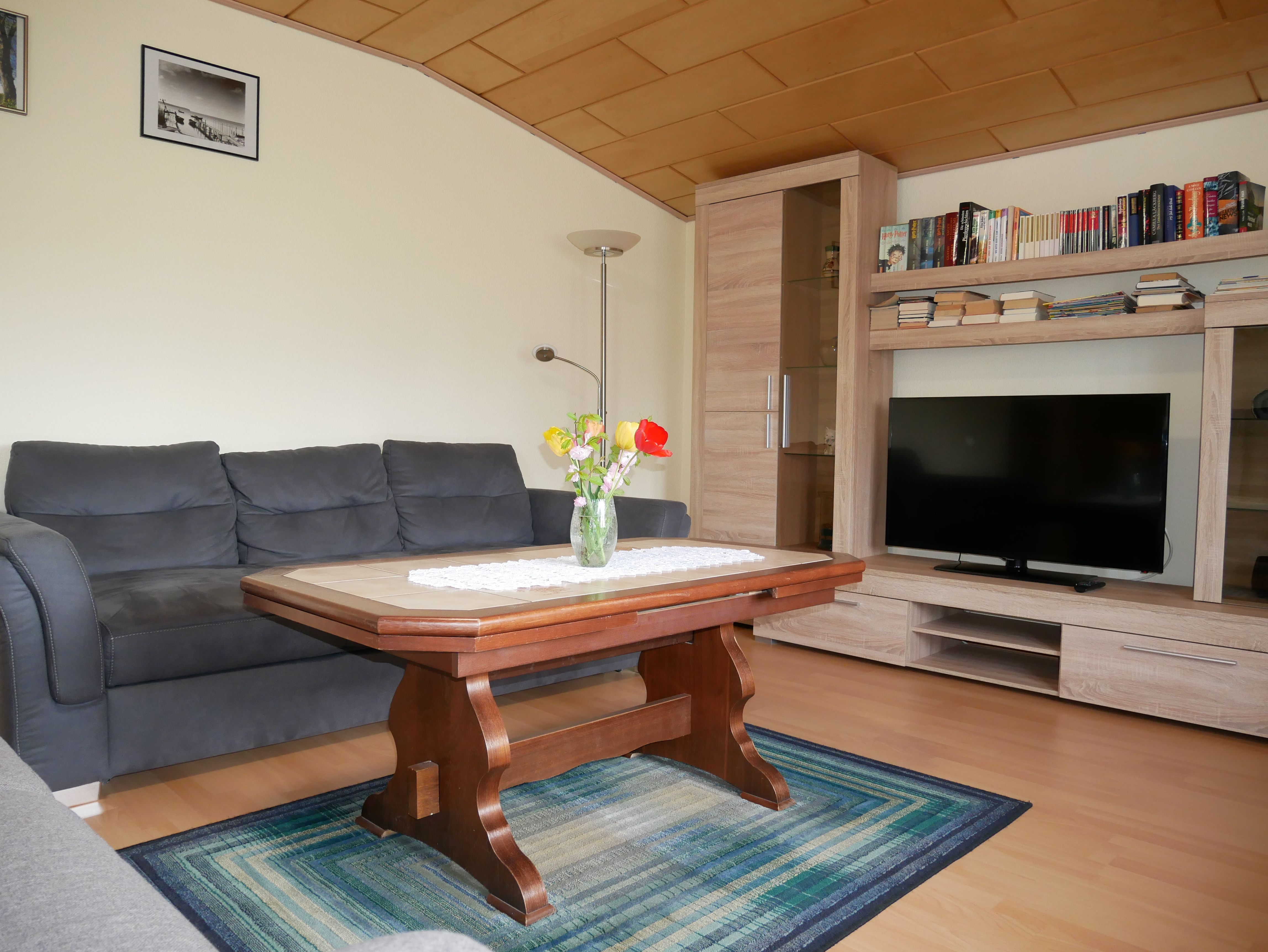 Willkommen in unserer gemütlichen Ferienwohnung! Die Wohnung besteht aus einem komfortablen Wohnzimmer mit zwei bequemen Sofas, Wohnwand mit Büchern und einem Flachbild-TV für entspannte Abende.