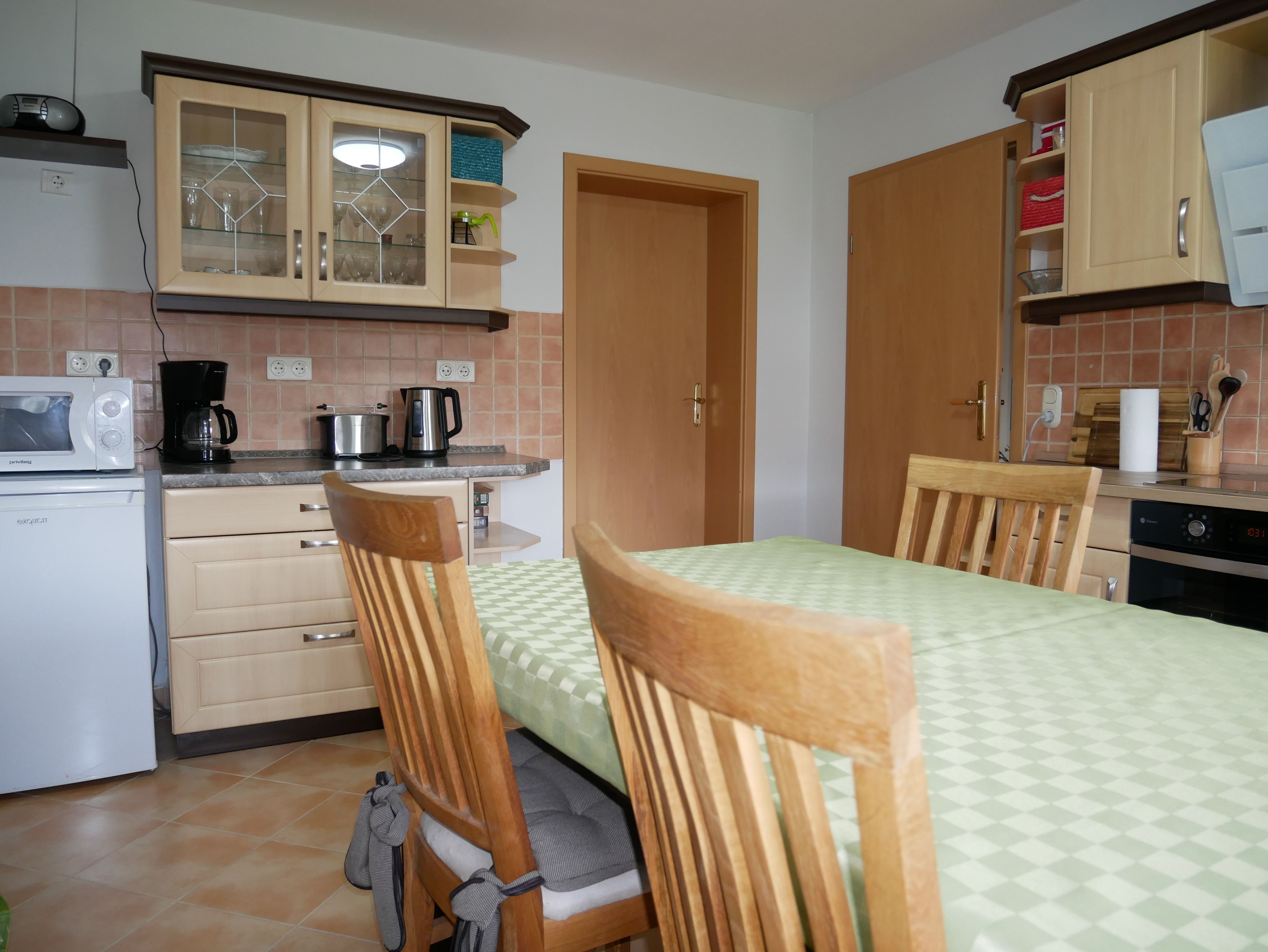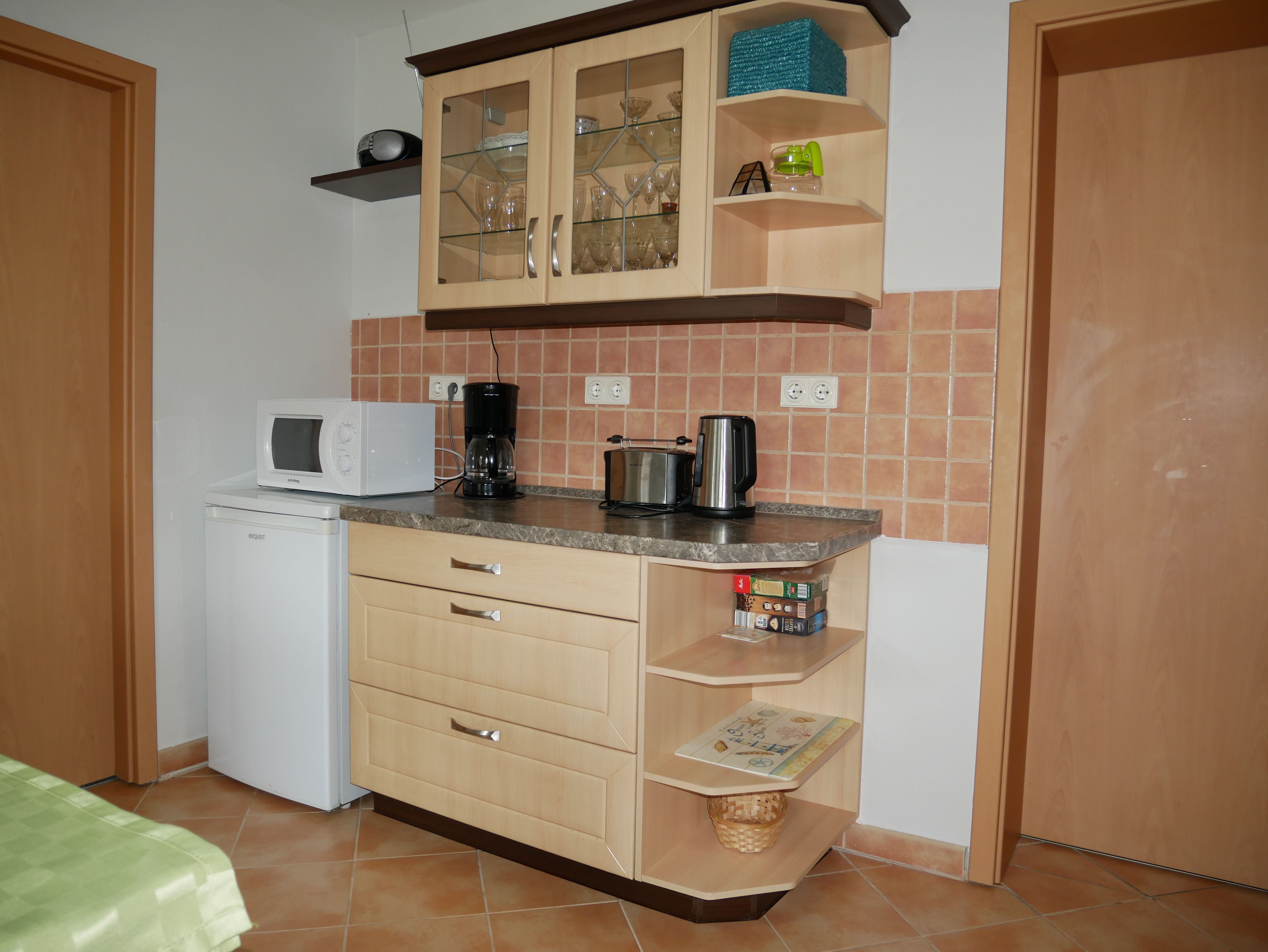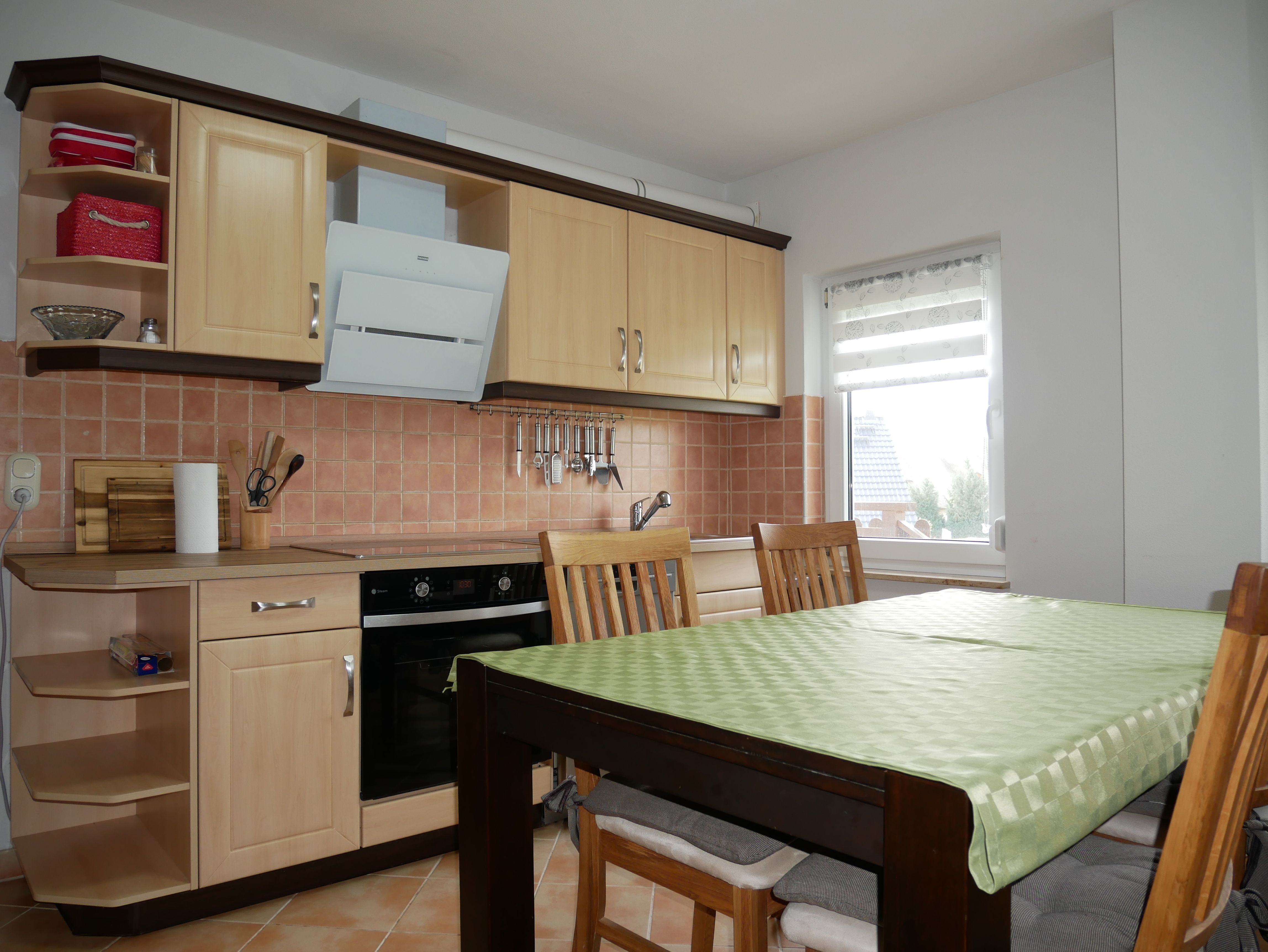 Die voll ausgestattete Küche grenzt direkt an dem Wohnzimmer und ist mit einen Cerankochfeld, Backofen, Kühlschrank mit Gefriermöglichkeit, Spülmaschine, Mikrowelle, Kaffeemaschine, Wasserkocher und Toaster ausgestattet, in dem Sie nach Herzenslust kochen können.
