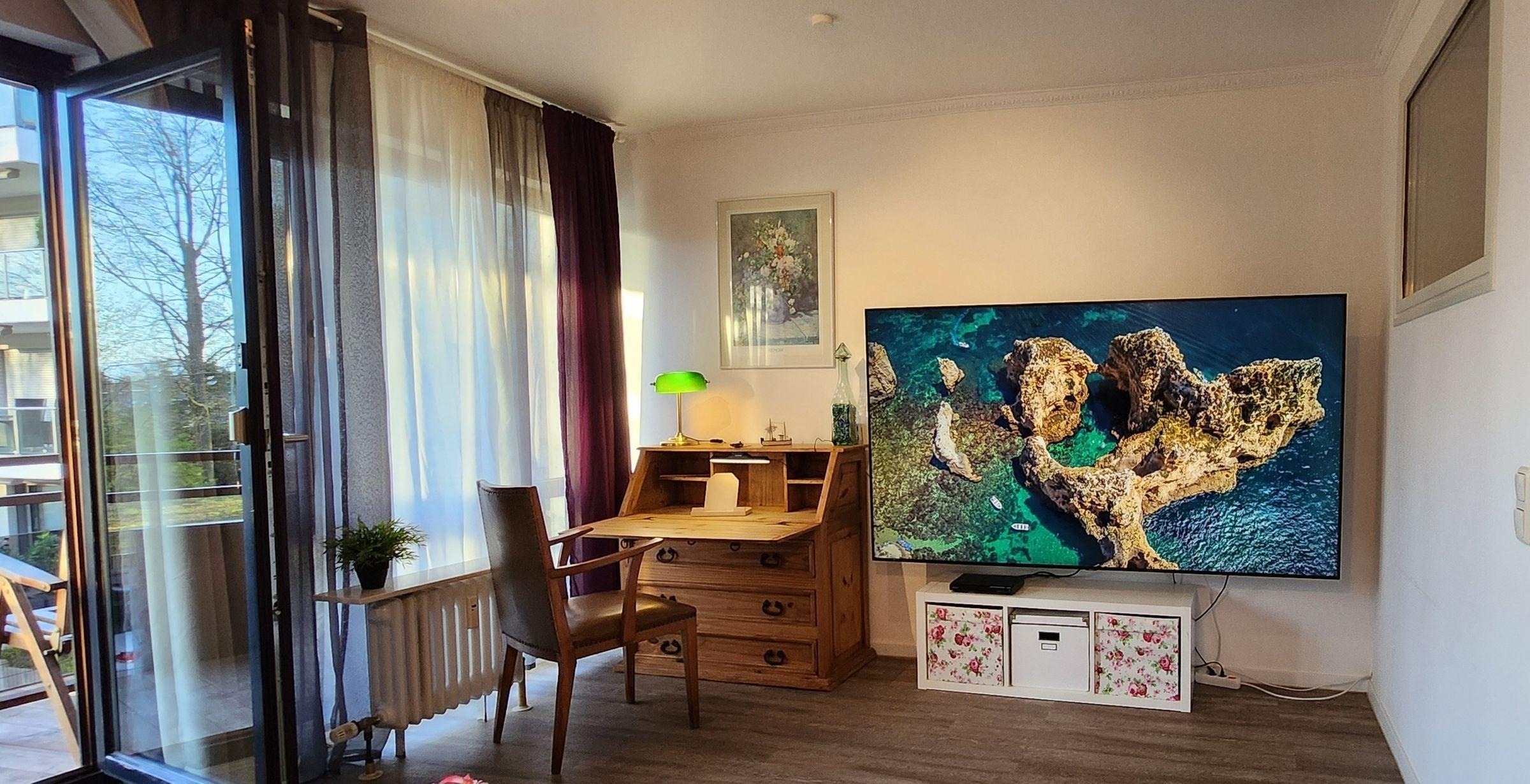 Der Schlafbereich verfügt über ein Doppelbett (90 x 200 cm), ein Sideboard mit einem Flach-TV sowie einen Kleiderschrank mit ausreichendem Stauraum für Ihre Garderobe. Das Fenster geht zum Wohnzimmer.
