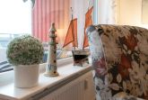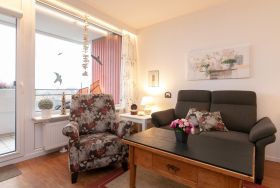 Der helle, kombinierte Wohn- und Schlafbereich ist mit einem Sofa, einem Sessel sowie einem platzsparenden Schrankbett (ca. 2x 90x200 cm) ausgestattet. Für Unterhaltung im Urlaub sorgen der Fernseher und das Radio. Außerdem erwartet Sie eine offene, gut ausgestattete Küche. Die Küchenbar trennt die Küche und den Wohnraum voneinander und dient weiterhin als Essplatz. Das innenliegende Badezimmer ist hell gefliest und mit einer Badewanne ausgestattet. Der überdachte, möblierte Balkon ist zur Seeseite ausgerichtet und lässt Sie den Sonnenaufgang bestaunen. Der WLAN-Anschluss ist selbstverständlich inklusive.
