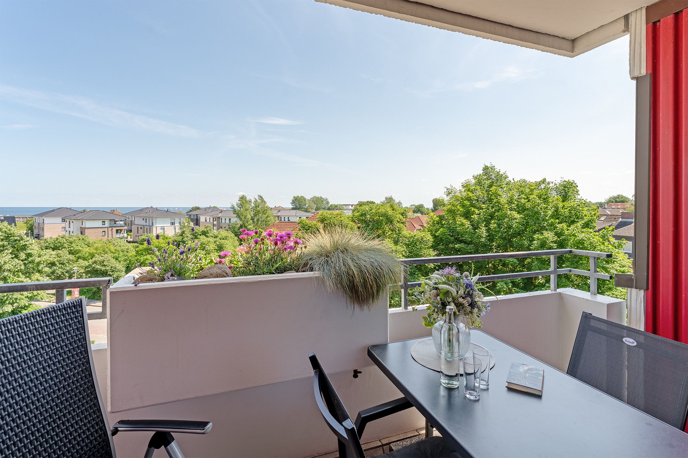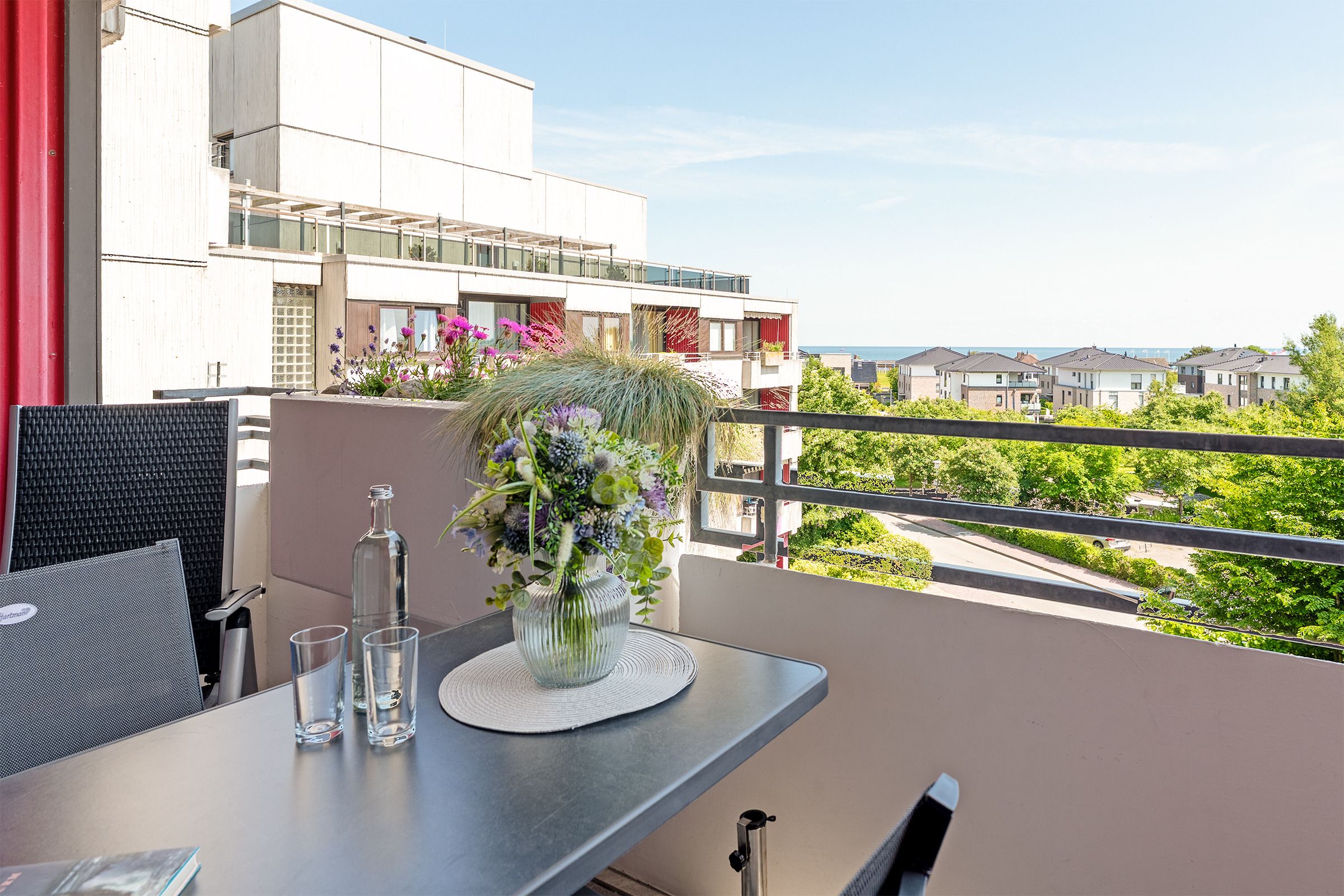 Der kombinierte Wohn- und Schlafraum überzeugt durch eine geschmackvolle Einrichtung mit hellen Möbeln. Es erwarten Sie ein komfortables Doppelbett (2x 90x200 cm), ein Kleiderschrank, ein gemütliches Sofa, ein Sessel sowie internetfähiges SAT-TV mit ca. 90 Sendeplätzen (teilweise in HD-Qualität). Eine moderne, voll ausgestattete Küche z. B. mit Geschirrspüler, Filter- und Kapselkaffeemaschine sowie einem Esstisch für 4 Personen ist ebenfalls vorhanden. Im separaten Schlafzimmer stehen Ihnen zwei Einzelbetten (je 80x200 cm) sowie ein weiterer Kleiderschrank zur Verfügung. Das innenliegende, hell geflieste Badezimmer verfügt über eine Dusche. Von Ihrem Balkon haben Sie einen wunderbaren Ostsee-Fernblick. Der WLAN-Anschluss ist selbstverständlich inklusive.