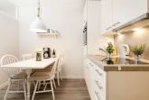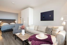 Es erwartet Sie ein heller, kombinierter Wohn- und Schlafraum mit einem komfortablen Boxspring-Doppelbett (180x200 cm, durchgehende Matratze), ein helles Ecksofa sowie ein gemütlicher Sessel. Ihre Urlaubsgarderobe können Sie im Kleiderschrank verstauen und vor dem Flachbildfernseher lassen sich gemütliche Abende verbringen. Im separaten Schlafzimmer erwartet Sie ein Kojenbett (je 80x200 cm) sowie ein weiterer Flachbildfernseher. Die moderne, geschlossene Küche mit Esstisch ist z. B. mit einem Geschirrspüler, einem Kühlschrank sowie einem Backofen in komfortabler Arbeitshöhe sehr gut ausgestattet. Das innenliegende, hell geflieste Badezimmer empfängt Sie mit einer Badewanne. Der WLAN-Anschluss ist selbstverständlich kostenfrei.