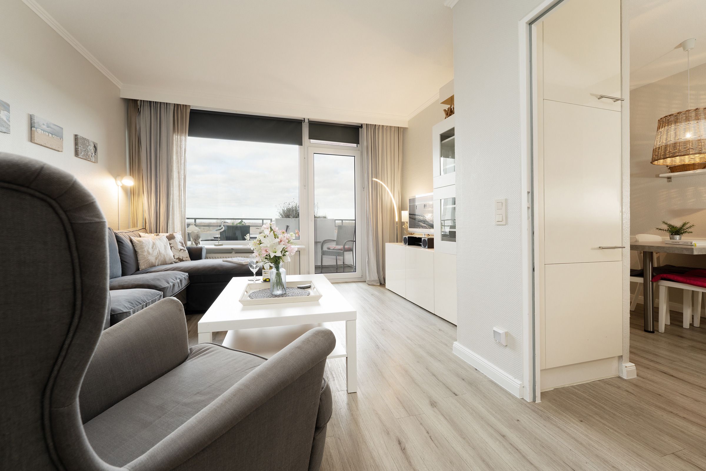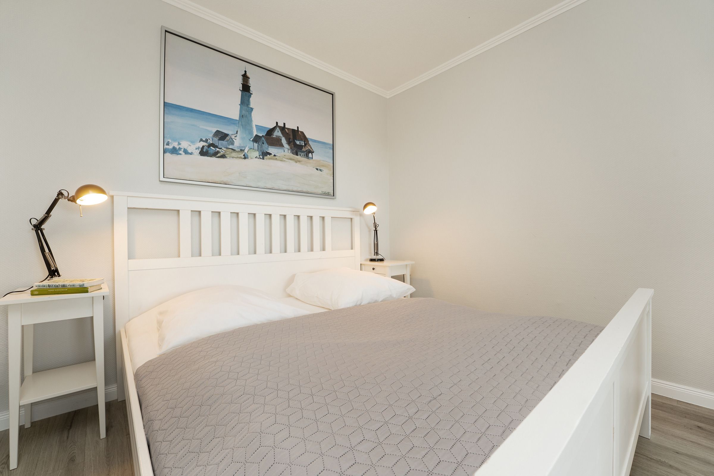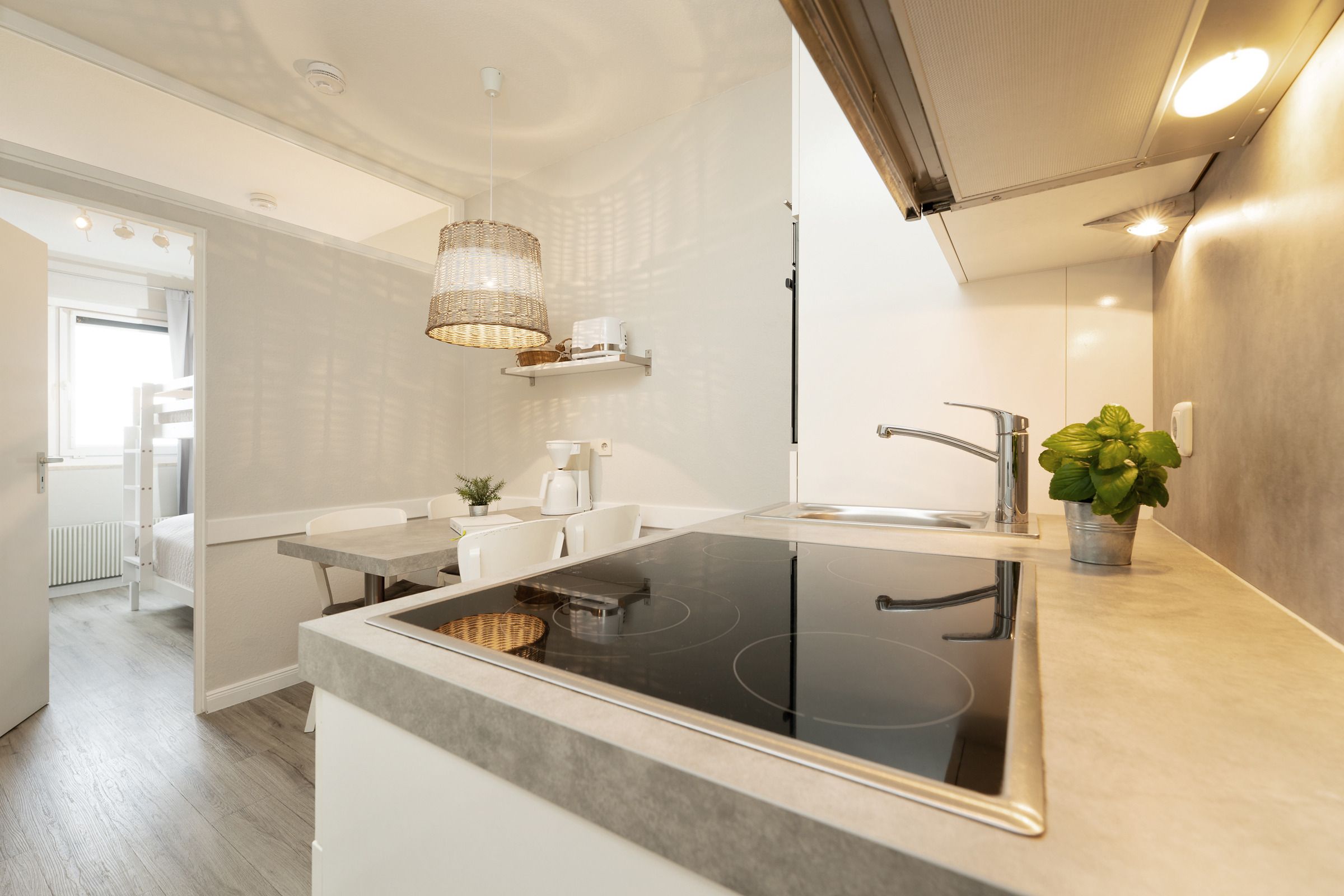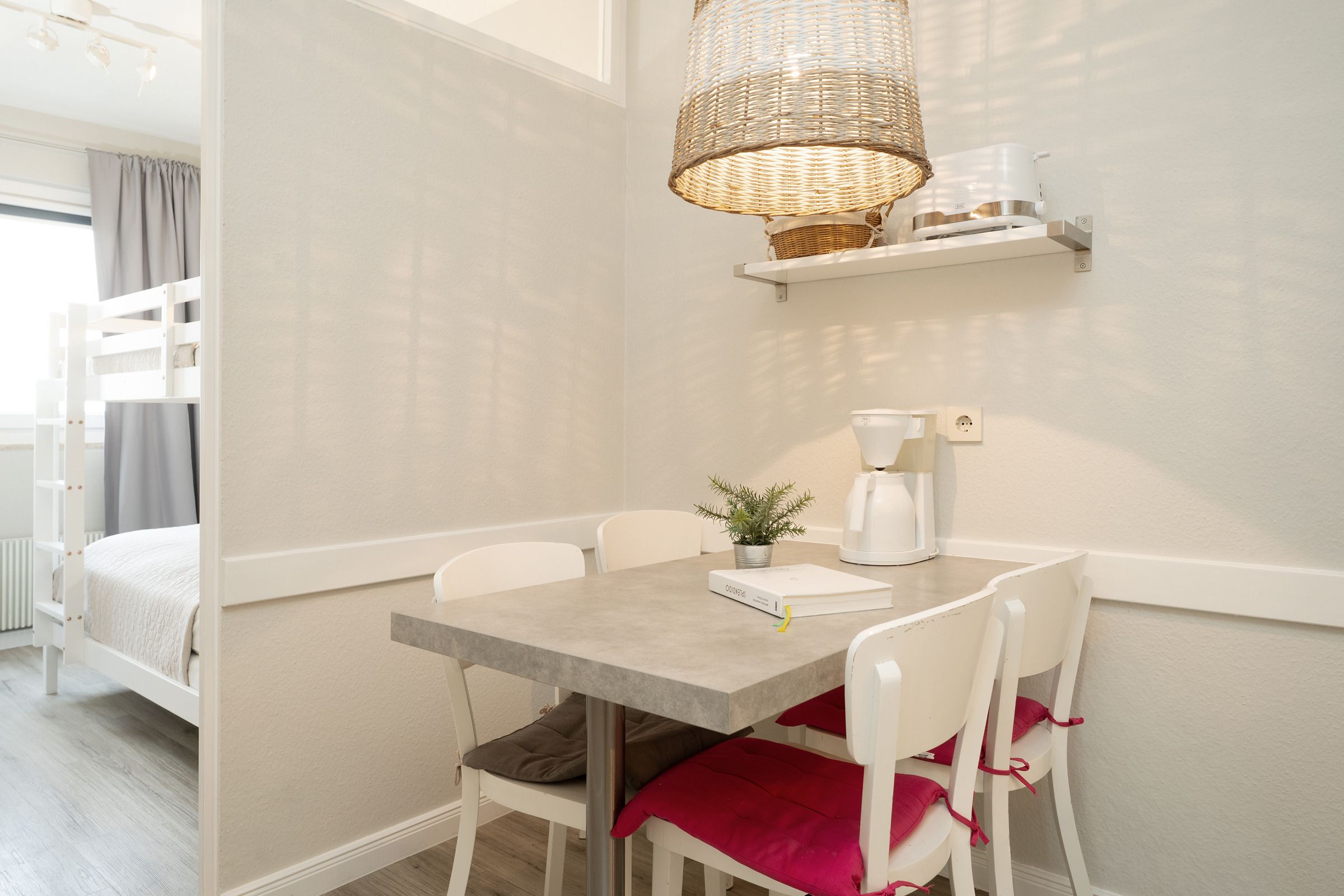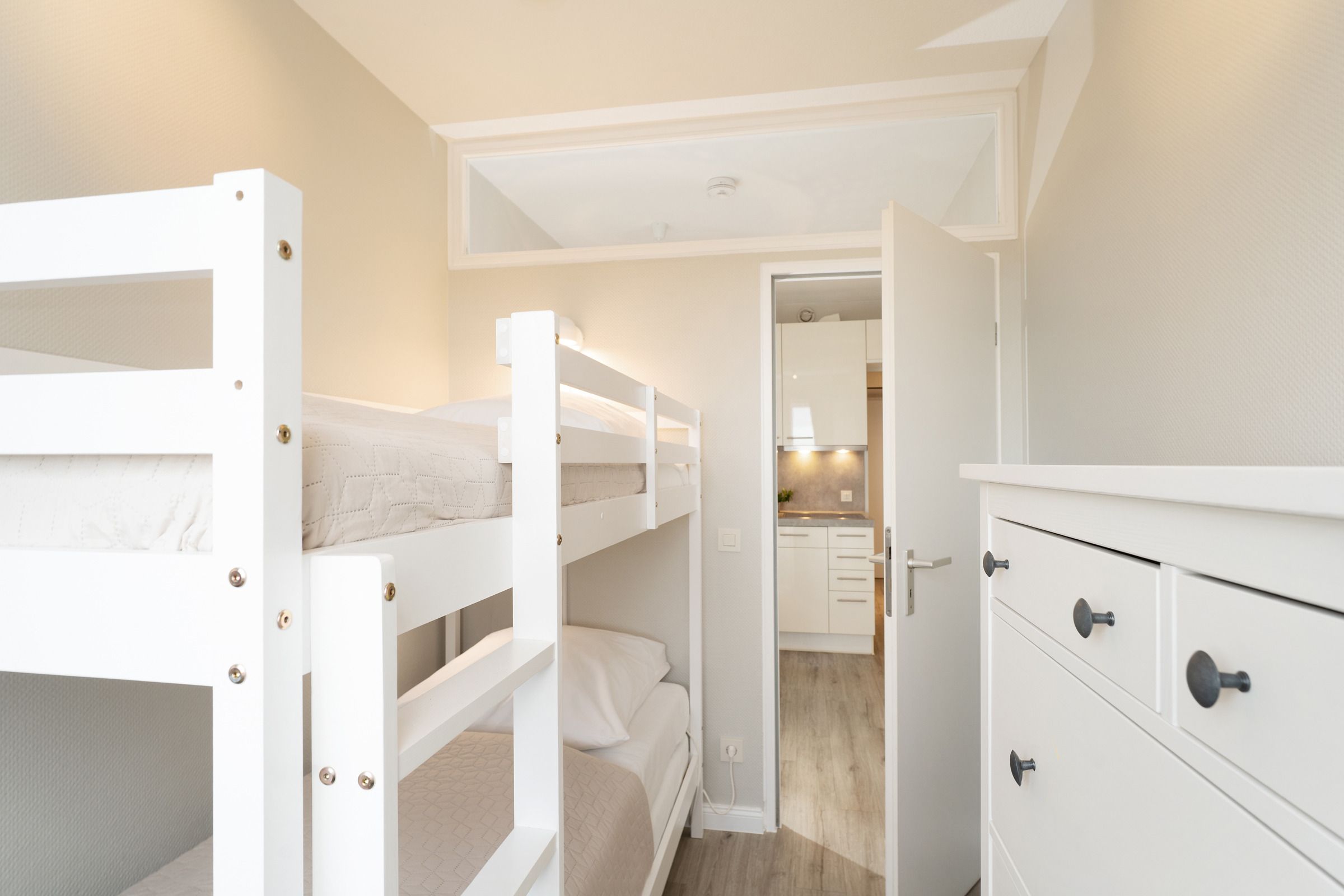 In dieser schönen 2-Zimmer-Ferienwohnung erwartet Sie auf ca. 46 m² ein neu und geschmackvoll eingerichteter Wohn- und Schlafraum mit Doppelbett (2x 90x200 cm), eine gut ausgestattete Küche mit Backofen und Spülmaschine, ein weiterer, separater Schlafraum mit einem Etagenbett (je 90x200 cm) sowie eine Diele und ein Badezimmer.