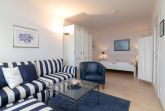 Diese Wohnung setzt Maßstäbe in Bezug auf Ausstattung, Farben und Einrichtung. Der kombinierte Wohn-/Schlafraum ist in maritimem blau und weiss gehalten, von hier aus haben Sie einen fantastischen Blick über die Dächer von Dahme auf die Ostsee.