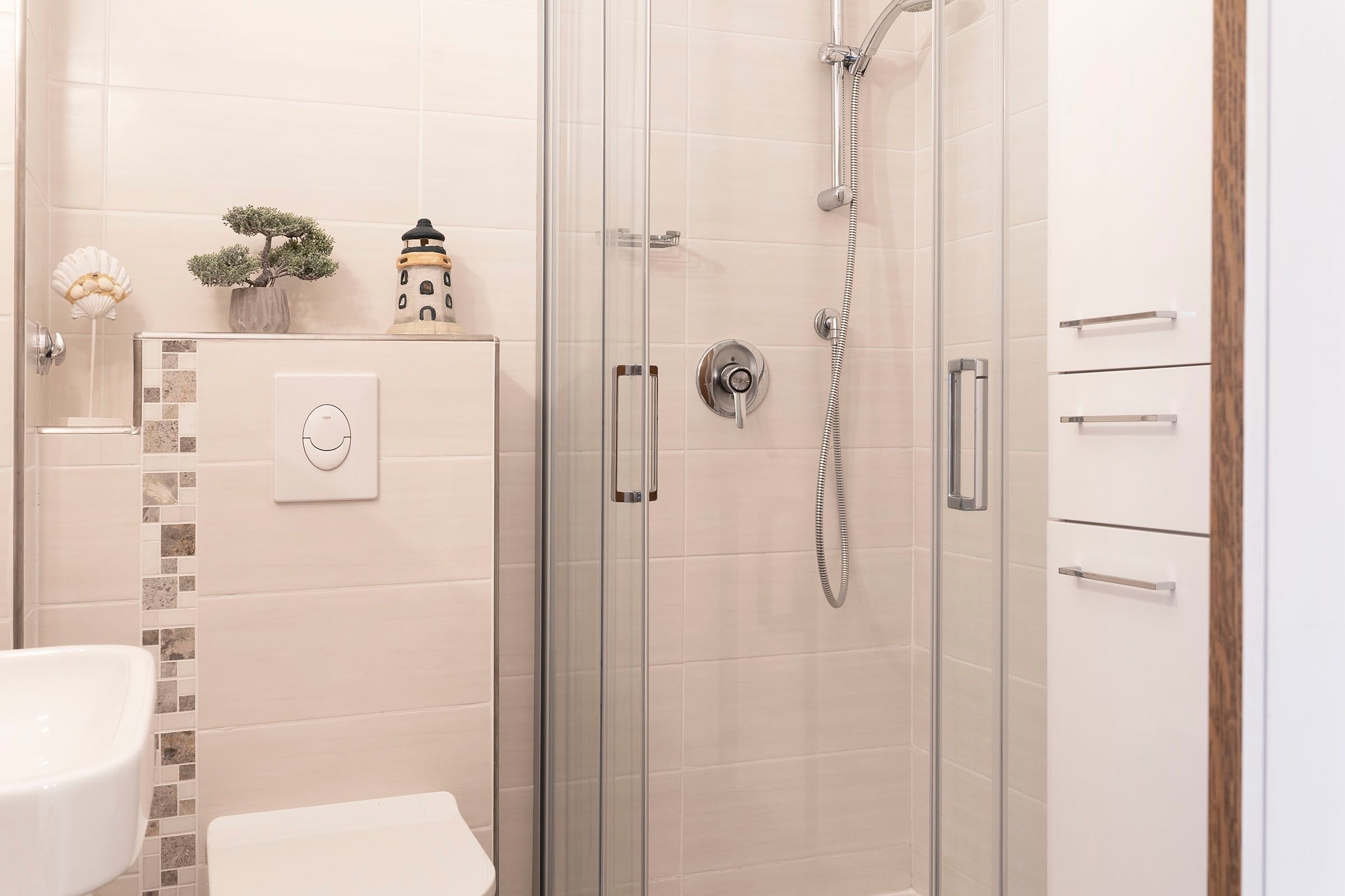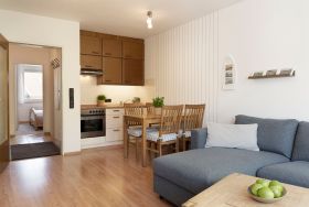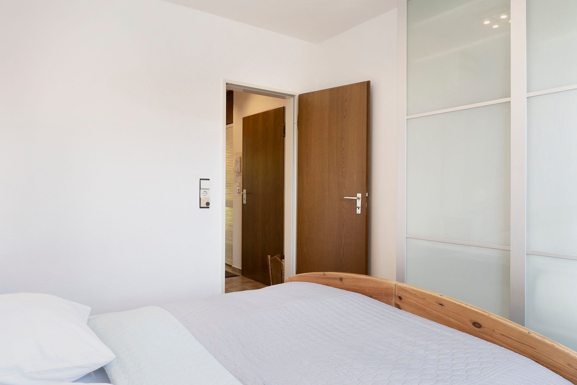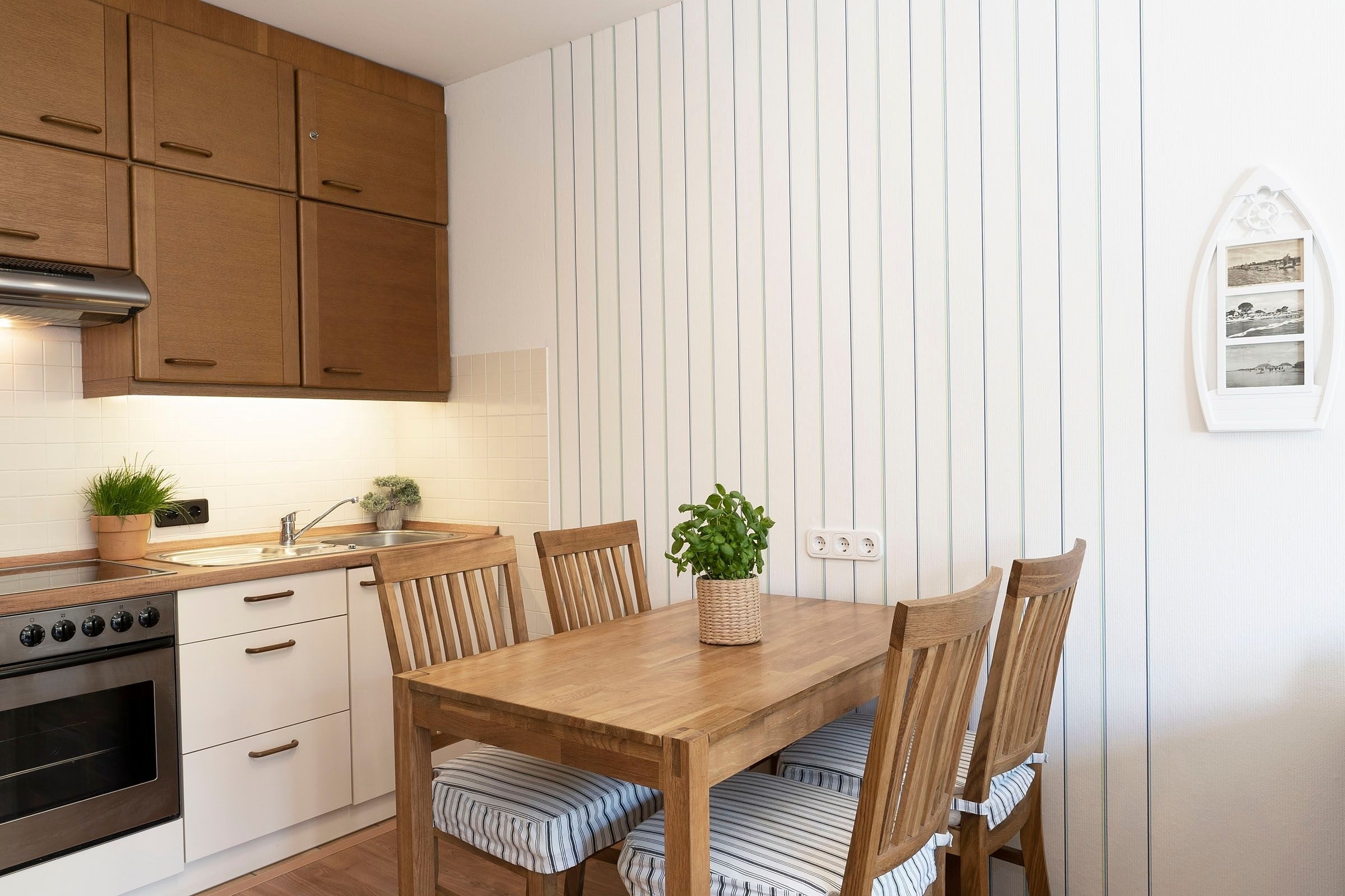 Der moderne Wohnbereich überzeugt mit gemütlicher Couch, die bei Bedarf in einen weiteren Schlafplatz (2x 90x200 cm) für 2 Personen verwandelt werden kann und der Flachbild-Fernseher sorgt auch an Regentagen für ausreichend Unterhaltung. Von hier aus haben Sie Zugang auf den möblierten Balkon, auf dem Sie die herrlich salzige Ostseeluft schnuppern können. Dank der offenen Küchenzeile können Sie sich im Urlaub problemlos selbst verpflegen und haben am Esstisch ausreichend Platz die schmackhaften Köstlichkeiten gemeinsam zu genießen. Im separaten Schlafzimmer mit Kleiderschrank lädt ein bequemes Doppelbett (2x 90x200 cm) zum Träumen ein. Das Duschbad rundet die Ausstattung dieser Ferienwohnung ab.