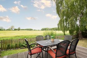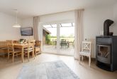 Die gesamte Wohnung ist allergikerfreundlich gefliest, es gibt einen Specksteinkamin und eine wunderschöne Bankirai-Holzterrasse, ein hell gefliestes Bad mit Dusche, einen Flat-TV im Wohnzimmer und vieles mehr. Hier finden Sie die Erholung und die Ruhe, die Sie sich verdient haben. Ihr großzügig geschnittener Wohnraum mit Essecke und die zwei separaten Schlafräume lassen keine Wünsche offen. Ein Schlafzimmer ist mit einem komfortablen Doppelbett (180x200 cm) ausgestattet, ein weiteres Schlafzimmer verfügt über zwei Einzelbetten (je 90x200 cm). Die gut ausgestattete Küche mit Ceranfeld erwartet Sie ebenfalls. Grillen Sie direkt am Feld und lassen Sie die Seele baumeln. Herzlich Willkommen im Urlaub!