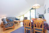 Der Flur hält ausreichend Stauraum für Ihre Jacken und Schuhe bereit. Der Wohn- und Essbereich ist geräumig und durch die große Fensterfront stets hell und lichtdurchflutet. Nehmen Sie Platz auf dem gemütlichen Sofa oder einem der zwei bequemen Sessel und lassen Sie die Abende vor dem Fernseher ausklingen. Vom Wohnbereich aus gelangen Sie auf den kleinen, möblierten Südbalkon, der zu erholsamen Stunden einlädt. Die moderne Küche mit hellen Fronten ist z. B. mit einem 4-Platten-Cerankochfeld, einem Geschirrspüler und einer Senseo-Kaffeemaschine gut ausgestattet. Die Wohnung verfügt über zwei separate Schlafzimmer: Eines mit einem Doppelbett (2x 90x200 cm) und eines mit zwei getrennt stehenden Einzelbetten (je 90x190 cm). Die Velux-Fenster in beiden Schlafzimmern lassen sich durch elektrische Rollläden angenehm abdunkeln, sodass Sie im Urlaub Ihren wohlverdienten Schlaf erhalten. Im innenliegenden, hell gefliesten Badezimmer erwartet Sie eine Dusche und sogar ein beheizbarer Handtuchhalter. Der WLAN-Anschluss ist selbstverständlich inklusive. Zusätzlich steht Ihnen der gemeinschaftlich genutzte Garten für eine ausgiebige Runde Federball oder gesellige Stunden im Freien zur Verfügung.