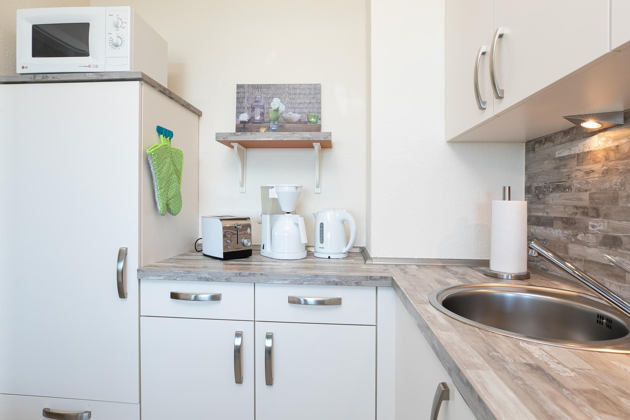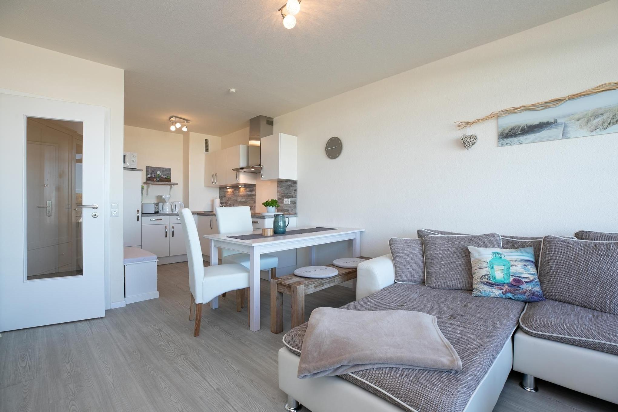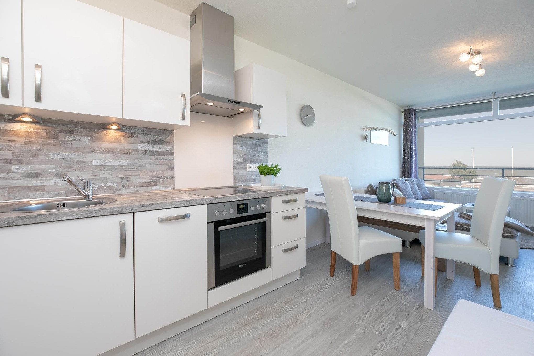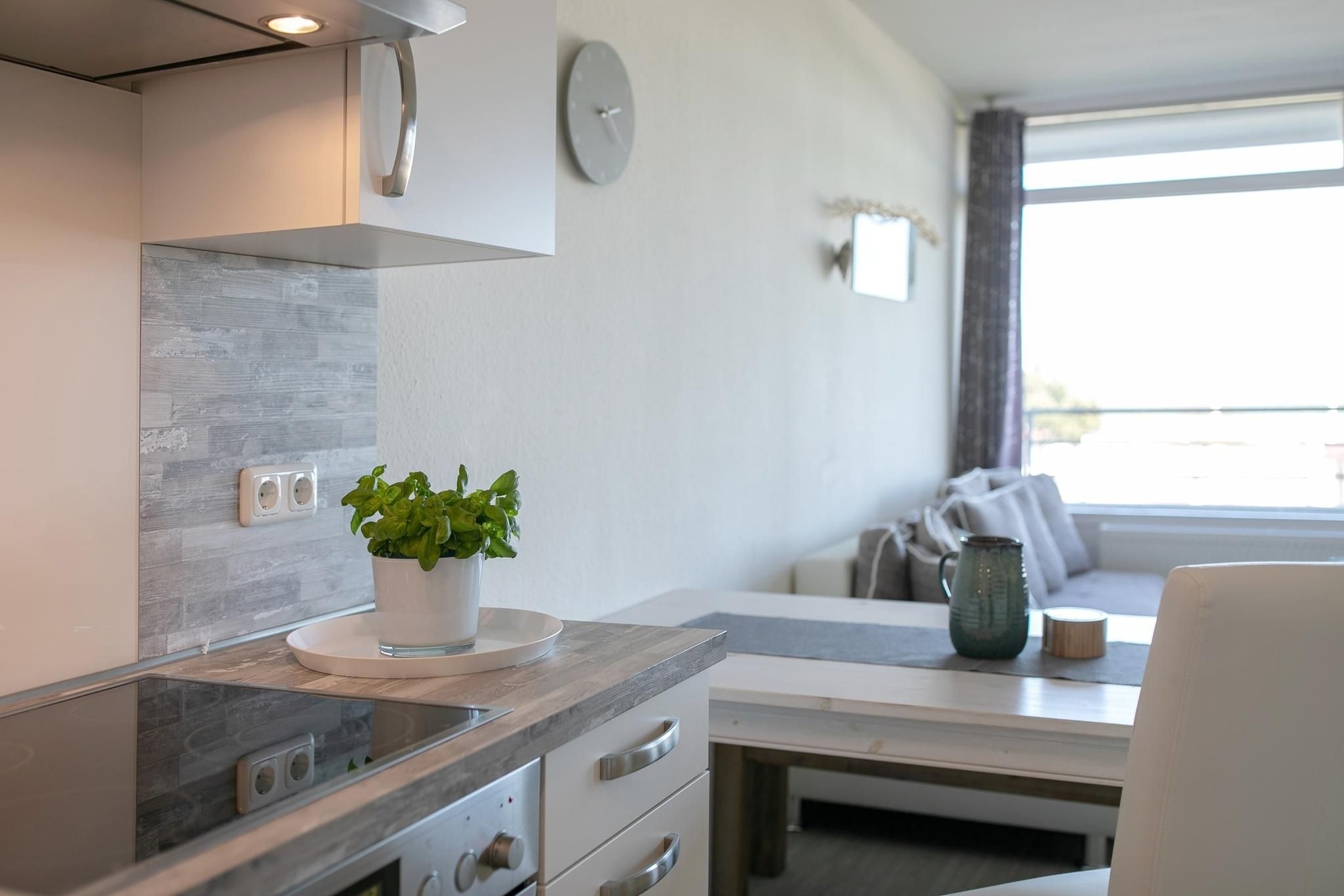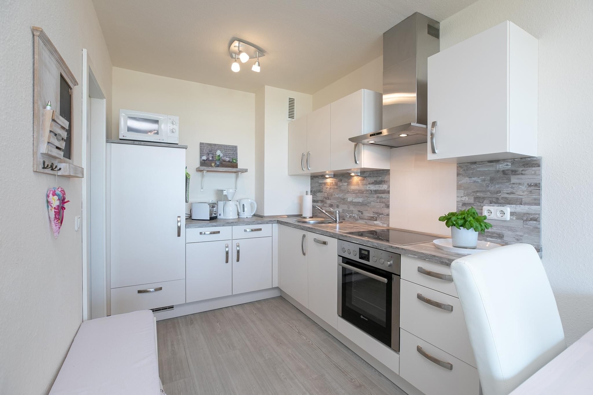 Der lichtdurchflutete Wohnbereich mit einer neuen traumhaften offenen Küche, die hellen Möbel, das moderne Interieur - hier kann man sich nur wohlfühlen. Im Schlafzimmer genießen Sie die Nächte in einem gemütlichem Doppelbett (160x200cm), das Bad mit Dusche und ein kleiner Flur runden dieses Urlaubsappartement in der 2. Etage ab.