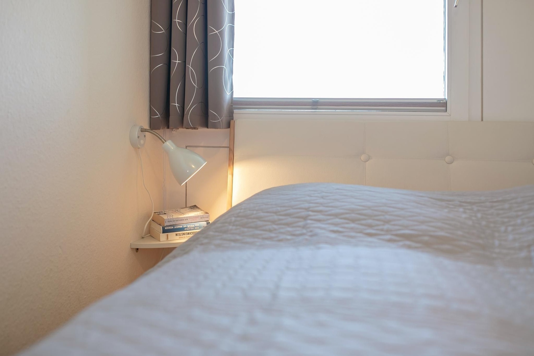 Schlafzimmer: 1 Doppelbett (160x200cm, durchgehende Matratze), Kleiderschrank, Verdunkelungsmöglichkeit (Plissees, Gardine)