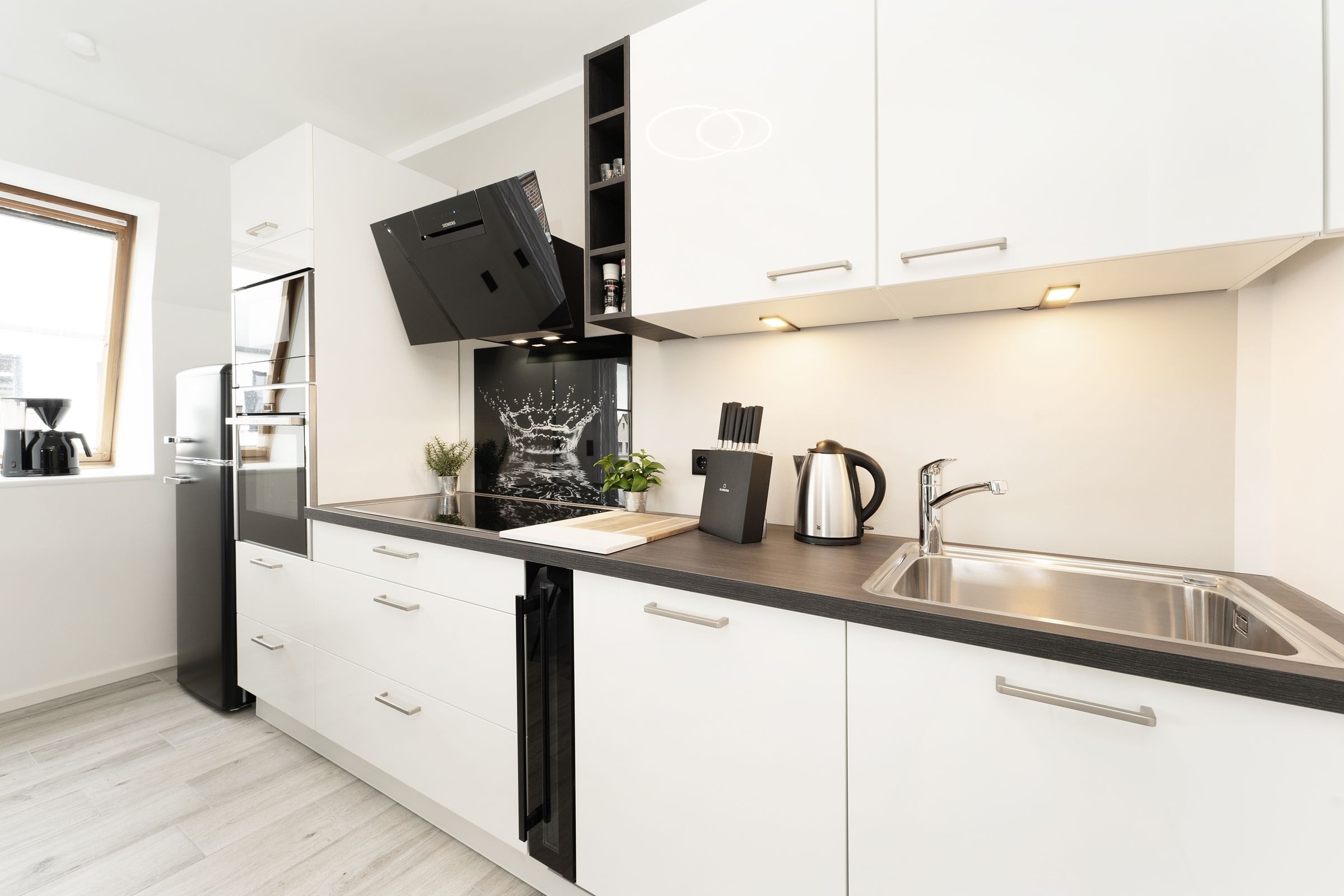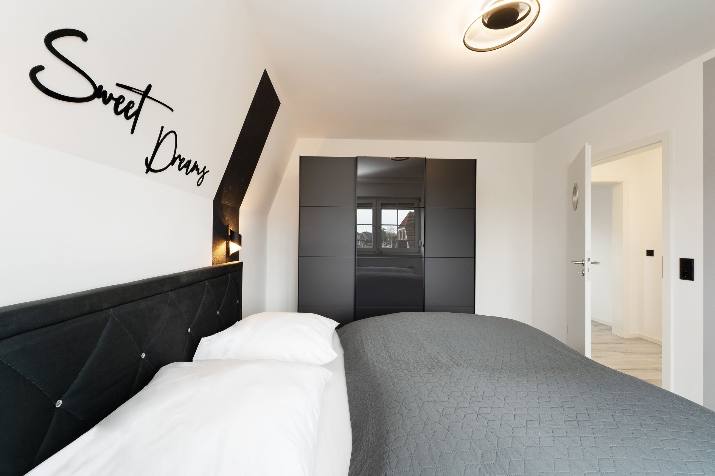 Urlaub der Extraklasse: Hier trifft Qualität auf modernen Schick – die Einrichtung der gesamten Wohnung wurde stilsicher und liebevoll ausgesucht. Vom Flur mit Garderobe und LED-Spiegel können Sie alle Räume betreten. Machen Sie es sich im lichtdurchfluteten Wohnzimmer auf der Sofalandschaft gemütlich und lassen Sie sich musikalisch von Alexa oder dem internetfähigen TV-Gerät unterhalten. Oder genießen Sie ein gutes Buch an der frischen Seeluft auf dem möblierten Balkon mit Sonnenmarkise. Die offene, hochwertig ausgestattete Küche lädt zum gemeinsamen Kochen ein. Neben Extras wie Induktionsherd und Geschirrspüler punktet die Küche mit einem Weinkühlschrank, der 7 Flaschen Ihres Lieblingsweins kühlt. Angenehm nächtigen werden Sie im rückenfreundlichen Boxspring-Doppelbett (180x200 cm) im Schlafzimmer. Zudem lässt sich das Sofa im Wohnbereich in ein komfortables Bett (150x230 cm) verwandeln. Das edle Bad überzeugt mit bodengleicher Dusche und Handtuchwärmer. Praktisch: Verbinden Sie Ihr Handy über Bluetooth mit dem Badezimmerspiegel und starten Sie mit Ihrer Lieblingsmusik in den neuen Urlaubstag.