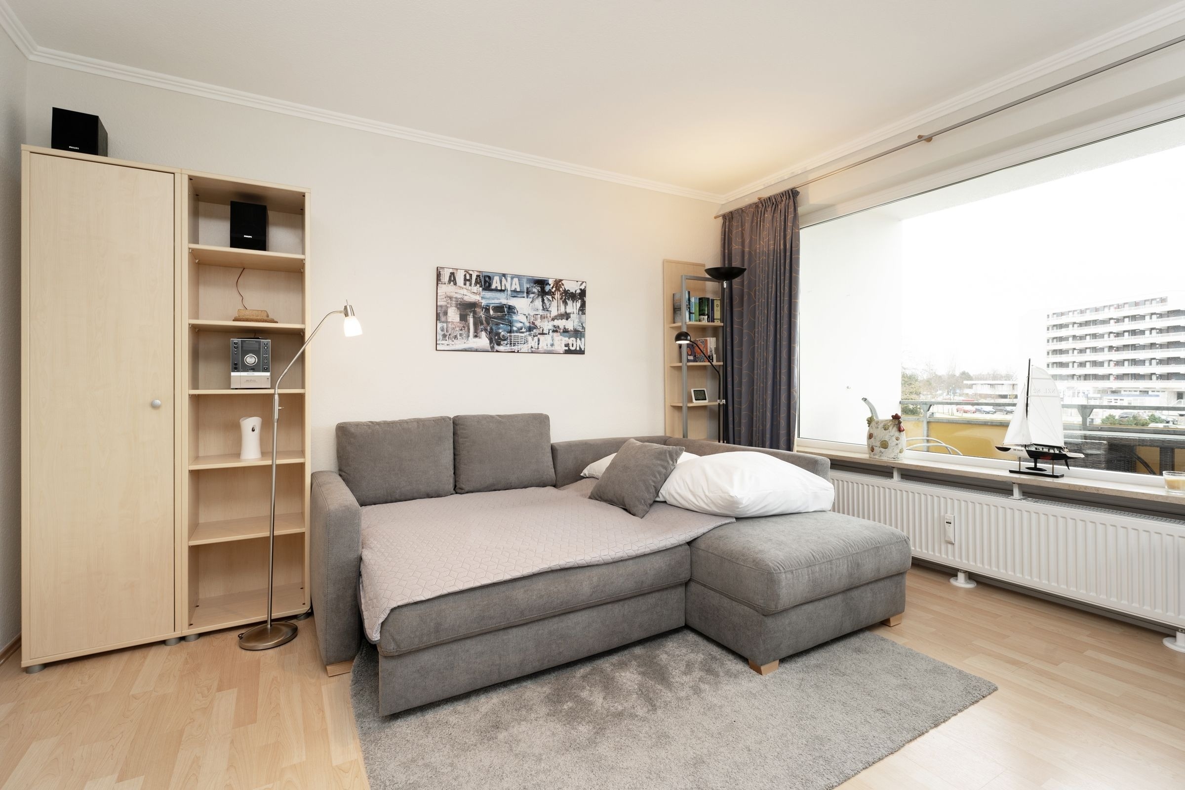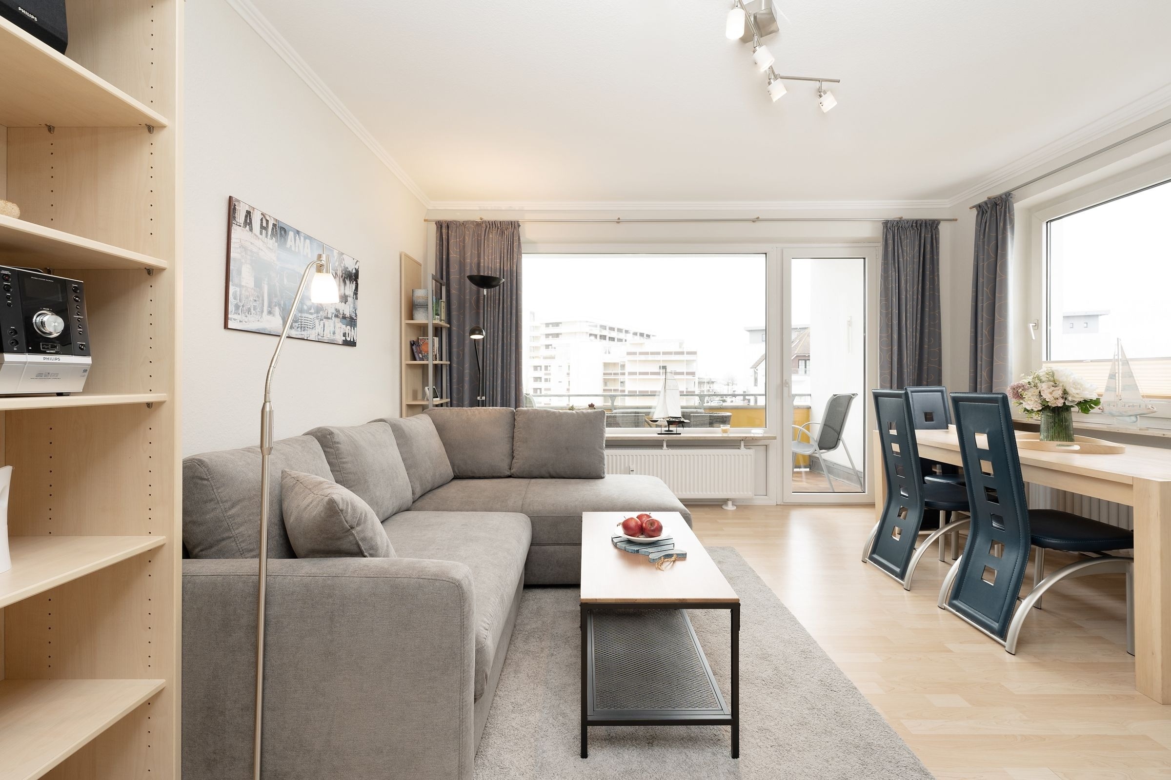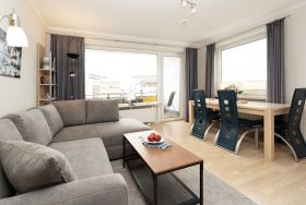 In der modernen und gut ausgestatteten Küche können Sie mit Freude leckere Ferienmahlzeiten zubereiten. Machen Sie es sich im Wohnzimmer mit angrenzendem Essbereich gemütlich. Der Ausblick vom möblierten Balkon führt über den Deich in Richtung der entfernten, blau funkelnden Ostsee. Die Süd-Ost-Ausrichtung Ihres Balkons garantiert Ihnen zudem viele Sonnenstunden. Im Schlafzimmer sorgt ein Doppelbett (2 x 80x195 cm) für erholsamen Schlaf nach langen Strandspaziergängen oder ausgiebigen Einkaufstouren. Eine zusätzliche Schlafgelegenheit bietet das Schlafsofa (ca. 140x215 cm) im Wohnbereich.