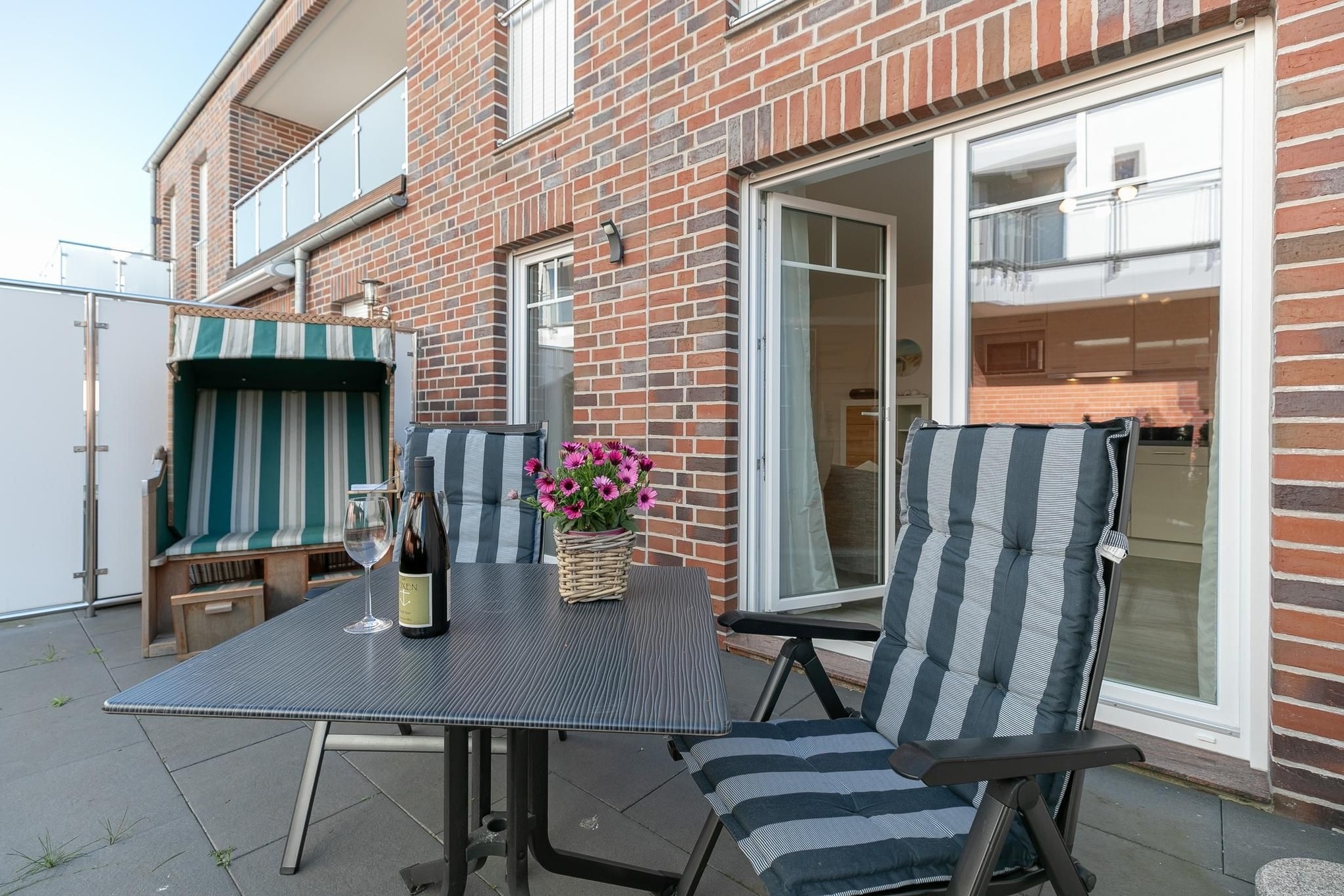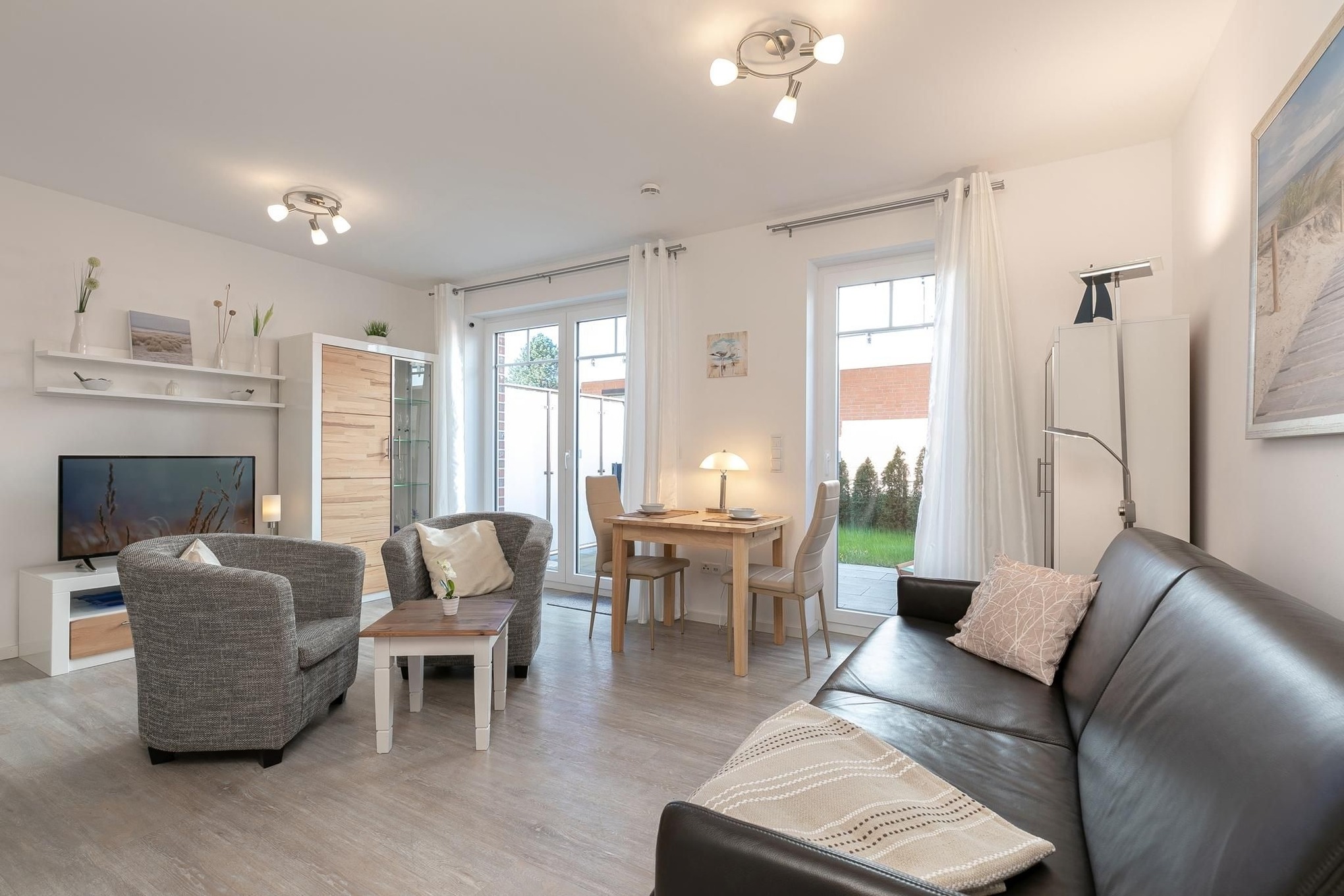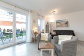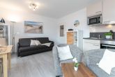 Ihr Feriendomizil überzeugt mit lässig-modernem Design und klarer, frischer Gemütlichkeit. Das gesamte Interieur ist hochwertig, Farben und Materialien sind gekonnt harmonisch aufeinander abgestimmt. Ein angenehmes, ästhetisch ansprechendes Wohnumfeld, indem man sich rundum wohlfühlt. Das Entrée der Wohnung ist elegant und mit praktischen Garderobenhaken und Kleiderschrank versehen. Der offene, lichtdurchflutete Wohn-/Schlafraum mit hochwertiger Schlafcouch (Liegefläche ca. 160x200 cm), einem großen Flatscreen-TV und direktem Ausgang zur Sonnenterrasse begrüßt Sie gemütlich und hell. Raffiniert integriert bietet die gut ausgestattete Küchenzeile mit 2-Platten-Ceranfeld und Geschirrspüler einige Annehmlichkeiten, hier bereiten Sie mit Leichtigkeit leckere Ferienmenüs. Das stilvolle Designbad überzeugt mit ebenerdiger Dusche, Hänge-WC, beleuchtetem Spiegel und eigener Waschmaschine. Kostenfreies WLAN ist vorhanden. Machen Sie es sich auf der sonnigen, möblierten Terrasse bequem und genießen Sie hier im eigenen Strandkorb den ersten Kaffee am Morgen oder besinnliche Abende zu zweit.