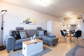 Helle und gemütliche, ca. 52 m² große Ferienwohnung für max. 3 Personen in der 1. Etage im Haus Belvedere direkt am Deich von Grömitz.