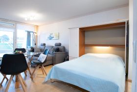 Der lichtdurchflutete Wohn- und Essbereich ist mit einem gemütlichen Ecksofa, einem Esstisch mit 4 Stühlen, einem Flat-TV sowie einer Spielesammlung und diversen Büchern ausgestattet. Das vorhandene Schrankbett (140x200 cm) dient als Schlafmöglichkeit für 2 Personen und ist vom Flur aus über 3 Stufen zu erreichen. Die moderne Küchenzeile ist in den Wohnbereich integriert und mit Annehmlichkeiten wie Kühlschrank mit Gefrierfach, Spülmaschine, Cerankochfeld, Backofen und Mikrowelle ausgestattet. Vom Wohnbereich geht es direkt auf den großzügig geschnittenen und ebenso geschützten Balkon mit Südostausrichtung. Dieser bietet mit einer Fläche von ca. 12 m² eine weitere herrliche Aufenthaltsmöglichkeit mit frischer Seeluft und Blick über den Deich! Ein Sonnenschirm schützt an sonnigen Tagen vor zu starker Sonneneinstrahlung. Im Schlafzimmer befinden sich ein Doppelbett (2x 90x200 cm), 2 Nachttische, ein Flat-TV sowie ein geräumiger Kleiderschrank mit Safe. Ein kostenfreier W-LAN Anschluss steht Ihnen selbstverständlich zur Verfügung. Außenjalousien sorgen für angenehme Verdunklung. Das hell geflieste Badezimmer ist komfortabel mit Eckdusche, WC, Waschbecken und Spiegel ausgestattet.