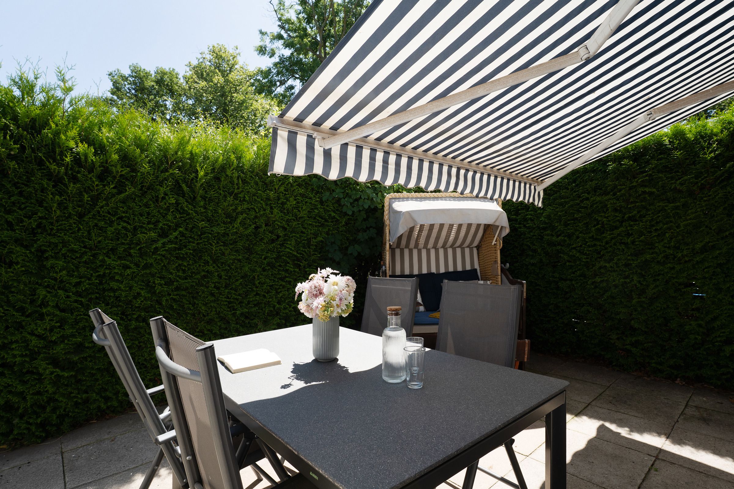 Im Sommer ist die große, kaum einsehbare Terrasse mit Südwestausrichtung besonders zu empfehlen. Hier können Sie in Ruhe frühstücken oder abends im Strandkorb den Sonnenuntergang genießen.