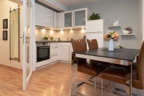 Der großzügige und lichtdurchflutete Wohnbereich mit offener Küche bildet das Herz dieser traumhaften 2-Zimmer-Wohnung. Eine hochwertige Leder-Sofalandschaft lädt zu gemütlichen Fernseh-Abenden ein. Die moderne Küche mit ihrem angrenzenden Essbereich bietet alle Annehmlichkeiten, die ein Hobby-Koch-Herz höher schlagen lässt: