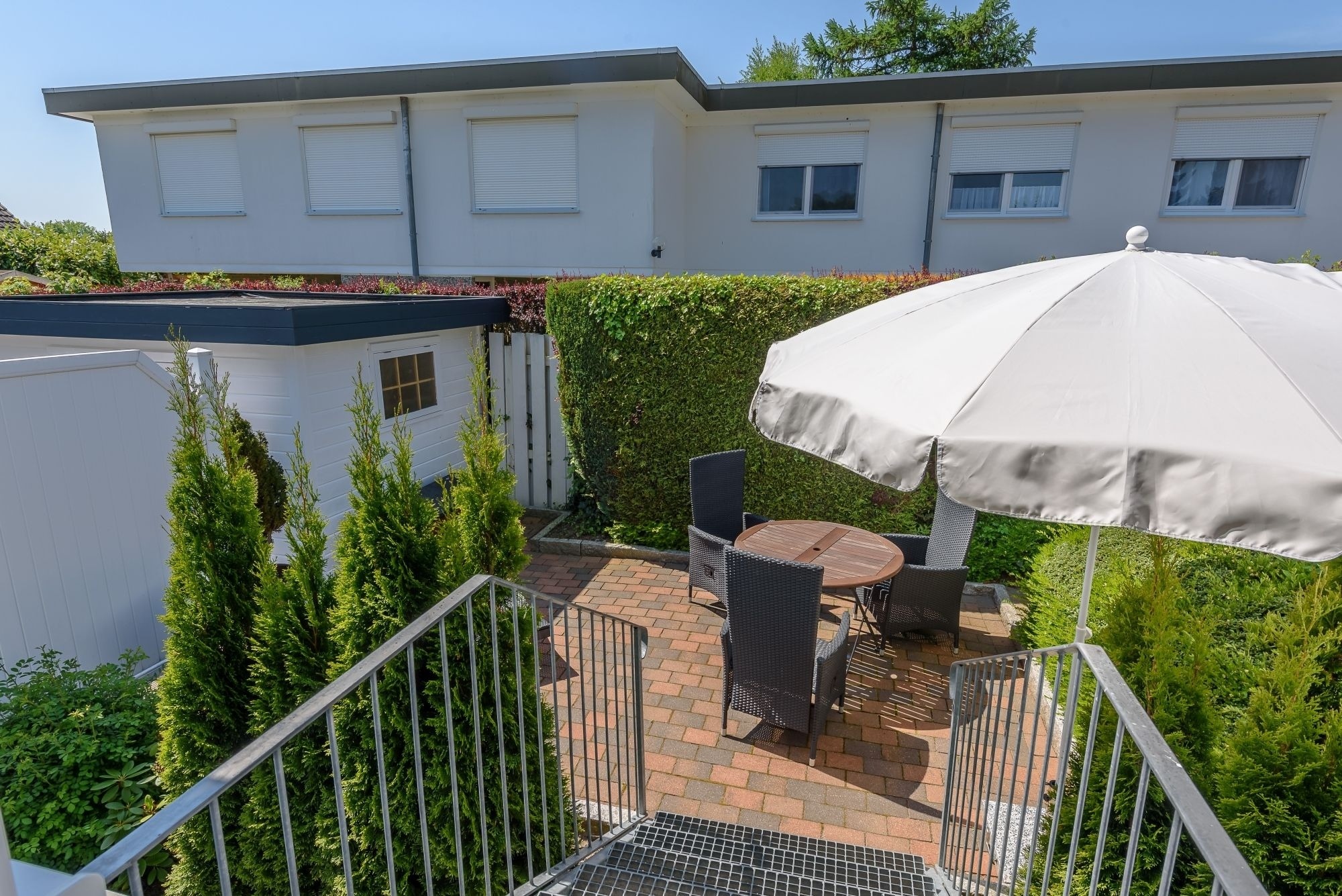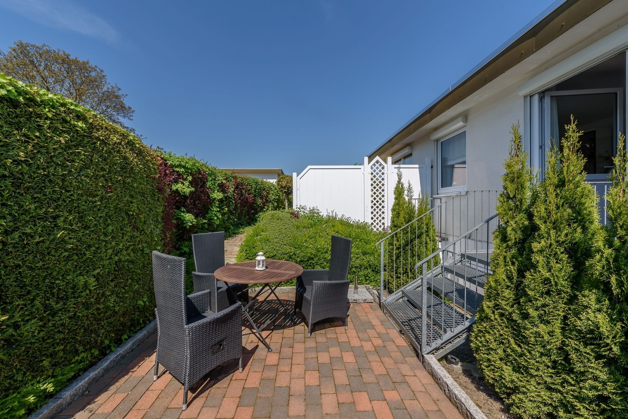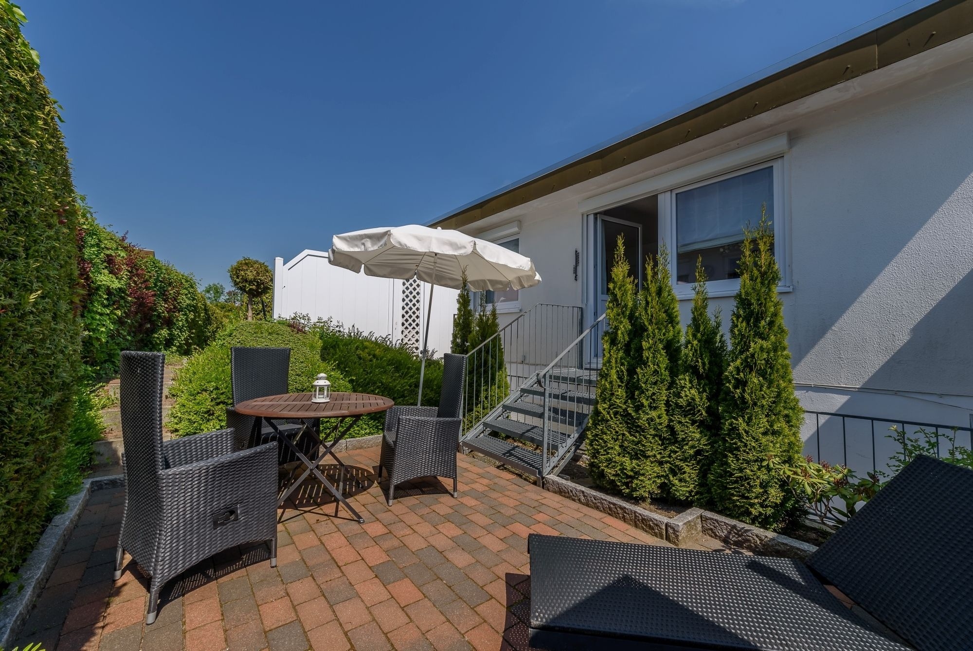 Über eine kleine Treppe gelangen Sie zum absoluten Schmuckstück der Ferienwohnung: Die idyllisch und blickdicht angelegte Terrasse mit Südausrichtung. Völlig ungestört genießen Sie hier einen heißen Kaffee am Morgen oder eine leckere Grillwurst am Abend. Das weiß geflieste Badezimmer verfügt über eine Dusche und reichlich Abstellfläche. Erholsame Nachtruhe finden Sie im angrenzenden Schlafzimmer. Das komfortable Bett verfügt über