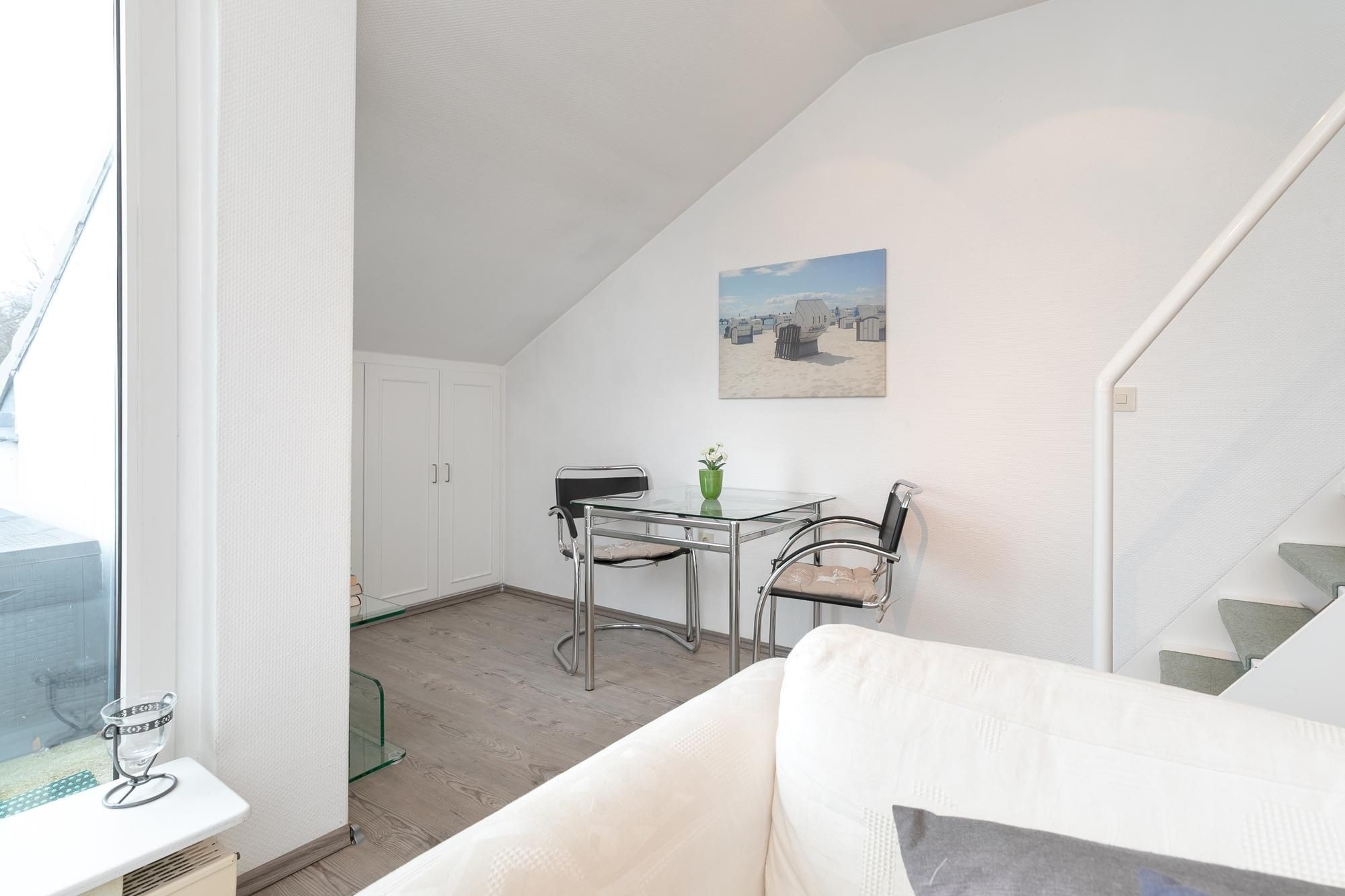 Über den Eingangsbereich gelangen Sie in das Kernstück der Wohnung, ein großzügiges Wohnzimmer mit Sofaecke inklusive bequemem Schlafsofa (Liegefläche 2x 80x200 cm), integrierter Küchenecke mit praktischen Annehmlichkeiten wie einer Mikrowelle, Cerankochfeld und Backofen, sowie angrenzendem Essplatz. Vom Wohnbereich führt eine Treppe zum offenen Schlafbereich im Obergeschoss, hier ruhen Sie gemütlich unter der Dachschräge im Doppelbett (2x90x200cm). Diverse Wandschränke bieten Stauraum für Ihre Urlaubsgarderobe. Für Unterhaltung sorgen ein Flatscreen-TV, CD- und DVD-Spieler, Radio, WLAN und eine Nintendo Spielekonsole , hier wird es also auch an Regentagen nicht langweilig. Ebenso über den Flur erreichbar, ist das hell geflieste Duschbad mit moderner Ausstattung und Annehmlichkeiten wie eine großzügige Eckdusche, Wandschränkchen , Waschtisch und beleuchtetem Spiegel. Ein besonderes Highlight der Wohnung ist schließlich der schöne möblierte Balkon mit Blick ins Grüne und sonnenreicher Südwestausrichtung. Entspannen Sie hier nach langen Strandtagen und genießen die herrliche Ostseeluft!