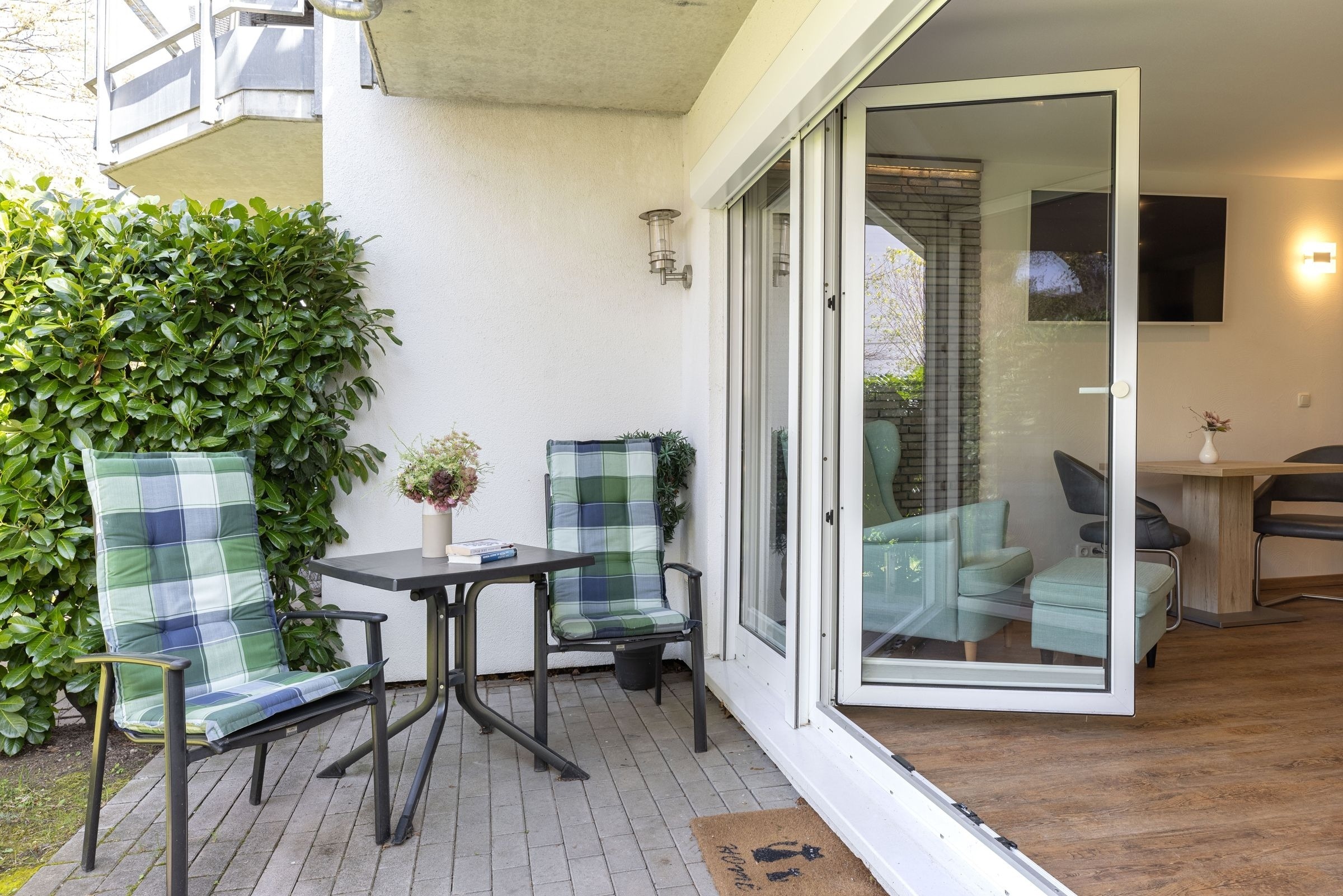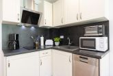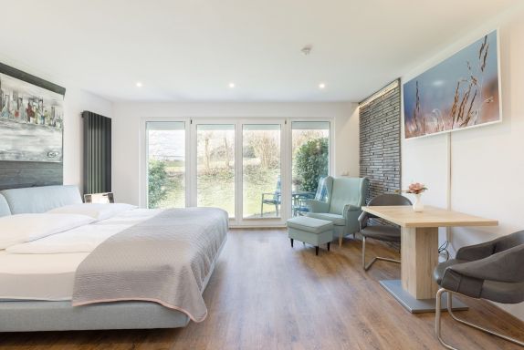 Der kombinierte Wohn-Schlafraum bietet Zugang zur lauschigen Terrasse. Hier starten Sie den Tag mit einem leckeren Frühstück oder lassen die milden Sommerabende ganz in Ruhe ausklingen. Ein hochwertiges Boxspring-Bett (2x 90x200 cm) sorgt für ausreichend Schlaf und Erholung. Keine Lust auf einen Restaurantbesuch? Kein Problem! In der offen integrierten Küche finden Sie alles, was Sie für einen gemütlichen Kochabend zu Zweit benötigen. Das kleine aber feine Luxus-Bad überzeugt mit einer ebenerdigen Dusche und modernem Design.