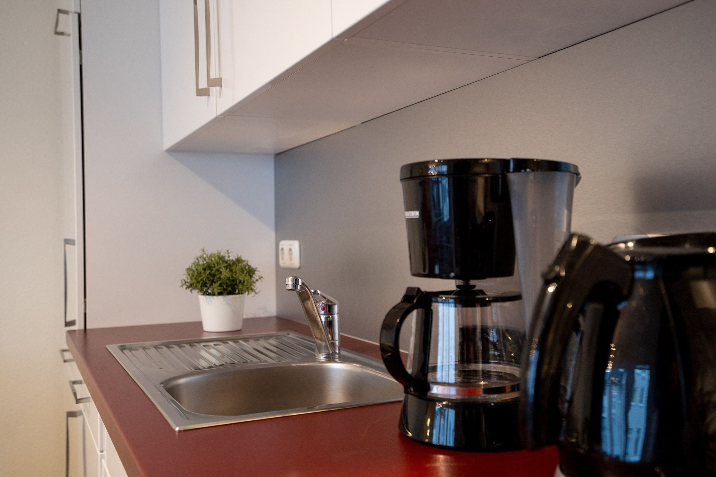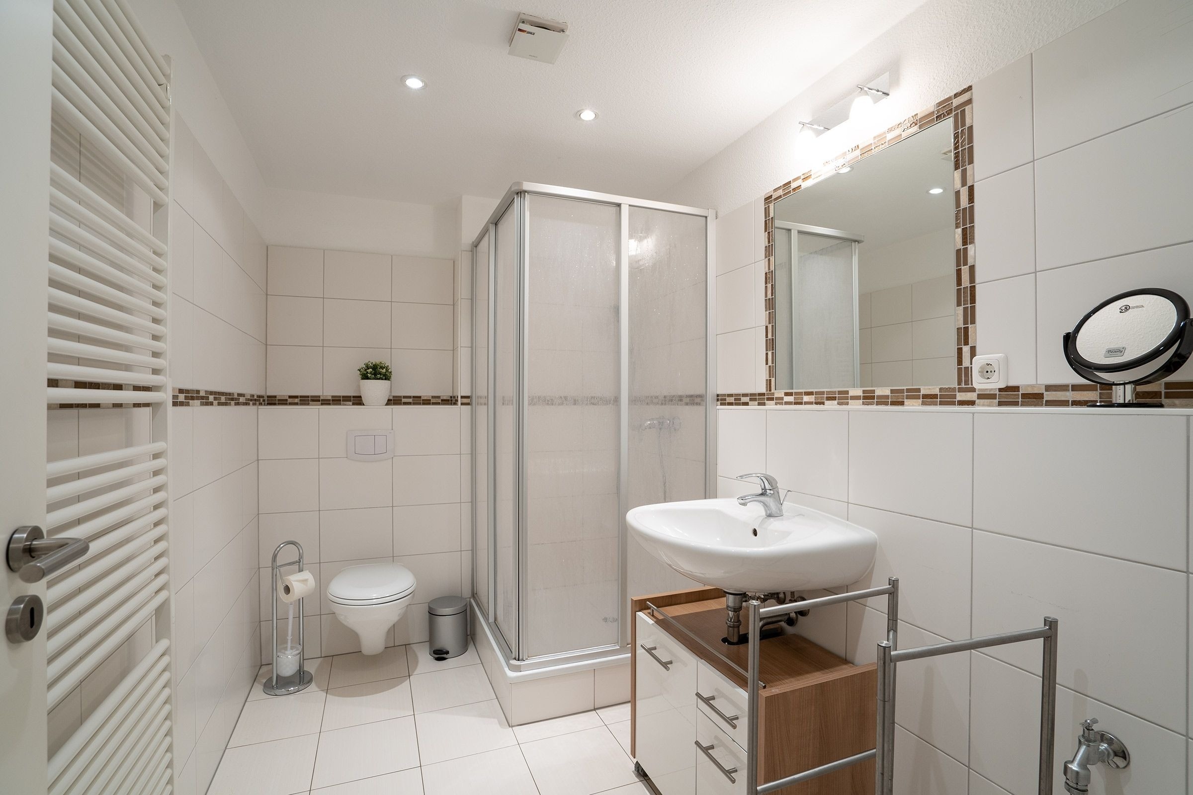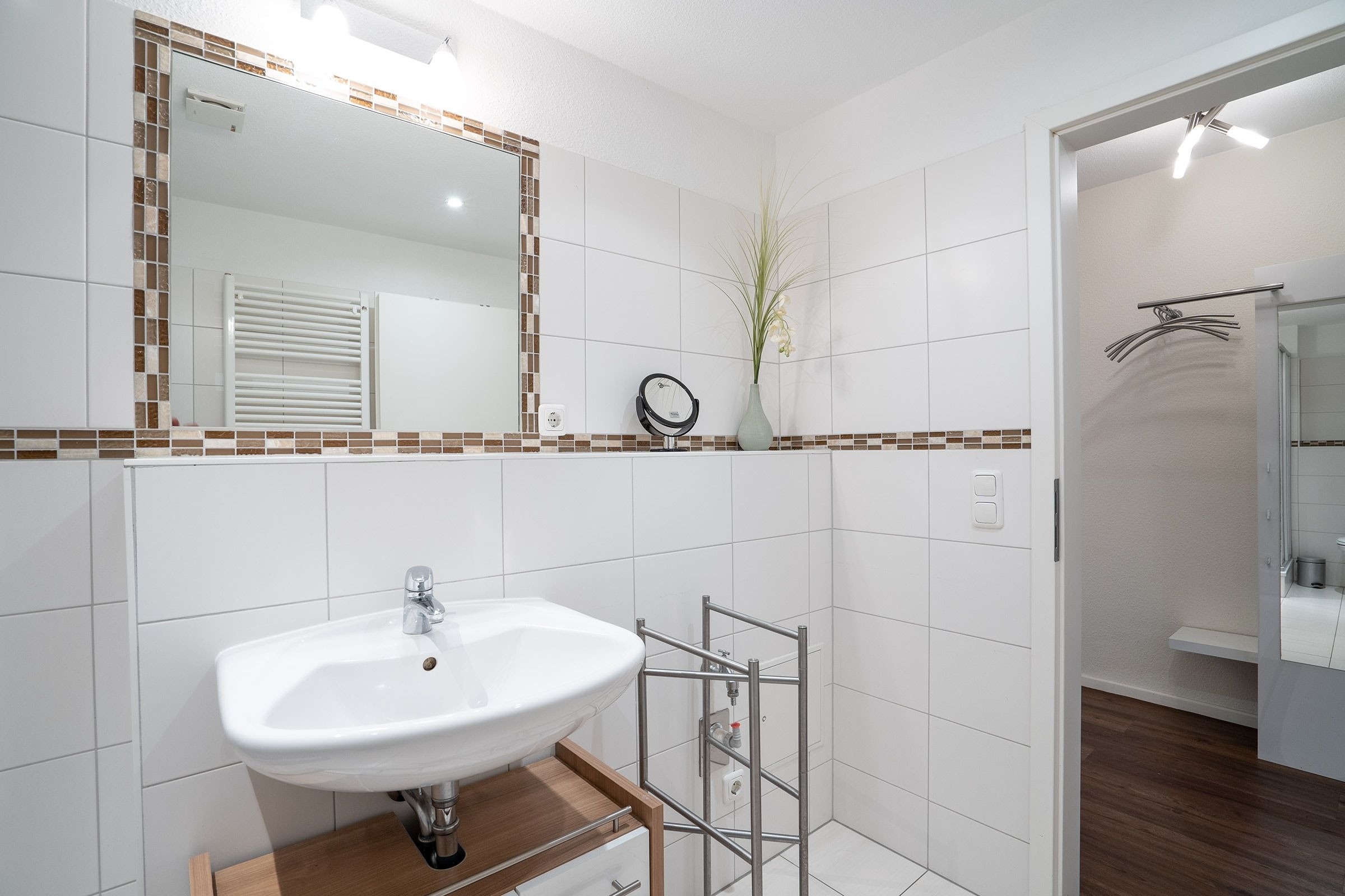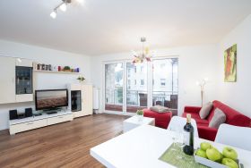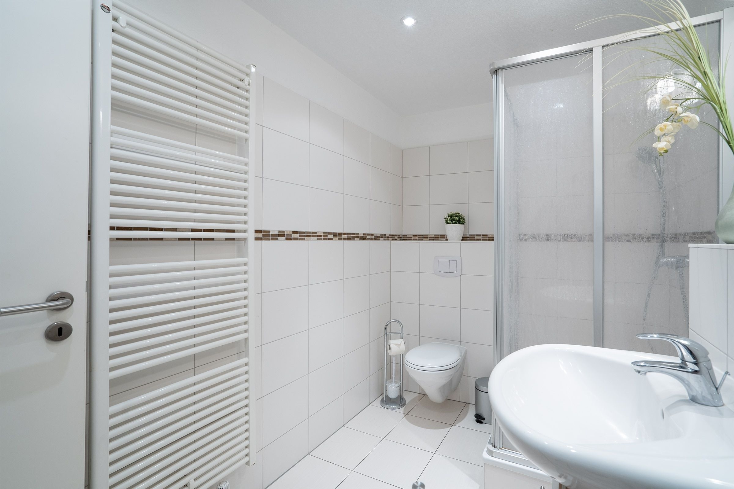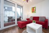 Ein Doppelbett (2x90x200 cm) mit Nachttischränkchen, ein Kleiderschrank, eine Kommode und ein Flat-Screen TV gehören zur Ausstattung. Verdunklungsplissees an allen Fenstern - der perfekte Licht-, Sicht,-.und Sonnenschutz. Das Wohnzimmer mit offener Küche mit einer Sitzgelegenheit lässt keine Wünsche offen. Wenn Sie gerne kochen, wird dies in der komplett ausgestatteten Küche zum Kinderspiel. Die Couch lässt sich zu einer Schlafgelegenheit (140x200 cm) verwandeln. Ein zweiter Flat-Screen TV sorgt am Abend für gemütliche Stunden. Vom Wohnzimmer aus gelangen Sie auf den überdachten Balkon. Der erste Kaffee am Morgen, die Tageszeitung in der Hand... Kann ein Morgen besser beginnen? Das moderne Duschbad mit Handtuchwärmer, Föhn und WC rundet den Anspruch dieser Ferienwohnung ab. Eine Waschmaschine und Trockner können gegen Gebühr im Keller des Hauses mitgenutzt werden. Die Internetnutzung ist über W-LAN kostenlos möglich.
