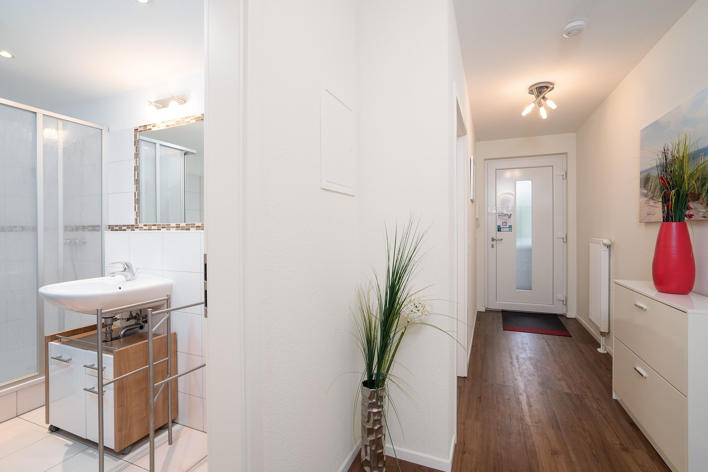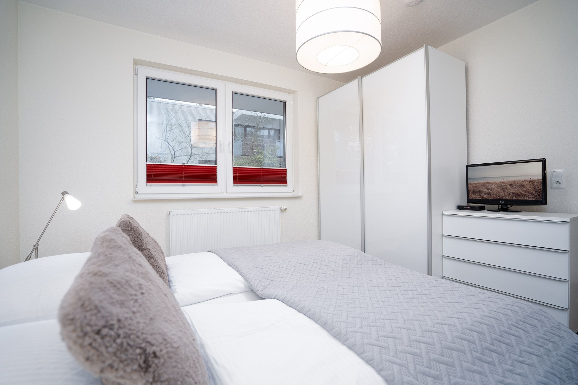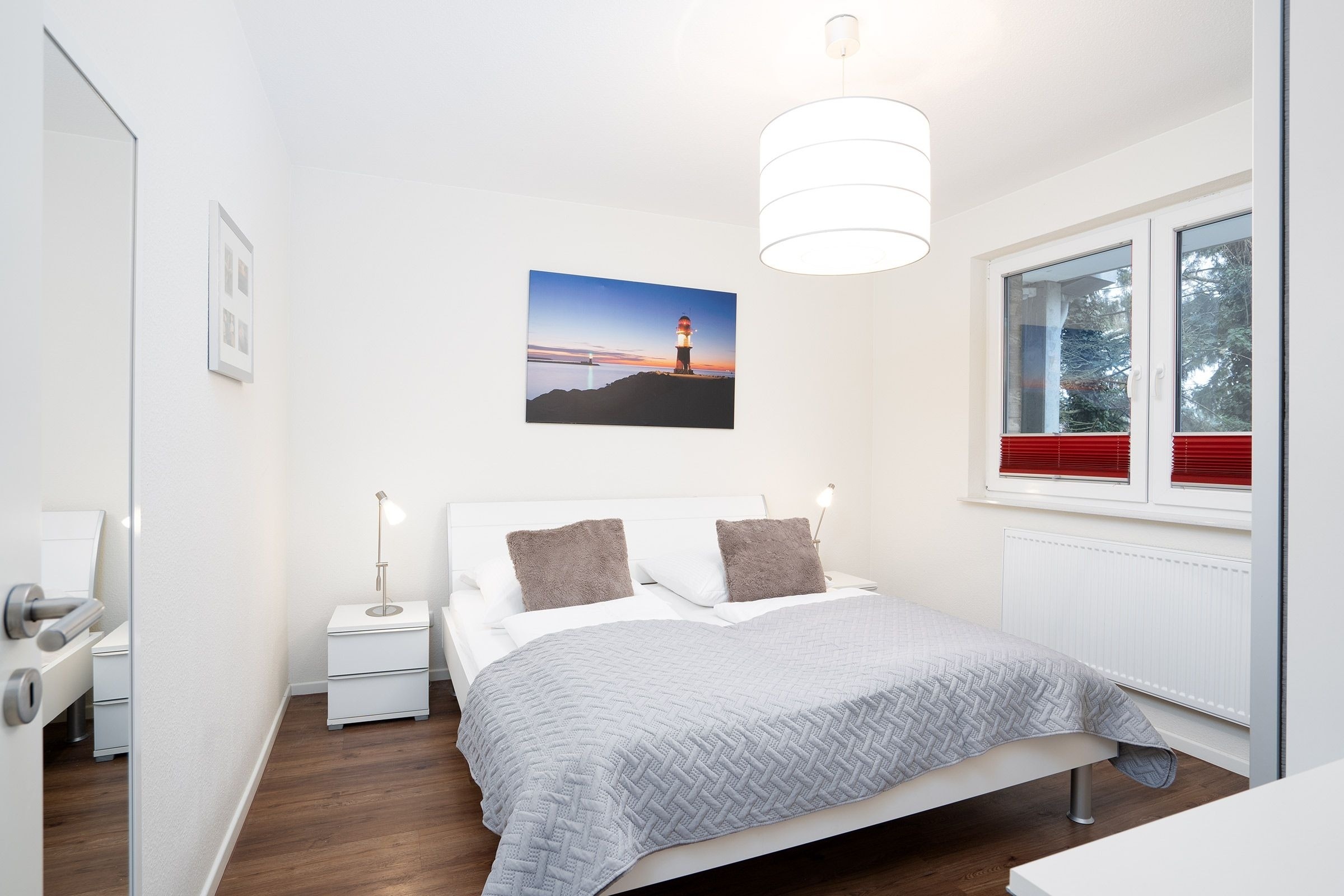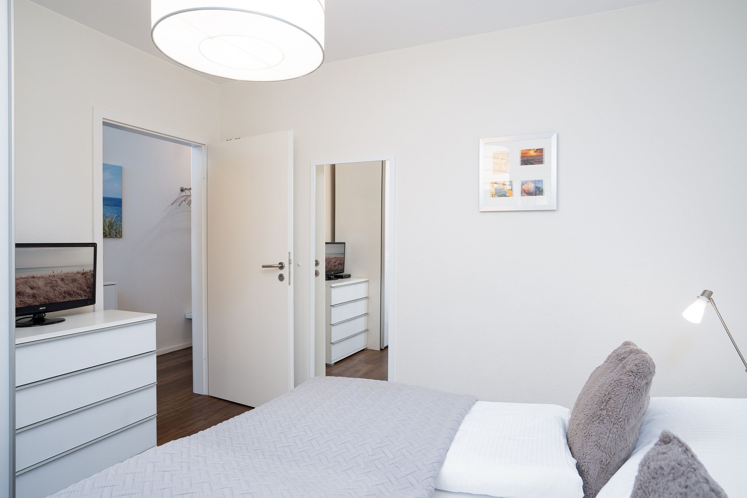 Von der Tiefgarage kommen Sie bequem mit dem Fahrstuhl in die 1. Etage. Ein geräumiger Flur empfängt Sie. Hängen Sie Ihre Jacken auf – und kommen Sie an. Das modern eingerichtete Schlafzimmer Ihres Ferienobjekts (ca. 54 qm) erreichen Sie vom Flur.