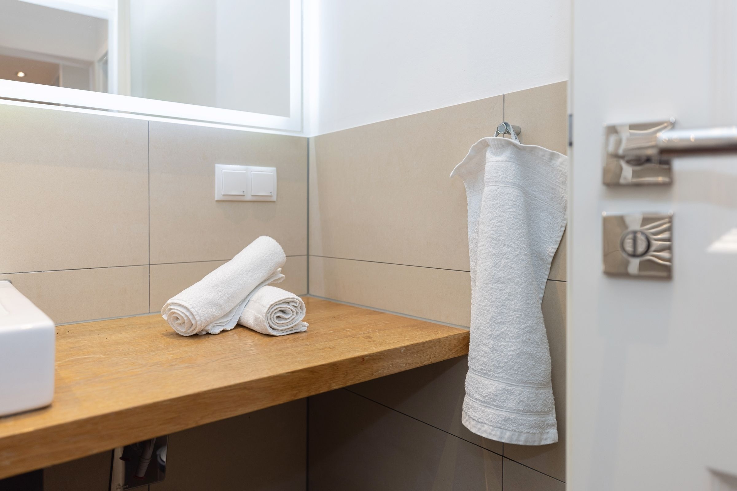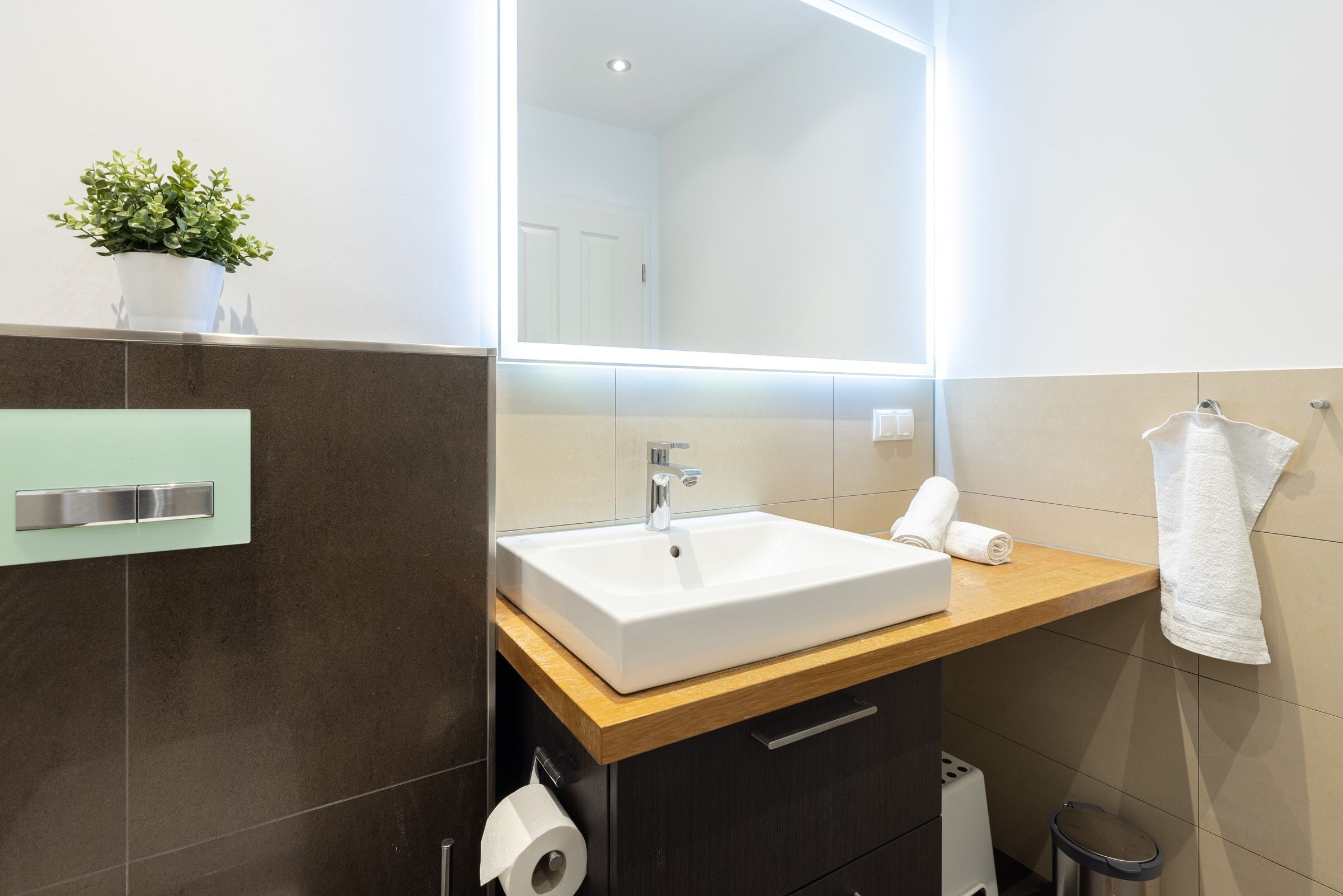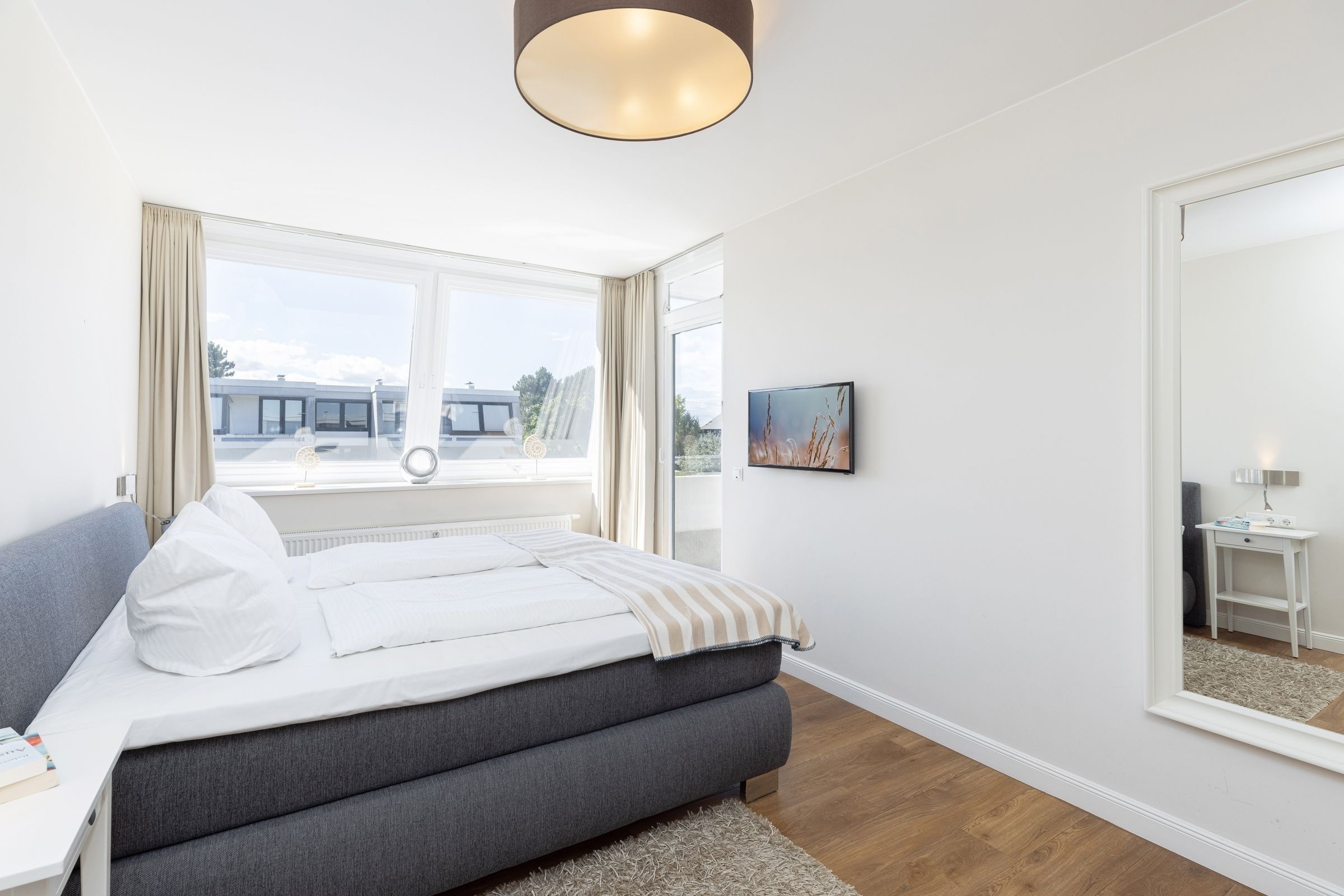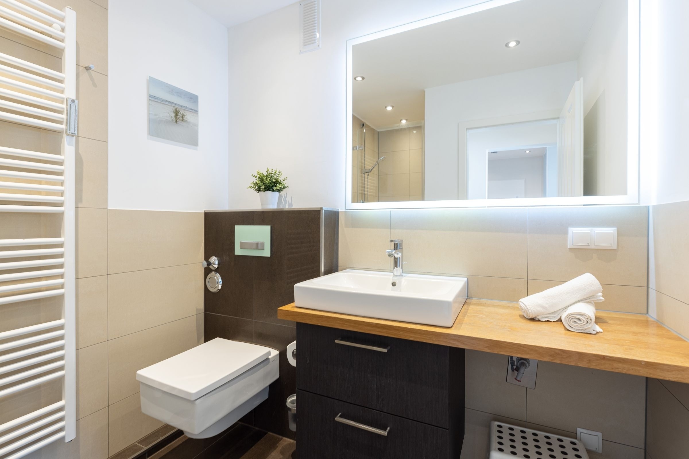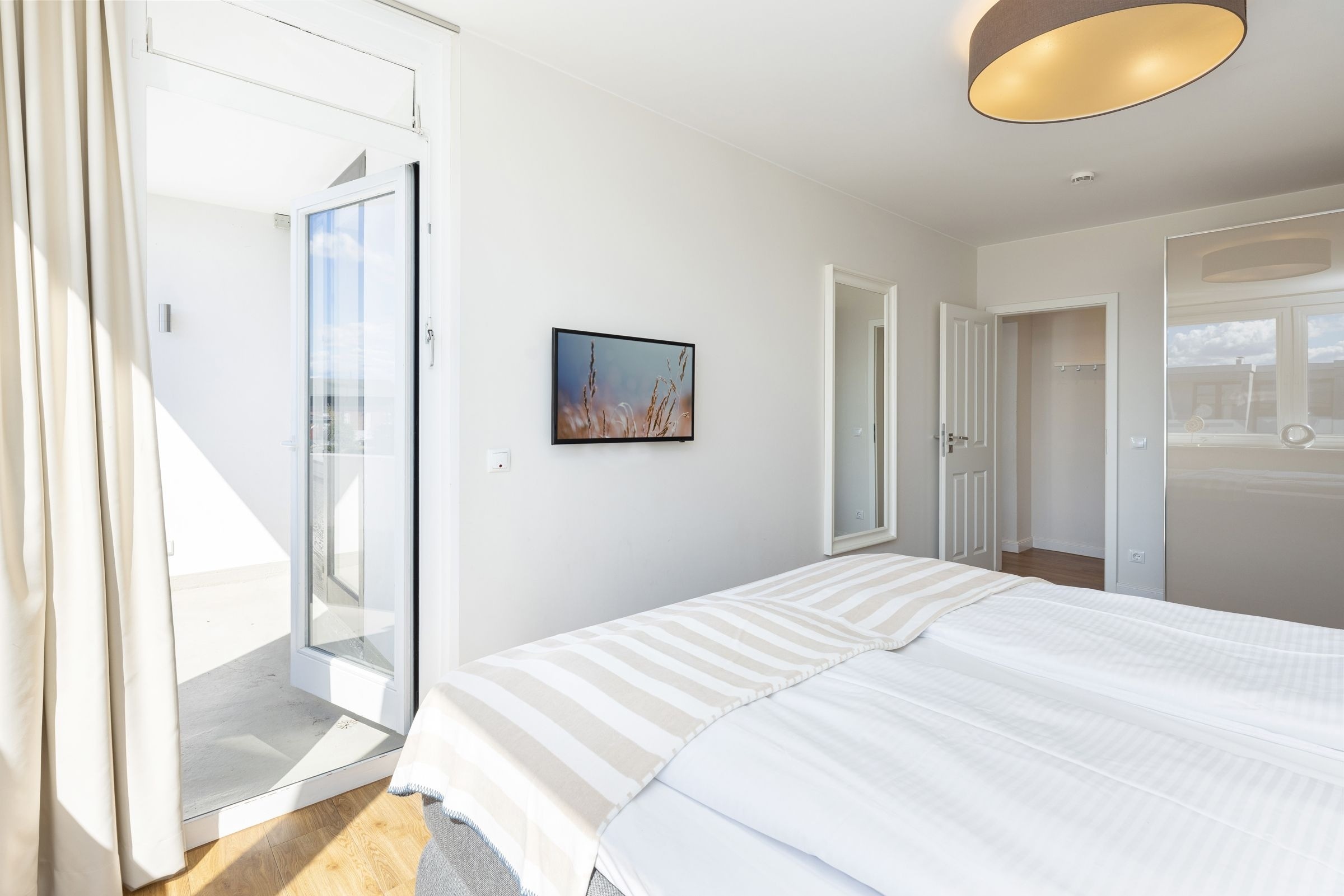 Das schicke Appartement glänzt mit einem stilvollen Wohnbereich und offener Küche. Die Kombination aus Holz, Stein und Hochglanz lässt die Wohnung edel und warm wirken. Die gemütliche Wohnlandschaft verleitet zu kuscheligen Kinoabenden - hierfür steht ein Flat-TV mit Blu-Ray-Player bereit, natürlich können Sie das kostenlose WLAN nutzen. Das Sofa lässt sich für eine 5. Person in einen Schlafplatz (140x200 cm) verwandeln. In dieser Wohnung gibt es gleich 2 möblierte Balkone, auf denen Sie es sich gut gehen lassen und die Sonne genießen können. Am gemütlichen Esstisch können Sie sich die regionalen Köstlichkeiten schmecken lassen, die sich mühelos in der voll ausgestatteten Küche zubereiten lassen. Das moderne Design und die hochwertige Ausstattung lassen keine Wünsche offen. In den beiden Schlafzimmern mit großen Boxspringbetten (160/180x200 cm) werden Sie sich wohlfühlen und traumhafte Nächte verbringen. Für genügend Stauraum für die mitgebrachte Urlaubsgarderobe ist mit 2 großen Kleiderschränken ebenfalls gesorgt. In einem Schlafzimmer unterhält Sie bei Bedarf ein 2.TV-Gerät. Das moderne Duschbad hat eine bodentiefe Regenwalddusche sowie einen Handtuchtrockner und einen Föhn.