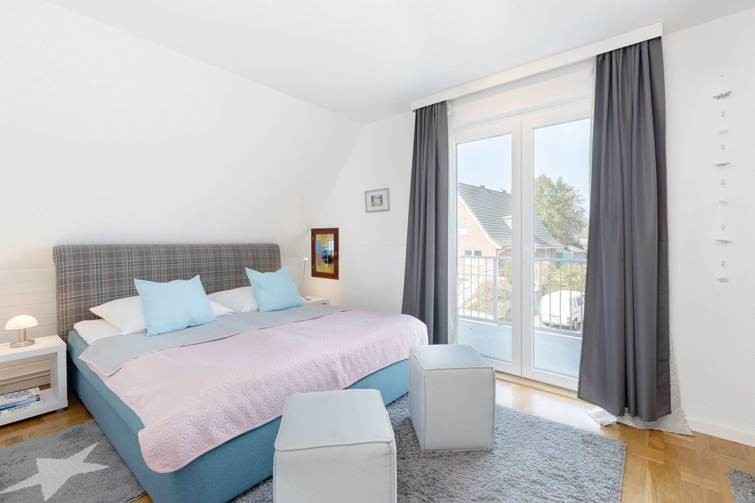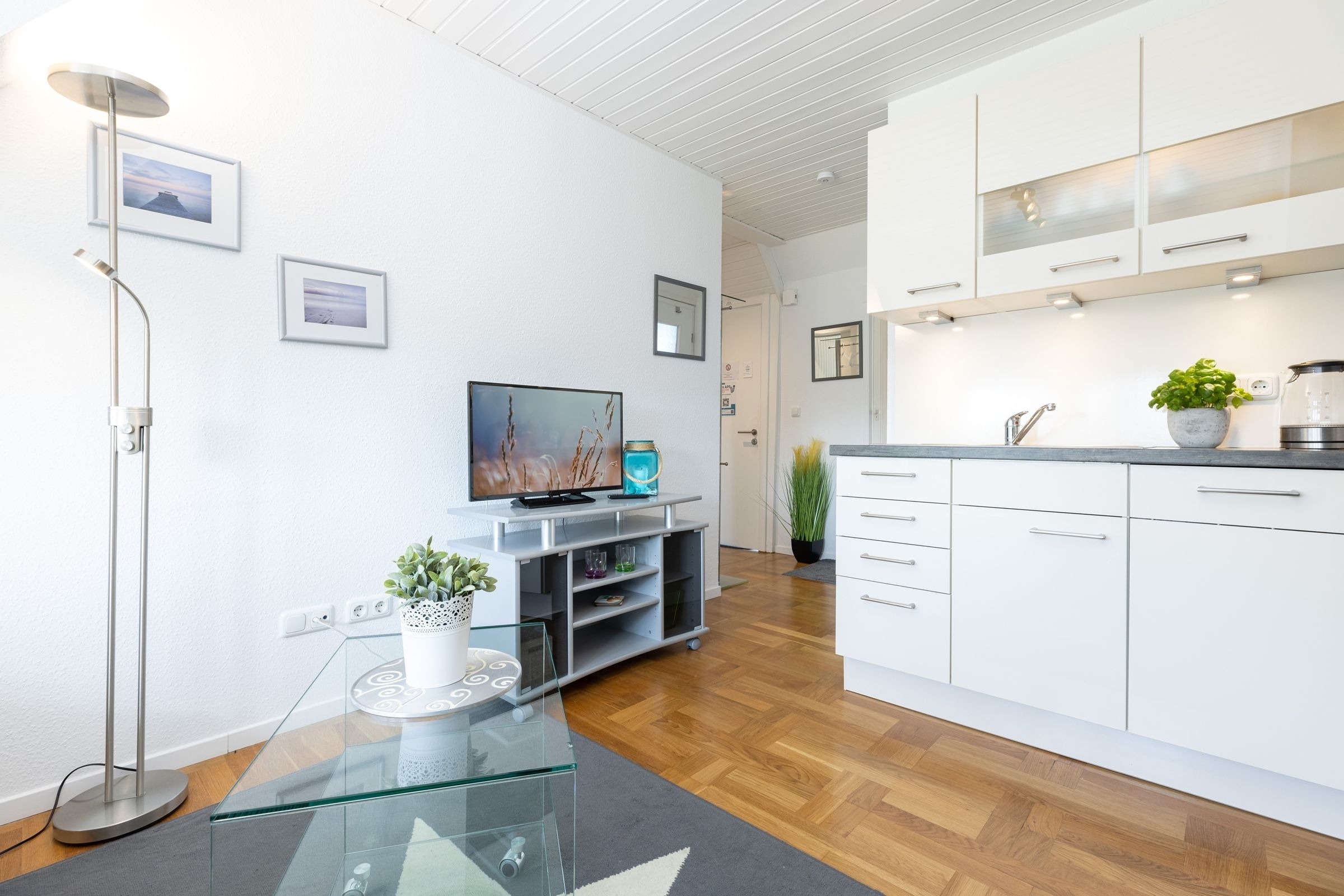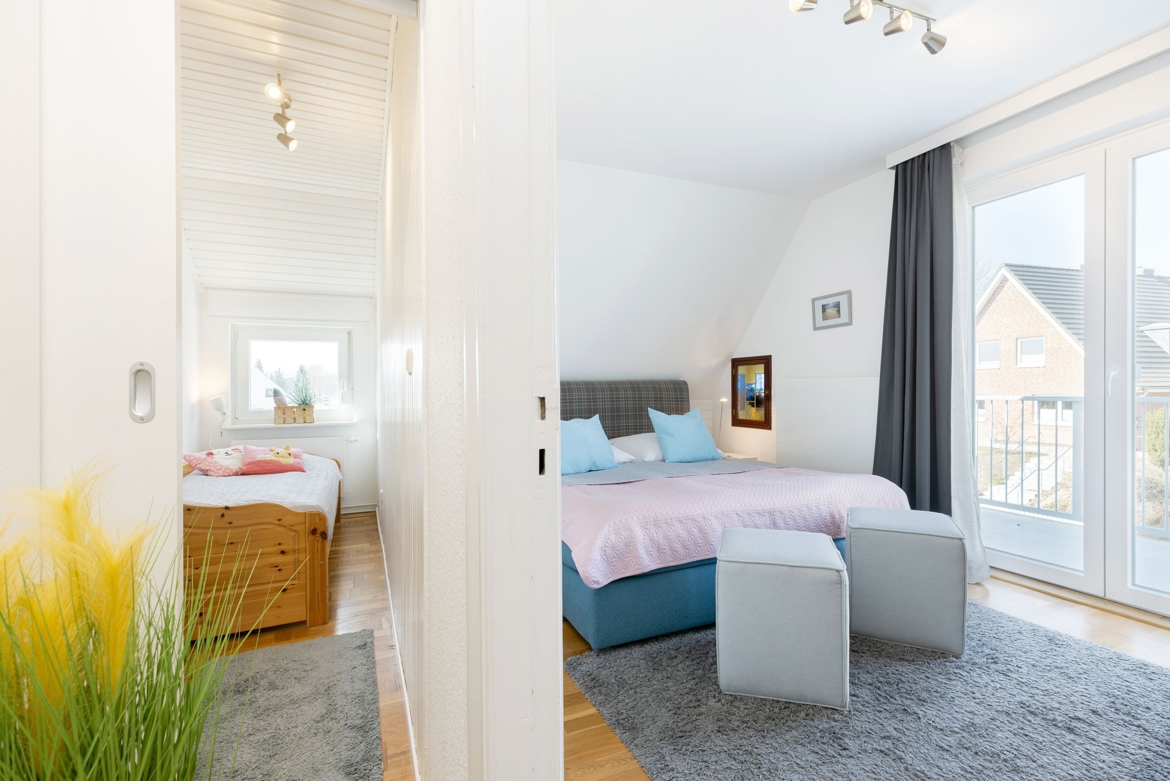 Ausgestattet mit 2 separaten Schlafzimmern, davon 1 Schlafzimmer mit gemütlichem und rückenfreundlichem Boxspring-Doppelbett (2x 90x200 cm, durchgehender Topper) und einem Kinderbett sowie TV und DVD-Player und 1 Schlafzimmer mit einem Einzelbett (90x200 cm). Von hier gelangen Sie durch den Flur in das Wohnzimmer mit TV, DVD-Player, Esstisch für 4 Personen und voll ausgestatteter offener Küche und in das moderne, hell geflieste Duschbad.