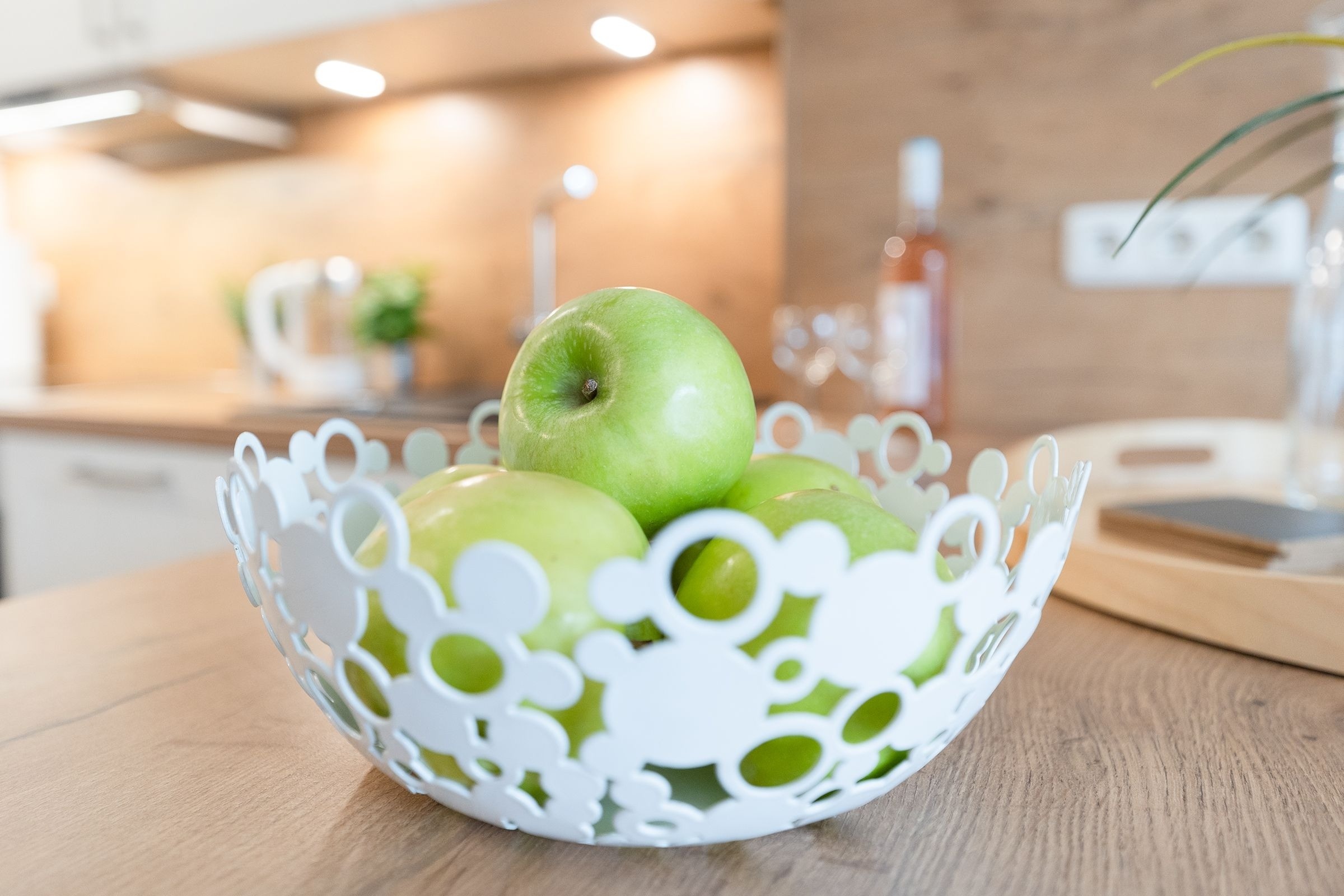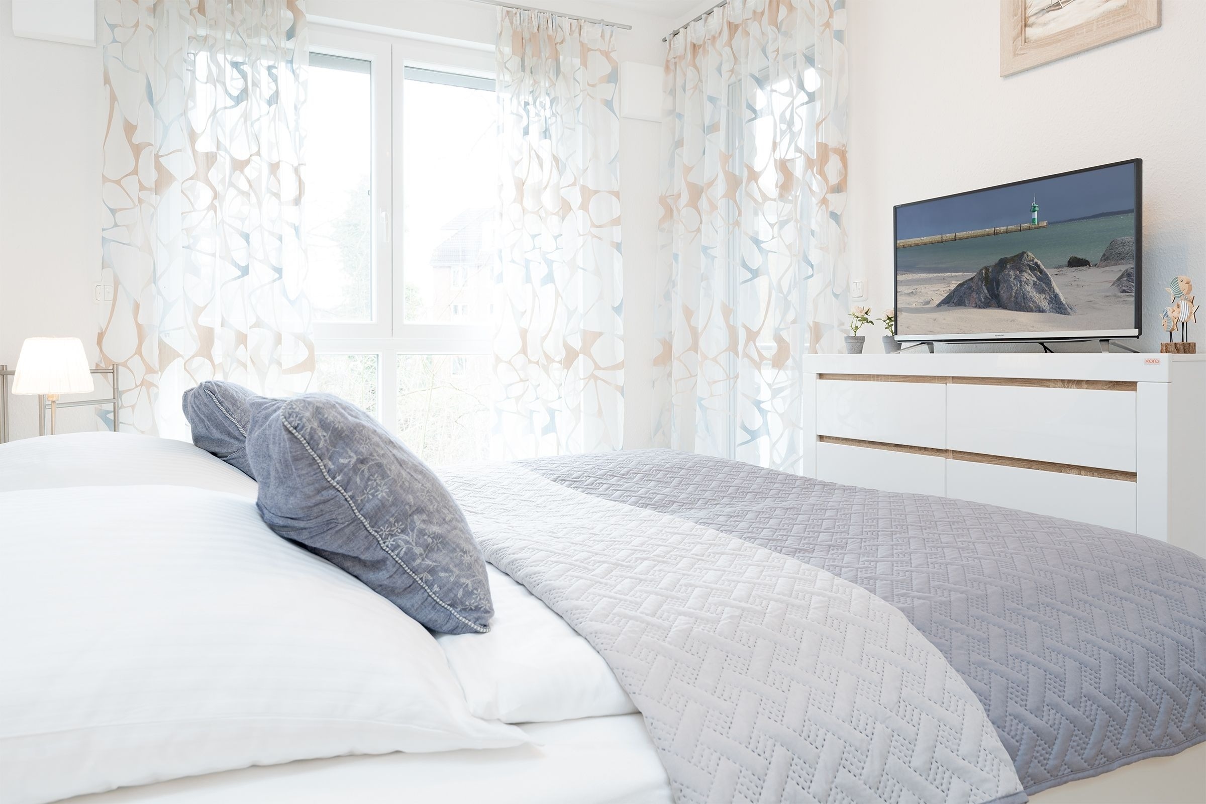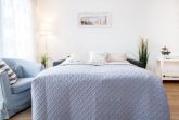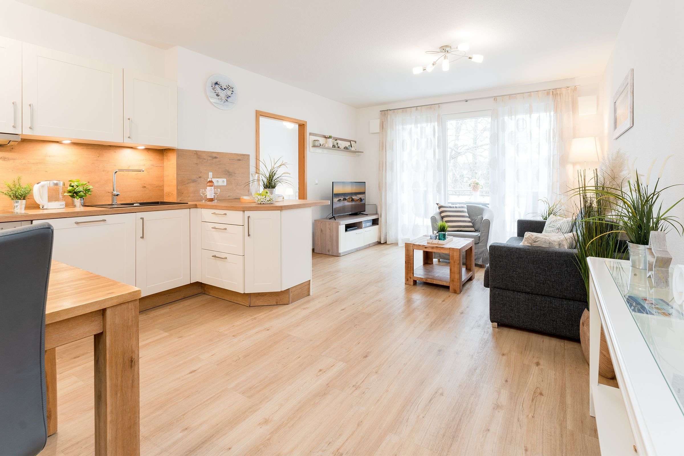 Im hell eingerichteten Schlafzimmer mit Doppelbett (2x90x200cm), großem Schiebetürenschrank und Flat-TV werden Sie traumhaft schlafen. Neben dem Bett kann ein Kindereisebett aufgestellt werden. Daneben das Wohnzimmer mit offener Küche und Essplatz ist harmonisch aufeinander abgestimmt und mit liebevollen Details dekoriert. Die Couch lässt sich mühelos zu einer Schlafgelegenheit (160x200cm) verwandeln. Ein überdachter Balkon mit Blick ins Grüne können Sie vom Wohn- und Schlafzimmer aus betreten, hier lässt es sich wunderbar aushalten bei angenehmen Temperaturen. Elektrische Außenrolladen sind bei beiden Zimmern angebracht. Ob Sie nur Frühstück zubereiten oder kochen möchten wie zu Hause, hier wird es Ihnen an nichts fehlen, die Küche ist mit Allem ausgestattet. Im kleinen Abstellraum vom Flur aus steht Ihnen sogar eine Waschmaschine für die Wäsche zwischendurch zur Verfügung. Daneben ist gleich das moderne Duschbad mit ebenerdiger Dusche, Fußbodenheizung, Handtuchwärmer, WC und Föhn. WLAN sowie ein Babyreisebett und ein Kinderhochstuhl stehen Ihnen kostenfrei zur Verfügung.