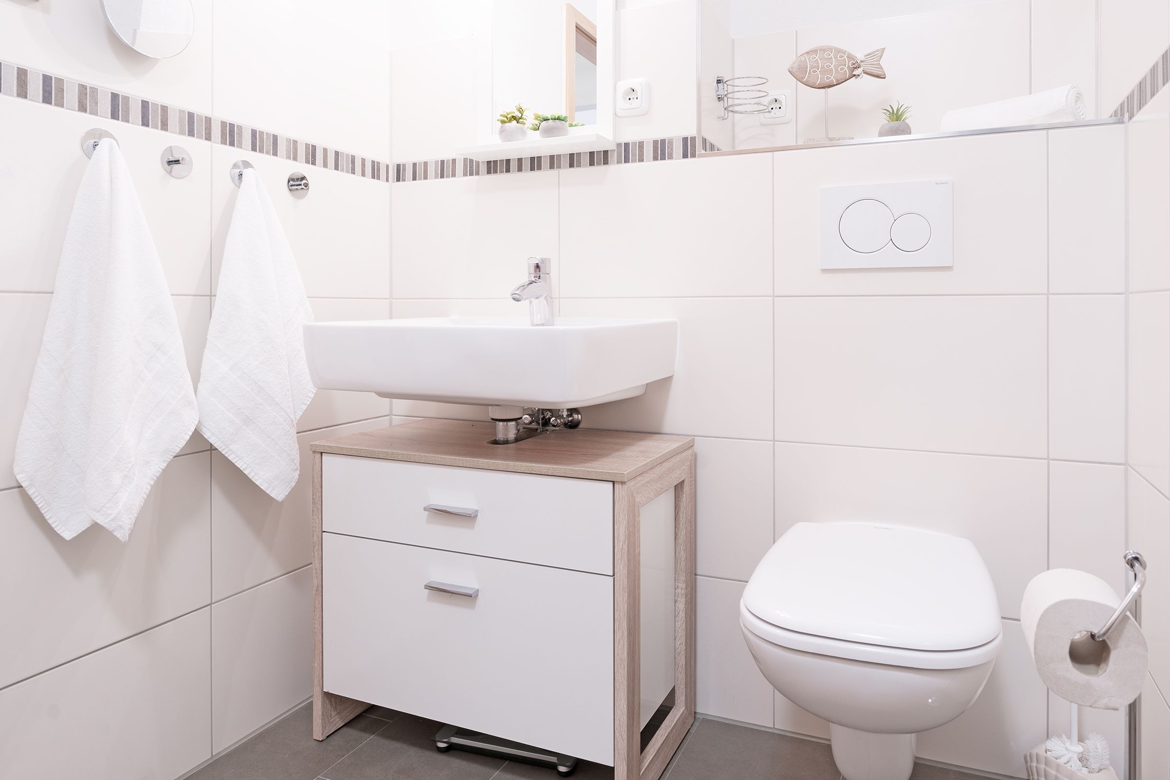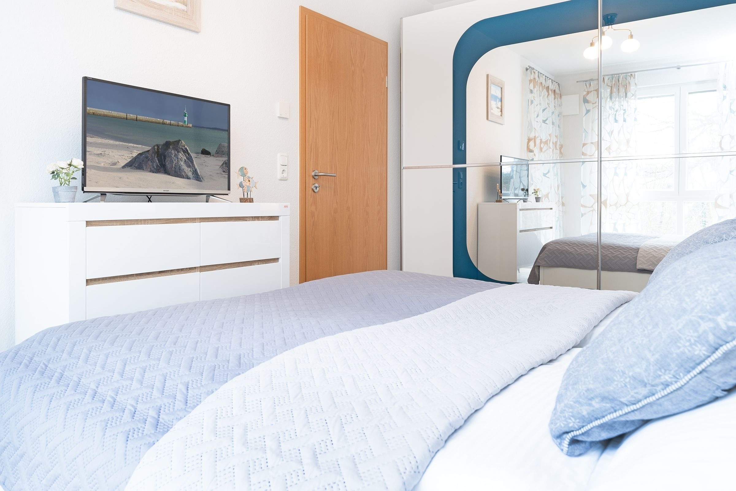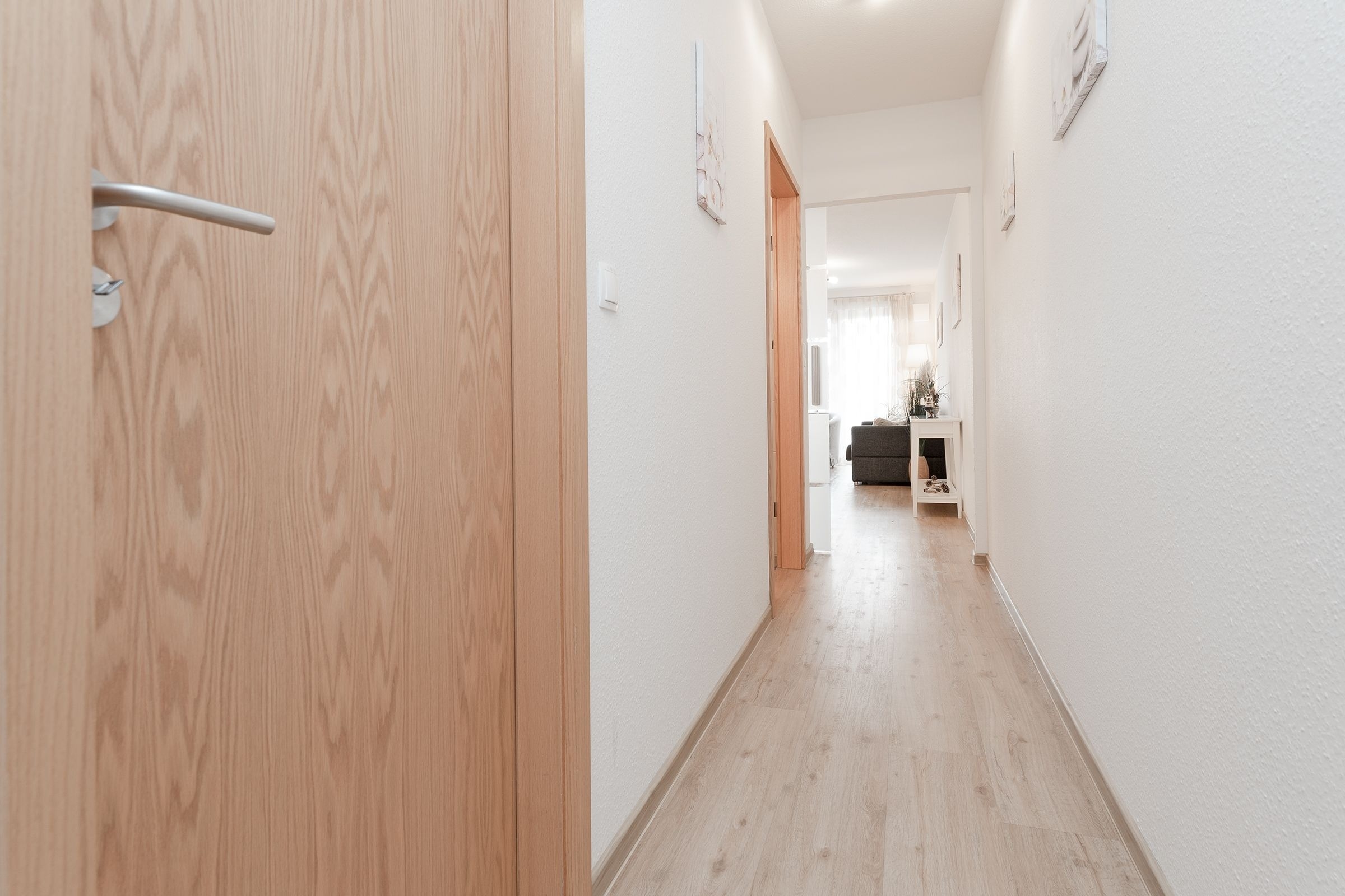 Im Eingangsflur säumen stimmungsvolle Muschelbilder den Weg bis zum Fahrstuhl. In der 1. Etage angekommen – nun sind gleich da in Ihrem Feriendomizil. Empfangen werden Sie von einem großzügigen Flur mit Garderobe. Die Kleinen können schon einmal durchflitzen zum Wohnraum. Herrlich angekommen – ab jetzt ist Urlaub.