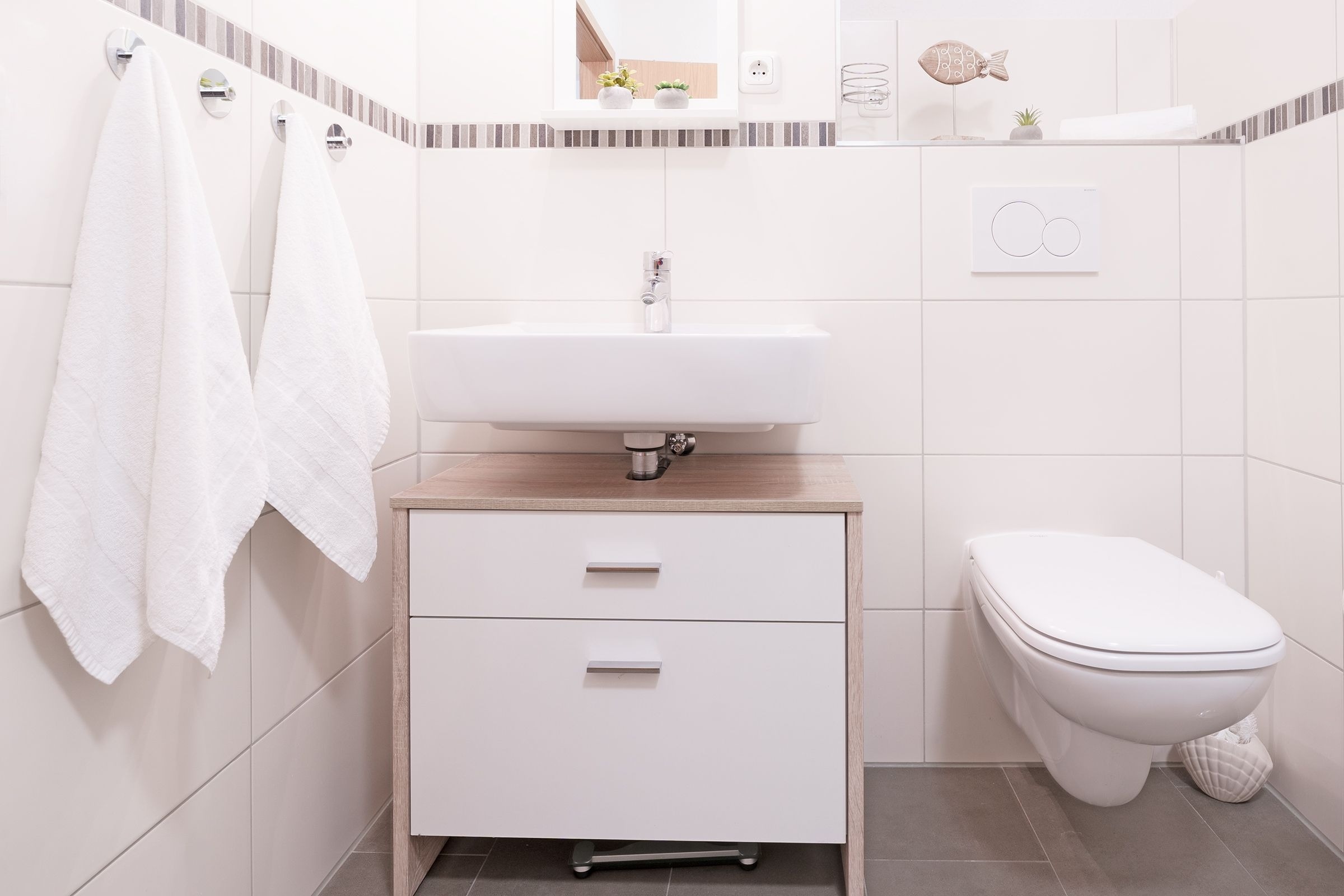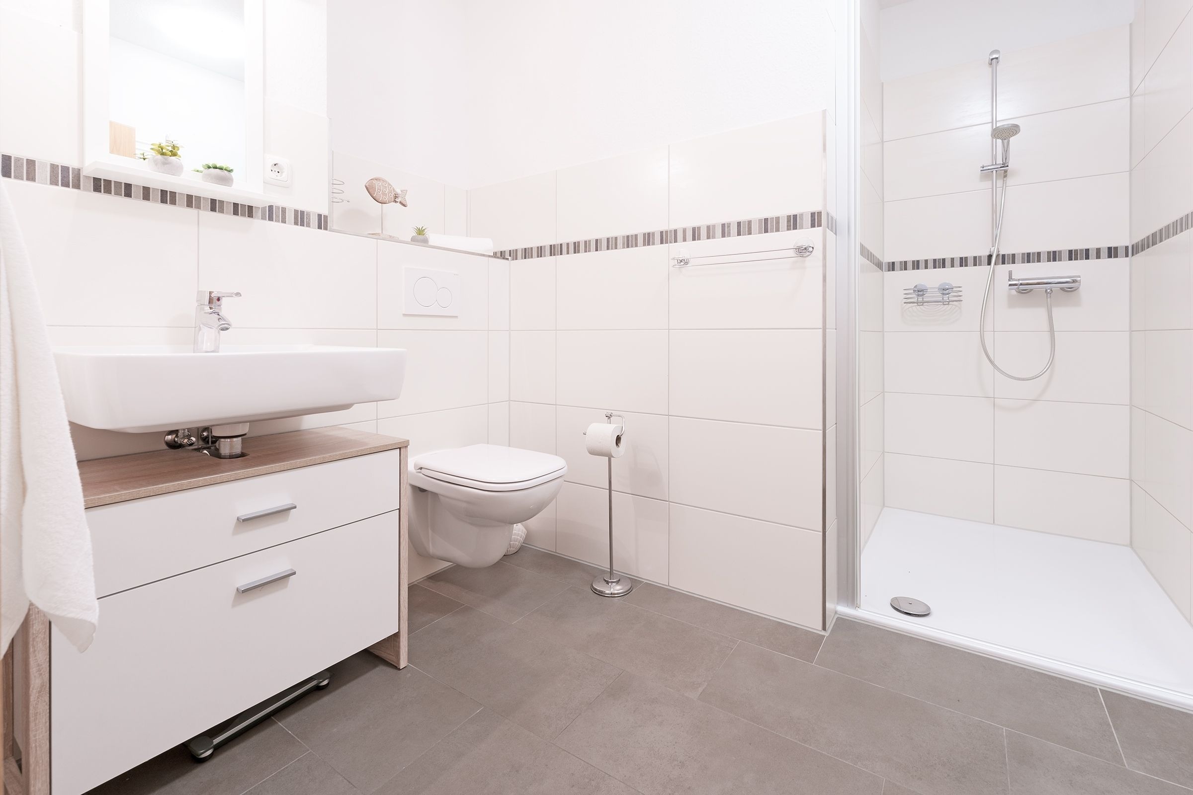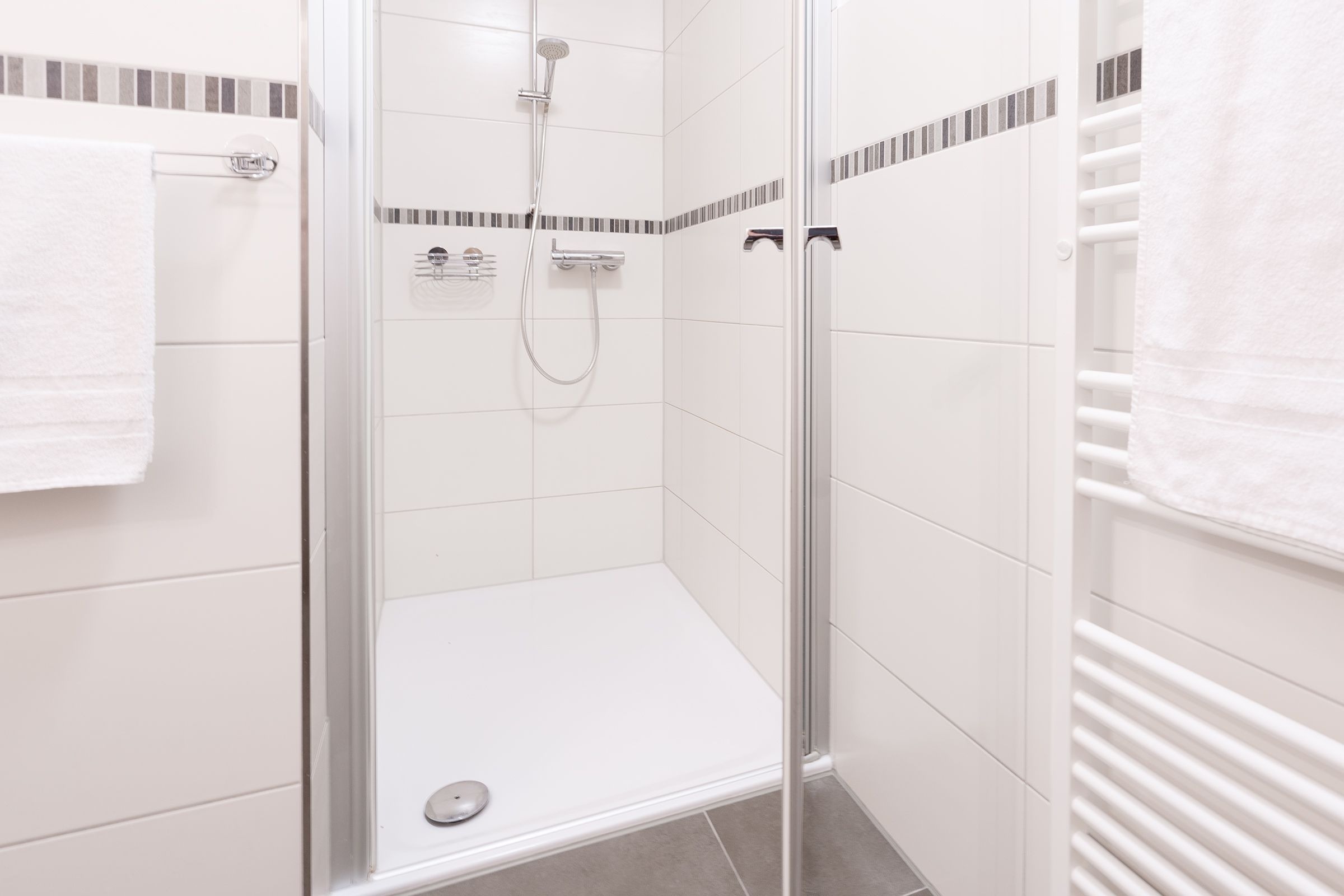 Im Eingangsflur säumen stimmungsvolle Muschelbilder den Weg bis zum Fahrstuhl. In der 1. Etage angekommen – nun sind gleich da in Ihrem Feriendomizil. Empfangen werden Sie von einem großzügigen Flur mit Garderobe. Die Kleinen können schon einmal durchflitzen zum Wohnraum. Herrlich angekommen – ab jetzt ist Urlaub.