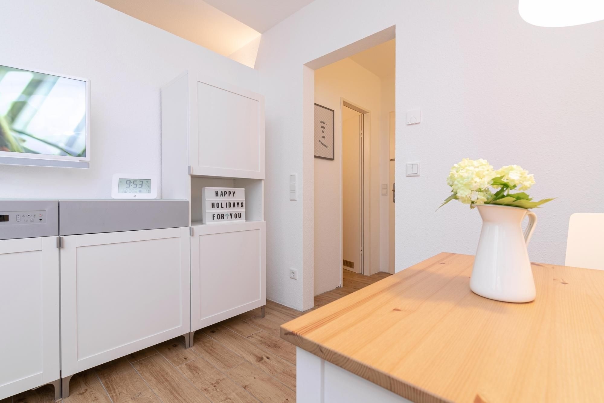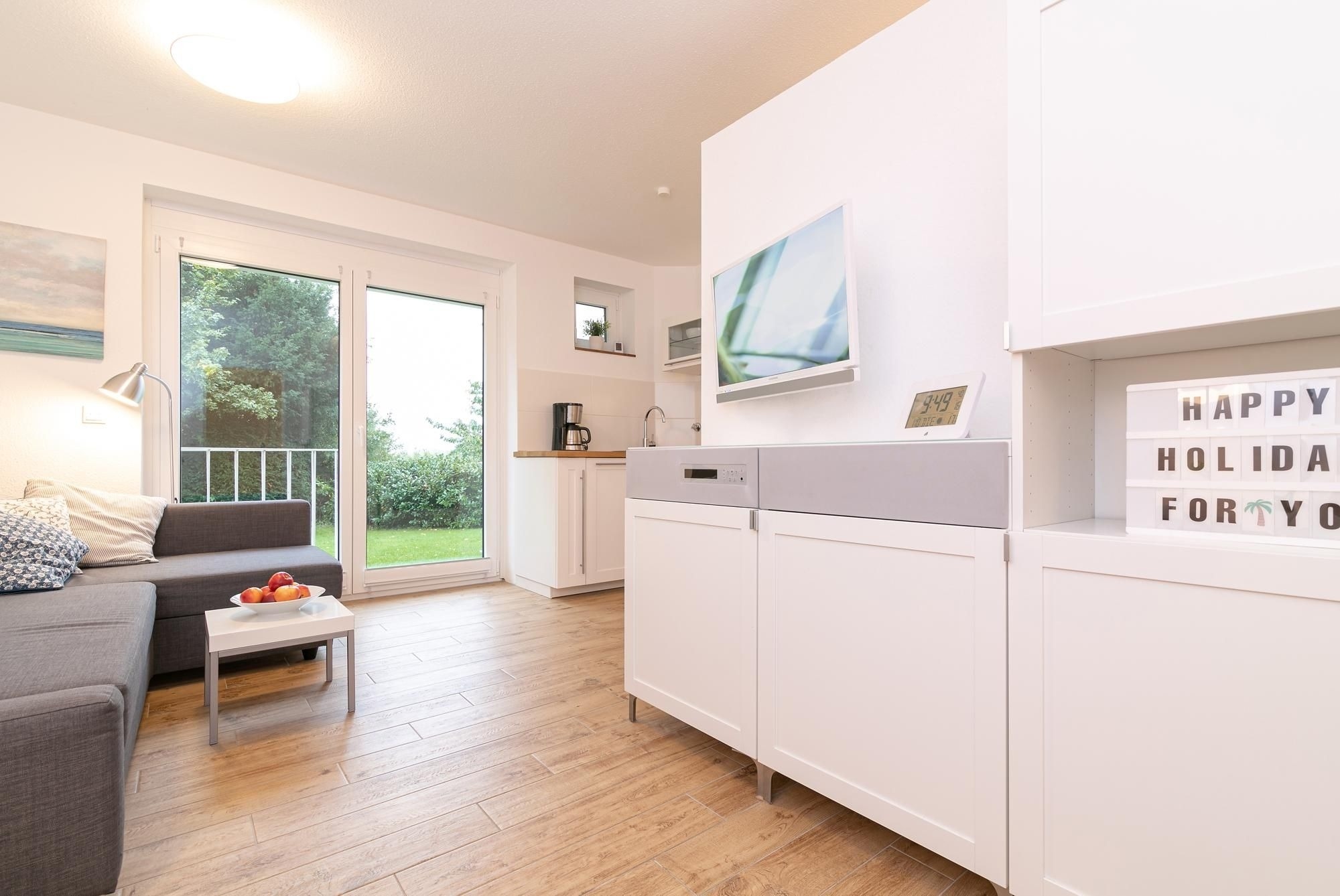 Ankommen, Taschen abgestellt und ausgepackt, Ihre Sachen verstauen Sie bequem in dem Einbauschrank im Flur. Geradezu gelangen Sie in das Herzstück dieser Wohnung. Gut durchdacht, jeder Quadratmeter perfekt genutzt sind hier Wohn-, Schlaf- und eine Kochbereich harmonisch kombiniert. Der Wohnteil mit einem gemütlichen Ecksofa und TV-Ecke, ein Essplatz für 2 Personen, die vollwertig ausgestattete Küchenzeile und abgeteilt der kuschelige Schlafplatz mit Doppelbett, französischer Matratze (140x200 cm) und TV. Das Ecksofa lässt sich mit ein paar Handgriffen zu einer weiteren Schlafgelegenheit für einen Urlaubsgast umwandeln. Ein modernes Duschbad mit WC rundet das Gesamtbild ab. Am Morgen draußen frühstücken oder abends noch ein Glas Wein genießen – einfach die Tür öffnen. Vom Wohnraum aus betreten Sie in den gemeinschaftlich genutzten Garten. Nützlich sind auch die Gemeinschaftswaschmaschine und -trockner im Kellerraum der Wohnanlage (gegen Gebühr).